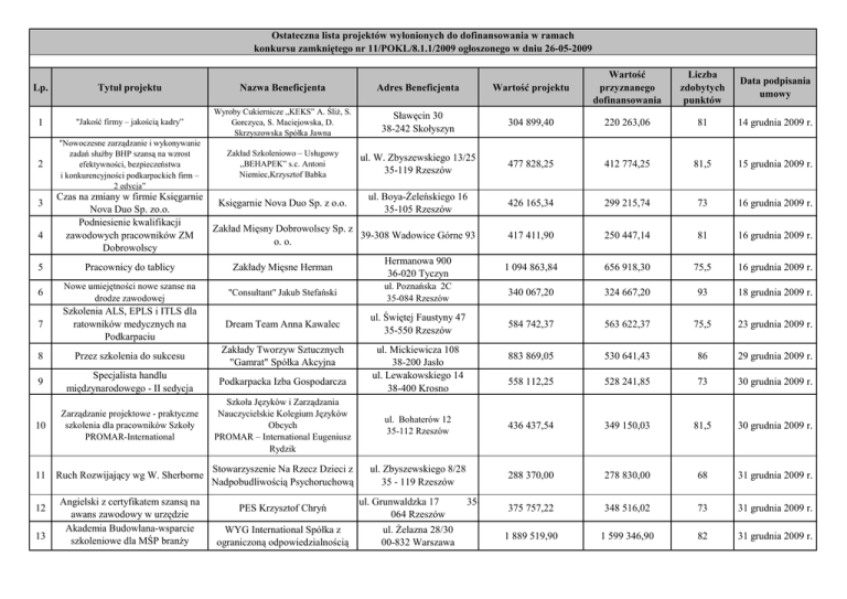 Ostateczna lista projektów wyłonionych do dofinansowania w ramach konkursu zamkniętego nr 11/POKL/8.1.1/2009 ogłoszonego w dniu 26-05-2009 Lp. Tytuł projektu Nazwa Beneficjenta Adres Beneficjenta Wartość projektu Wartość przyznanego dofinansowania Liczba zdobytych punktów Data podpisania umowy 1 "Jakość firmy – jakością kadry” Wyroby Cukiernicze „KEKS” A. Śliż, S. Gorczyca, S. Maciejowska, D. Skrzyszowska Spółka Jawna Sławęcin 30 38-242 Skołyszyn 304 899,40 220 263,06 81 14 grudnia 2009 r. 2 "Nowoczesne zarządzanie i wykonywanie zadań służby BHP szansą na wzrost efektywności, bezpieczeństwa i konkurencyjności podkarpackich firm – 2 edycja” Zakład Szkoleniowo – Usługowy „BEHAPEK” s.c. Antoni Niemiec,Krzysztof Babka ul. W. Zbyszewskiego 13/25 35-119 Rzeszów 477 828,25 412 774,25 81,5 15 grudnia 2009 r. 426 165,34 299 215,74 73 16 grudnia 2009 r. 417 411,90 250 447,14 81 16 grudnia 2009 r. 1 094 863,84 656 918,30 75,5 16 grudnia 2009 r. 3 4 5 Czas na zmiany w firmie Księgarnie ul. Boya-Żeleńskiego 16 Księgarnie Nova Duo Sp. z o.o. Nova Duo Sp. zo.o. 35-105 Rzeszów Podniesienie kwalifikacji Zakład Mięsny Dobrowolscy Sp. z zawodowych pracowników ZM 39-308 Wadowice Górne 93 o. o. Dobrowolscy Hermanowa 900 Pracownicy do tablicy Zakłady Mięsne Herman 36-020 Tyczyn 6 Nowe umiejętności nowe szanse na drodze zawodowej "Consultant" Jakub Stefański ul. Poznańska 2C 35-084 Rzeszów 340 067,20 324 667,20 93 18 grudnia 2009 r. 7 Szkolenia ALS, EPLS i ITLS dla ratowników medycznych na Podkarpaciu Dream Team Anna Kawalec ul. Świętej Faustyny 47 35-550 Rzeszów 584 742,37 563 622,37 75,5 23 grudnia 2009 r. 8 Przez szkolenia do sukcesu Zakłady Tworzyw Sztucznych "Gamrat" Spółka Akcyjna 883 869,05 530 641,43 86 29 grudnia 2009 r. 9 Specjalista handlu międzynarodowego - II sedycja Podkarpacka Izba Gospodarcza 558 112,25 528 241,85 73 30 grudnia 2009 r. 10 Zarządzanie projektowe - praktyczne szkolenia dla pracowników Szkoły PROMAR-International Szkoła Języków i Zarządzania Nauczycielskie Kolegium Języków Obcych PROMAR – International Eugeniusz Rydzik ul. Bohaterów 12 35-112 Rzeszów 436 437,54 349 150,03 81,5 30 grudnia 2009 r. 11 Ruch Rozwijający wg W. Sherborne Stowarzyszenie Na Rzecz Dzieci z Nadpobudliwością Psychoruchową ul. Zbyszewskiego 8/28 35 - 119 Rzeszów 288 370,00 278 830,00 68 31 grudnia 2009 r. 375 757,22 348 516,02 73 31 grudnia 2009 r. 1 889 519,90 1 599 346,90 82 31 grudnia 2009 r. 12 13 Angielski z certyfikatem szansą na awans zawodowy w urzędzie Akademia Budowlana-wsparcie szkoleniowe dla MŚP branży budowlanej PES Krzysztof Chryń WYG International Spółka z ograniczoną odpowiedzialnością ul. Mickiewicza 108 38-200 Jasło ul. Lewakowskiego 14 38-400 Krosno ul. Grunwaldzka 17 064 Rzeszów ul. Żelazna 28/30 00-832 Warszawa 35- 14 Nowe umiejętności kluczem do podniesienia petencjału adaptacyjnego firmy - szkolenia kadry kierowniczej PZL Mielec Polskie Zakłady Lotnicze Sp. z o. o. ul. Wojska Polskiego 3 39-300 Mielec 1 185 173,81 711 104,29 71 22 lutego 2010 r. 15 Wyższe umiejętności szansą na lepszą pracę Biuro Obsługi Inicjatyw Europejskich Spółka z ograniczoną odpowiedzialnością ul. Piotrkowska 99 90-425 Łódź 1 133 080,00 1 089 880,00 89 24 lutego 2010 r. 16 WSPÓŁPRACA INSPIRUJE DO ROZWOJU - Zostań specjalistą ds. współpracy międzynarodowej Rzeszowska Agencja Rozwoju Regionalnego S. A. w Rzeszowie ul. Szopena 51 35-959 Rzeszów 677 950,00 631 582,00 82,5 1 marca 2010 r. Poznanie nowoczesnych programów graficznych i aplikacji biurowych szansą 17 Quatro Computers Maciej Zachara na zwiększenie swojej atrakcyjności zawodowej ul. Matejki 2 35-062 Rzeszów 967 945,00 937 745,00 76,5 1 marca 2010 r. ul. Rymanowska 3 35-083 Rzeszów 2 152 293,72 1 991 104,82 80,5 9 marca 2010 r. 464 680,48 279 208,29 88,5 9 marca 2010 r. 1 107 208,19 1 026 081,14 72 9 marca 2010 r. 2 576 532,46 2 172 080,00 73,5 22 kwietnia 2010 r. 18 342 907,92 15 201 419,83 „Nauka, wiedza – Lepsze jutro. Program szkoleń kwalifikacyjnych 18 dla pielęgniarek z województwa podkarpackiego” „Rozwój zawodowy pracowników 19 naszym priorytetem - II edycja” Centrum Rozwiązań Menedżerskich 20 S.A. 21 Konstruktor kwalifikacji Ośrodek Kształcenia Podyplomowego Pielęgniarek i Położnych Sp. z o.o. BAĆ-POL Spółka Akcyjna Centrum Rozwiązań Menedżerskich S.A. Centrum Rozwoju Społeczno Ekonomicznego ul. Trembeckiego 5 35-234 Rzeszów ul. Jana Pawła 61 b 01-031 Warszawa Sielec 1A 39-120 Sędziszów Młp. Razem Projekt uzyskał dofinansowanie w ramach rezerwy finansowej przeznaczonej na procedurę odwoławczą.