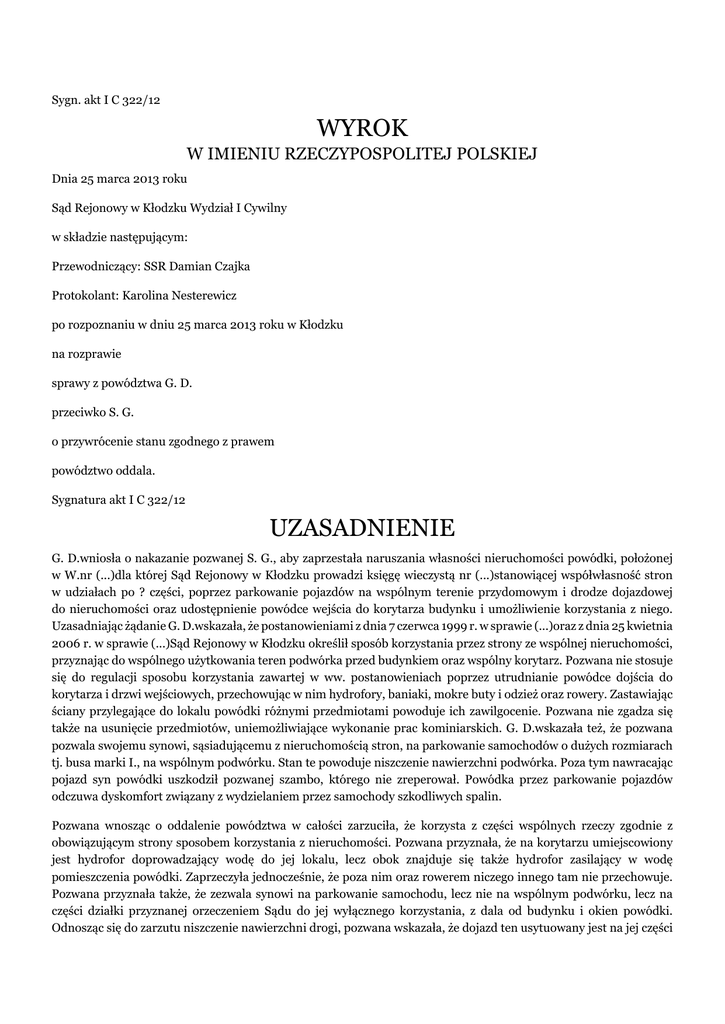 Sygn. akt I C 322/12 WYROK W IMIENIU RZECZYPOSPOLITEJ POLSKIEJ Dnia 25 marca 2013 roku Sąd Rejonowy w Kłodzku Wydział I Cywilny w składzie następującym: Przewodniczący: SSR Damian Czajka Protokolant: Karolina Nesterewicz po rozpoznaniu w dniu 25 marca 2013 roku w Kłodzku na rozprawie sprawy z powództwa G. D. przeciwko S. G. o przywrócenie stanu zgodnego z prawem powództwo oddala. Sygnatura akt I C 322/12 UZASADNIENIE G. D.wniosła o nakazanie pozwanej S. G., aby zaprzestała naruszania własności nieruchomości powódki, położonej w W.nr (...)dla której Sąd Rejonowy w Kłodzku prowadzi księgę wieczystą nr (...)stanowiącej współwłasność stron w udziałach po ? części, poprzez parkowanie pojazdów na wspólnym terenie przydomowym i drodze dojazdowej do nieruchomości oraz udostępnienie powódce wejścia do korytarza budynku i umożliwienie korzystania z niego. Uzasadniając żądanie G. D.wskazała, że postanowieniami z dnia 7 czerwca 1999 r. w sprawie (...)oraz z dnia 25 kwietnia 2006 r. w sprawie (...)Sąd Rejonowy w Kłodzku określił sposób korzystania przez strony ze wspólnej nieruchomości, przyznając do wspólnego użytkowania teren podwórka przed budynkiem oraz wspólny korytarz. Pozwana nie stosuje się do regulacji sposobu korzystania zawartej w ww. postanowieniach poprzez utrudnianie powódce dojścia do korytarza i drzwi wejściowych, przechowując w nim hydrofory, baniaki, mokre buty i odzież oraz rowery. Zastawiając ściany przylegające do lokalu powódki różnymi przedmiotami powoduje ich zawilgocenie. Pozwana nie zgadza się także na usunięcie przedmiotów, uniemożliwiające wykonanie prac kominiarskich. G. D.wskazała też, że pozwana pozwala swojemu synowi, sąsiadującemu z nieruchomością stron, na parkowanie samochodów o dużych rozmiarach tj. busa marki I., na wspólnym podwórku. Stan te powoduje niszczenie nawierzchni podwórka. Poza tym nawracając pojazd syn powódki uszkodził pozwanej szambo, którego nie zreperował. Powódka przez parkowanie pojazdów odczuwa dyskomfort związany z wydzielaniem przez samochody szkodliwych spalin. Pozwana wnosząc o oddalenie powództwa w całości zarzuciła, że korzysta z części wspólnych rzeczy zgodnie z obowiązującym strony sposobem korzystania z nieruchomości. Pozwana przyznała, że na korytarzu umiejscowiony jest hydrofor doprowadzający wodę do jej lokalu, lecz obok znajduje się także hydrofor zasilający w wodę pomieszczenia powódki. Zaprzeczyła jednocześnie, że poza nim oraz rowerem niczego innego tam nie przechowuje. Pozwana przyznała także, że zezwala synowi na parkowanie samochodu, lecz nie na wspólnym podwórku, lecz na części działki przyznanej orzeczeniem Sądu do jej wyłącznego korzystania, z dala od budynku i okien powódki. Odnosząc się do zarzutu niszczenie nawierzchni drogi, pozwana wskazała, że dojazd ten usytuowany jest na jej części działki. Wykonany został jedynie przez pozwaną, na jej koszt. Opisana w uzasadnieniu pozwu kostka brukowa zajmuje zaledwie 9 m2, stąd nie może zostać faktycznie zniszczona przez zaparkowany pojazd. Sąd ustalił: Strony są współwłaścicielami nieruchomości tj. wspólnych części budynku położonego w W.nr (...)oraz działki gruntu nr (...)o pow. 0,12 ha w równych udziałach, związanych z przysługującymi im prawami własności lokali mieszkalnych w tymże budynku. Postanowieniami 7 czerwca 1999 r. w sprawie (...)oraz 25 kwietnia 2006 r. w sprawie (...) Sąd Rejonowy w Kłodzku określił sposób korzystania przez strony ze wspólnej nieruchomości, przyznając do wspólnego użytkowania teren podwórka oznaczony na załączonym szkicu kolorem żółtym, zaś powódce i pozwanej odpowiednio kolorami czerwonym i niebieskim. Sąd orzekł także, że korytarze budynku oraz klatka schodowa przeznaczone sa do wspólnego użytku. Dowód: - postanowienia Sądu Rejonowego w Kłodzku wraz ze szkicem (k.3-4, 6). Pozwana zezwala synowi na parkowanie na wspólnej nieruchomości stron samochodu typu bus, lecz na części działki przyznanej do jej wyłącznego korzystania, stanowiącej wjazd na posesję, z dala od budynku mieszkalnego. Na wspólnym korytarzu, na parterze budynku umiejscowione są hydrofory zasilając w wodę lokale stron. Obecnie mniejszy należący do powódki i dwa, stanowiące jeden mechanizm, należące do pozwanej. Podłączenie lokali stron do ujęcia wody za pośrednictwem hydroforów umieszczonych na korytarzu, nastąpiło w latach 80 -tych ubiegłego wieku. Dowód: - zeznania stron (k.82-83). Sąd zważył: Opisany wyżej stan faktyczny sporu Sąd ustalił w oparciu o przedstawione przez strony dowody w postaci dokumentów potwierdzających łączący je stosunek współwłasności oraz ustalony orzeczeniami sądowymi sposób korzystania z rzeczy wspólnej, jak też okoliczności parkowania samochodu syna pozwanej na przynależnej jej części działki oraz umiejscowienie hydroforów na wspólnym korytarzu, już w latach 80 - tych ubiegłego stulecia.\ Zgodnie z art. 206 k.c. każdy ze współwłaścicieli jest uprawniony do współposiadania rzeczy wspólnej oraz do korzystania z niej w takim zakresie, jaki daje się pogodzić ze współposiadaniem i korzystaniem z rzeczy przez pozostałych współwłaścicieli. Każdemu ze współwłaścicieli przysługuje "uprawnienie" do współposiadania i korzystania z rzeczy wspólnej. Jest on ograniczony jedynie poprzez identyczne uprawnienia pozostałych współwłaścicieli. Ustawodawca nakazuje tu bowiem "pogodzić" wzajemne uprawnienia (i obowiązki) wszystkich współwłaścicieli. Relacje te niekiedy, zwłaszcza w sytuacji niemożności regulacji umownej, przy zawodności w danym przypadku modelu ustawowego, poddane są regułom wynikającym z orzeczenia Sądu, określającego sposób korzystania rzeczy czyli tzw. podział quoad usum. Dokonywany podział oznacza określenie sposobu współposiadania i korzystania z rzeczy wspól