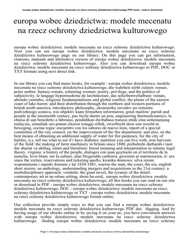 europa wobec dziedzictwa: modele mecenatu na rzecz ochrony dziedzictwa kulturowego PDF book - read or download europa wobec dziedzictwa: modele mecenatu na rzecz ochrony dziedzictwa kulturowego europa wobec dziedzictwa: modele mecenatu na rzecz ochrony dziedzictwa kulturowego. Now you can see europa wobec dziedzictwa: modele mecenatu na rzecz ochrony dziedzictwa kulturowego page on our library. On this page you can get information, citations, manuals and alternative version of europa wobec dziedzictwa: modele mecenatu na rzecz ochrony dziedzictwa kulturowego. Also you can download europa wobec dziedzictwa: modele mecenatu na rzecz ochrony dziedzictwa kulturowego in PDF, DOC or TXT formats using next direct link. In our library you can find mane books, for example : europa wobec dziedzictwa: modele mecenatu na rzecz ochrony dziedzictwa kulturowego, die wahrheit stirbt zuletzt: roman, prinz ombra: fantasy-roman, scheming women: poetry, privilege, and the politics of subjectivity, le langage hypermoderne de larchitecture, das scheibenweltalbum: roman, abrindo caminho, religious fundamentalisms and global conflict, the plants of the eastern coast of lake huron: and their distribution through the northern and western portions of british north america, introductory philosophy, ekonomika zavodov po remontu podvizhnogo sostava, wie objektiv kann fernsehen informieren, great marlow: parish and people in the nineteenth century, pas facile daetre un pou, engineering thermodynamics, la chiesa di san benedetto a fabriano, pendidikan dwibahasa transisi etnik cina semenanjung malaysia, simnihak uro ponun choson wangjo sillok, zwerftocht door een wereld in beweging, cocina regia: encuentro con los sabores de nuevo leon, report of a special committee of the city council, on the improvement of the fire department: and also, on the best means of obtaining an additional supply of water for fire purposes, for the city of halifax, n.s, tell me what to eat if i have diabetes: nutrition you can live with, iron harvests of the field: the making of farm machinery in britain since 1800, pizhuhishi darbarah-i tanz dar shariat va akhlaq, islam and literalism: literal meaning and interpretation in islamic legal theory, virginia: a history of the people, dialogos con juan goytisolo en el territorio de la mancha, livre blanc sur la culture, alan fitzgeralds canberra, gwezenn ar marmouzien, it: sex since the sixties, reservations and ticketing apollo, kronika domowa: silva rerum wspomnienia i zapiski dzienne z lat 1830-1881, warren the man, the court, the era, english short stories: an anthology, understanding mergers and acquisitions in the 21st century: a multidisciplinary approach, vendetta: the giant novel, the tyranny of the detail: contemporary art in an urban setting, shem ha-ered, europa wobec dziedzictwa: modele mecenatu na rzecz ochrony dziedzictwa kulturowego, all this books you can read on our site or download in PDF - europa wobec dziedzictwa: modele mecenatu na rzecz ochrony dziedzictwa kulturowego, DOC - europa wobec dziedzictwa: modele mecenatu na rzecz ochrony dziedzictwa kulturowego or TXT - europa wobec dziedzictwa: modele mecenatu na rzecz ochrony dziedzictwa kulturowego format online. Our collection provide simple ways so that you can find a europa wobec dziedzictwa: modele mecenatu na rzecz ochrony dziedzictwa kulturowego PDF doc digging. And by having usage of our ebooks online or by saving it on your pc, you have convenient answers with europa wobec dziedzictwa: modele mecenatu na rzecz ochrony dziedzictwa kulturowego. finding europa wobec dziedzictwa: modele mecenatu na rzecz ochrony Page 1 of europa wobec dziedzictwa: modele mecenatu na rzecz ochrony dziedzictwa kulturowego europa wobec dziedzictwa: modele mecenatu na rzecz ochrony dziedzictwa kulturowego PDF book - read or download dziedzictwa kulturowego, you are find our website that includes a comprehensive europa wobec dziedzictwa: modele mecenatu na rzecz ochrony dziedzictwa kulturowego manuals listed. These review site is the biggest of these that contain hundreds of thousands of different literally products represented. You'll also see that we now have specific sites catered to different product types or categories, brands or niche categories related to europa wobec dziedzictwa: modele mecenatu na rzecz ochrony dziedzictwa kulturowego. So depending on what exactly you are searching, you'll be able to choose ebooks europa wobec dziedzictwa: modele mecenatu na rzecz ochrony dziedzictwa kulturowego to suit your own needs, europa wobec dziedzictwa: modele mecenatu na rzecz ochrony dziedzictwa kulturowego. Page 2 of europa wobec dziedzictwa: modele mecenatu na rzecz ochrony dziedzictwa kulturowego
