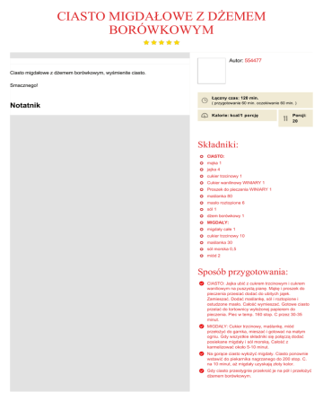 CIASTO MIGDAŁOWE Z DŻEMEM BORÓWKOWYM Autor: 554477 Ciasto migdałowe z dżemem borówkowym, wyśmienite ciasto. Smacznego! Łączny czas: 120 min. Notatnik ( przygotowanie 60 min. oczekiwanie 60 min. ) Kalorie: kcal/1 porcję Porcji: 20 Składniki: CIASTO: mąka 1 jajka 4 cukier trzcinowy 1 Cukier wanilinowy WINIARY 1 Proszek do pieczenia WINIARY 1 maślanka 80 masło roztopione 6 sól 1 dżem borówkowy 1 MIGDAŁY: migdały całe 1 cukier trzcinowy 10 maślanka 30 sól morska 0,5 miód 2 Sposób przygotowania: CIASTO: Jajka ubić z cukrem trzcinowym i cukrem waniliowym na puszystą pianę. Mąkę i proszek do pieczenia przesiać dodać do ubitych jajek. Zamieszać. Dodać maślankę, sól i roztopione i ostudzone masło. Całość wymieszać. Gotowe ciasto przelać do tortownicy wyłożonej papierem do pieczenia. Piec w temp. 160 stop. C przez 3035 minut. MIGDAŁY: Cukier trzcinowy, maślankę, miód przełożyć do garnka, mieszać i gotować na małym ogniu. Gdy wszystkie składniki się połączą dodać posiekane migdały i sól morską. Całość z karmelizować około 510 minut. Na gorące ciasto wyłożyć migdały. Ciasto ponownie wstawić do piekarnika nagrzanego do 200 stop. C. na 10 minut, aż migdały uzyskają złoty kolor. Gdy ciasto przestygnie przekroić je na pół i przełożyć dżemem borówkowym.