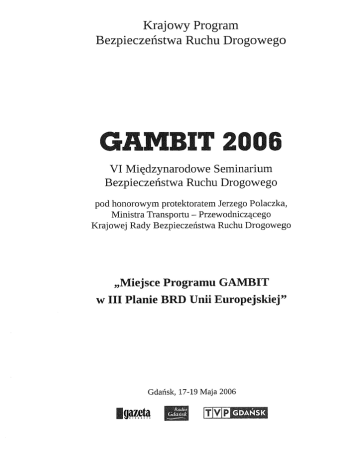 Krajowy Program Bezpieczenstwa Ruchu Drogowego GAMBIT 2006 Miedzynarodowe Seminarium Bezpieczenstwa Ruchu Drogowego VI pod honorowym protektoratem Jerzego Polaczka, Ministra Transportu Przewodniczacego Krajowej Rady Bezpieczenstwa Ruchu Drogowego - „Miejsce Programu w III Planie BRD Unii Europejskiej Gdansk, 17-19 Maja (Jd/eid InaTnfa \ ^"#¥33 MMm GAMBIT 2006 Rrl\/!ni! nnra gdansk 1T |V1PE Spis tresci Ryszard KRYSTEK, Politechnika Gdanska Miejsce programu GAMBIT Frank P. CARDIMEN Jr. Wyzwania dla Projekt III planie BRD Unii 23 Europejskiej Stowarzyszenie Poprawy BRD, USA bezpieczenstwa Antonio AVENOSO, ETSC w drogowego: dzisiaj i jutro ruchu 27 Europejska Rada Bezpieczenstwa Transportu „SEC BELT" oraz program nadzoru: wstepne - ETSC, Belgia wyniki 35 Katalijn RITSEMA VAN ECK, SWOV, Holandia Obserwatorium Rob STOMPHORST, 3VO 3VO pierwsza kampania - Bezpieczenstwa Ruchu Drogowego Holenderskie - Europejskie BRD oparta na Stowarzyszenie BRD rozrywce i multimediach Nicole MUHLRAD, INRETS, UMRESTTE, Nadzór nad predkoscia we 41 43 Francja 47 Francji Kazimierz JAMROZ, Politechnika Gdanska Andrzej GRZEGORCZYK, Ministerstwo Transportu Przygotowanie i wdrazanie Krajowego Programu Kazimierz BRD GAMBIT2005 57 JAMROZ, Politechnika Gdanska Miroslaw KASTNER, Politechnika Gdanska Andrzej SZÓSTEK, WORD - Podejscie systemowe do realizacji dzialan na rzecz Regionalne BRD Centrum BRD Adam KOLODZIEJSKI, Komenda GAMBIT Warminsko-Mazurski Antoni SZCZYT, Miejski Anna Wojewódzka Policji wojewódzki program brd Urzad Miejski w 73 w w Olsztynie Olsztynie 87 Gdansku program brd GAMBIT Gdanski. Zalozenia, struktura, wdrazanie 95 ZIELINSKA, Instytut Transportu Samochodowego Polska baza danych o wypadkach drogowych Marzena NOWAKOWSKA, Politechnika i Poprawnosc spójnosc wewnetrzna danych na tle standardów europejskich 103 Swietokrzyska o zdarzeniach drogowych 109 Krzysztof JAMROZIK, Ministerstwo Transportu Program likwidacji miejsc niebezpiecznych na drogach. Partnerstwo Antoni rzadowo - samorzadowe dla poprawy brd DOMASZEWSKI, Andrzej SZPRINGER, WORD Wybrane aspekty skutecznej edukacji brd 121 w Lublinie 131 5 Maciej WRONSKI, Ministerstwo Transportu Nowelizacja ustawy o transporcie drogowym wdrozenie dyrektywy 2003/59, jako jeden z elementów dzialania na rzecz brd w Polsce - 137 Jan URBANOWICZ, Transportowy Dozór Techniczny Transportowy dozór techniczny a bezpieczenstwo ruchu drogowego Andrzej BASINSKI, Ewa LENKIEWICZ, Z. KIRKOR, Akademia Szpitalny oddzial ratunkowy ogniwem systemu ratownictwa Anna PAPROC KA-LIPINSK A, Rafal ZIÓLKOWSKI, Ocena zakresu wiedzy przez kierowców z na 141 Medyczna w Gdansku drogach 147 Maciej NIKODEMSKI, Akademia Medyczna w Gdansku Komenda Wojewódzka Policji umiejetnosci Trójmiasta i udzielania w Gdansku pierwszej pomocy 153 Jerzy ROPEL, Szpital Powiatowy w Kartuzach Jerzy LASEK, Akademia Medyczna w Gdansku Obrazenia na terenie narzadów brzucha Wlodzimierz BILSKI, Dzialania GDDKIA na Marian w powiatu kartuskiego wypadków drogowych aspekty epidemiologiczne i kliniczne nastepstwie - 159 GDDKiA rzecz poprawy bezpieczenstwa ruchu drogowego 173 TRACZ, Politechnika Krakowska Lech MICHALSKI, Politechnika Gdanska Metody i narzedzia prewencyjne w projektowaniu i eksploatacji dróg Jarosiav HEINRICH, Petr POKORNY, Centrum Badan Transportowych (CDV), Czechy Audyt bezpieczenstwa ruchu drogowego Zdzislaw DABCZYNSKI, 189 WIMED Redukcja potencjalnego zagrozenia powodowanego urzadzeniami drogowymi usytuowanymi w poblizu pasa ruchu Jan KEMPA, Akademia Techniczno-Rolnicza Ocena geometrii Marcin luków Wplyw drzew w w koronie 193 Bydgoszczy poziomych z punktu widzenia brd BUDZYNSKI, 179 209 Politechnika Gdanska drogi na bezpieczenstwo uzytkowników dróg 219 Robert MARSZALEK, GDDKiA Gdansk Identyfikacja i usprawnienia miejsc niebezpiecznych na sieci dróg krajowych 231 Andrzej ZALEWSKI, Politechnika Lódzka Preferencje uzytkowników i efektywnosc wybranych srodków uspokojenia ruchu wg badan w warunkach warszawskich Franciszek PIETRUCHA, Profil Ocena 6 Sp.z 237 o.o. efektywnosci ekonomicznej drogowych projektów poprawy brd 245 Jacek OSKARBSKI, Politechnika Gdanska Kazimierz JAMROZ, Politechnika Gdanska Zarzadzanie bezpieczenstwem ruchu drogowego w 251 systemie TRISTAR Krzysztof ZABCZYK, SIGNALCO Ltd. Meteorologia drogowa a 261 bezpieczenstwo ruchu Kazimierz JAMROZ, Politechnika Gdanska Joanna KACZMAREK, Politechnika Gdanska Ochrona pieszych priorytetowym dzialaniem prewencyjnym na rzecz brd w 269 Polsce Grzegorz BEBYN, Jacek CHMIELEWSKI, Tomasz SZCZURASZEK, w Bydgoszczy Akademia Techniczno-Rolnicza Metoda szacowania oraz zagrozenia przebudowywanych projektowanych na nowo elementach Jitka HEINRICHOVA, Centrum Badan Nowe podejscie do Stanislawa Edukacja edukacji dzieci ZIELINSKA, szkolna i Centrum 279 miejskiej sieci drogowej Transportowych, Czechy mlodziezy w Czechach Edukacji Nauczycieli 289 w Gdansku w programie GAMBIT 295 ZIÓLKOWSKI, Komenda Wojewódzka Policji w Gdansku Program edukacyjny Wydzialu Ruchu Drogowego Komendy Wojewódzkiej Policji Rafal Maria DABROWSKA-LORANC, Centrum Bezpieczenstwa Ruchu w Gdansku. . . 309 Drogowego, Instytut Transportu Samochodowego Standaryzacja procesu szkolenia kierowców w swietle harmonizacji przepisów w Unii Europejskiej 321 Jadwiga BAK, Instytut Transportu Samochodowego Dorota BAK, Instytut Transportu Samochodowego Kompetencje kierowcy a bezpieczenstwo ruchu drogowego Witold WISNIEWSKI, Polska 333 Grupa Edukacyjna Nadzór nad procesem szkolenia kierowców Maria DABROWSKA-LORANC, Justyna 343 WACOWSKA-SLEZAK, Bezpieczenstwa Ruchu Drogowego Instytut Transportu Samochodowego, Europejska kampania bezpieczenstwa ruchu drogowego EUCHIRES Centrum Barbara Joanna KRÓL, Ministerstwo Transportu SAKOWSKA, Ministerstwo Transportu Podsumowanie wyników Roman 351 i efektywnosci kampanii „Ostatni Wyskok ZDZIARSKI, Profesjonalne Marek TOMASZEWSKI, Niebezpiecznie na Centrum Nauki Jazdy, Centrum Nauki Profesjonalne polskich drogach glówne - przyczyny Bez Pasów" 36
