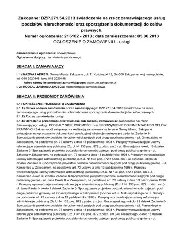 Zakopane: BZP.271.54.2013 świadczenie na rzecz zamawiającego usług podziałów nieruchomości oraz sporządzenia dokumentacji do celów prawnych. Numer ogłoszenia: 216102 - 2013; data zamieszczenia: 05.06.2013 OGŁOSZENIE O ZAMÓWIENIU - usługi Zamieszczanie ogłoszenia: obowiązkowe. Ogłoszenie dotyczy: zamówienia publicznego. SEKCJA I: ZAMAWIAJĄCY I. 1) NAZWA I ADRES: Gmina Miasta Zakopane , ul. T. Kościuszki 13, 34-500 Zakopane, woj. małopolskie, tel. 018 2020448, faks 018 2020448. Adres strony internetowej zamawiającego: www.um.zakopane.pl I. 2) RODZAJ ZAMAWIAJĄCEGO: Administracja samorządowa. SEKCJA II: PRZEDMIOT ZAMÓWIENIA II.1) OKREŚLENIE PRZEDMIOTU ZAMÓWIENIA II.1.1) Nazwa nadana zamówieniu przez zamawiającego: BZP.271.54.2013 świadczenie na rzecz zamawiającego usług podziałów nieruchomości oraz sporządzenia dokumentacji do celów prawnych.. II.1.2) Rodzaj zamówienia: usługi. II.1.4) Określenie przedmiotu oraz wielkości lub zakresu zamówienia: świadczenie na rzecz Zamawiającego usługi: PODZIAŁY NIERUCHOMOŚCI oraz SPORZĄDZENIE DOKUMENTACJI DO CELÓW PRAWNYCH Zakres robót związanych z realizacją zamówienia na terenie Gminy Miasto Zakopane polegającej na opracowaniu dokumentacji geodezyjnej obejmuje następujące zadania: Zadanie 1Sporządzenie projektów podziału nieruchomości zajętych pod drogę publiczną gminną - ul. Gimnazjalną w Zakopanem, na podstawie art. 73 ustawy z dnia 13 października 1998 r. Przepisy wprowadzające ustawy reformujące administrację publiczną (Dz.U. Nr 133 poz. 872 z późn. zm.) - ul. Gimnazjalna -około 16 działek Zadanie 2- Sporządzenie projektów podziału nieruchomości zajętych pod drogę publiczną gminną - ul. Szkolną w Zakopanem, na podstawie art. 73 ustawy z dnia 13 października 1998 r. Przepisy wprowadzające ustawy reformujące administrację publiczną (Dz.U. Nr 133 poz. 872 z późn. zm.)- ul. Szkolna -około 26 działek Zadanie 3 -Sporządzenie projektów podziału nieruchomości zajętych pod drogę publiczną gminną - ul. Kamieniec w Zakopanem, na podstawie art. 73 ustawy z dnia 13 października 1998 r. Przepisy wprowadzające ustawy reformujące administrację publiczną (Dz.U. Nr 133 poz. 872 z późn. zm.)-ul. Kamieniec -około 39 działek Zadanie 4-Sporządzenie projektów podziału nieruchomości zajętych pod drogę publiczną gminną - ul. Jana Pawła II w Zakopanem, na podstawie art. 73 ustawy z dnia 13 października 1998 r. Przepisy wprowadzające ustawy reformujące administrację publiczną (Dz.U. Nr 133 poz. 872 z późn. zm.)ul. Jana Pawła II- około 9 działek Zadanie 5- Sporządzenie projektów podziału nieruchomości zajętych pod drogę publiczną gminną - ul. Goszczyńskiego w Zakopanem (odcinek od ul. Makuszyńskiego do ul. Sabały), na podstawie art. 73 ustawy z dnia 13 października 1998 r. Przepisy wprowadzające ustawy reformujące administrację publiczną (Dz.U. Nr 133 poz. 872 z późn. zm.)-ul. Goszczyńskiego -około 12 działek Zadanie 6Sporządzenie projektów podziału nieruchomości zajętych pod drogę publiczną gminną - ul. Piaseckiego w Zakopanem, na podstawie art. 73 ustawy z dnia 13 października 1998 r. Przepisy wprowadzające ustawy reformujące administrację publiczną (Dz.U. Nr 133 poz. 872 z późn. zm.)-ul. Piaseckiego -około 16 działek Zadanie 7- Sporządzenie projektów podziału nieruchomości zajętych pod drogę publiczną gminną - ul. Bulwary Słowackiego w Zakopanem, na podstawie art. 73 ustawy z dnia 13 października 1998 r. Przepisy wprowadzające ustawy reformujące administrację publiczną (Dz.U. Nr 133 poz. 872 z późn. zm.)-ul. Bulwary Słowackiego -około 66 działek Zadanie 8- Sporządzenie projektów podziału nieruchomości zajętych pod drogę publiczną gminną - ul. Modrzejewskiej w Zakopanem, na podstawie art. 73 ustawy z dnia 13 października 1998 r. Przepisy wprowadzające ustawy reformujące administrację publiczną (Dz.U. Nr 133 poz. 872 z późn. zm.)-ul. Modrzejewskiej - około 12 działek Zadanie 9- Sporządzenie projektów podziału nieruchomości zajętych pod drogę publiczną gminną - ul. Tetmajera w Zakopanem (od ul. Grunwaldzkiej do ul. Małe Żywczańskie), na podstawie art. 73 ustawy z dnia 13 października 1998 r. Przepisy wprowadzające ustawy reformujące administrację publiczną (Dz.U. Nr 133 poz. 872 z późn. zm.)-ul.Tetmajera- około 14 działek Zadanie 10- Sporządzenie projektów podziału nieruchomości zajętych pod drogę publiczną gminną ul. Małe Żywczańskie w Zakopanem, na podstawie art. 73 ustawy z dnia 13 października 1998 r. Przepisy wprowadzające ustawy reformujące administrację publiczną (Dz.U. Nr 133 poz. 872 z późn. zm.)-ul.Małe Zywczańskie- około 39 działek Zadanie 11-Sporządzenie projektów podziału nieruchomości zajętych pod drogę publiczną gminną - ul. Andrzeja Struga w Zakopanem, na podstawie art. 73 ustawy z dnia 13 października 1998 r. Przepisy wprowadzające ustawy reformujące administrację publiczną (Dz.U. Nr 133 poz. 872 z późn. zm.)-ul. Struga-około 17 działek Zadanie 12-Sporządzenie projektów podziału nieruchomości zajętych pod drogę publiczną gminną - ul. Droga na Buńdówki w Zakopanem, na podstawie art. 73 ustawy z dnia 13 października 1998 r. Przepisy wprowadzające ustawy reformujące administrację publiczną (Dz.U. Nr 133 poz. 872 z późn. zm.)- ul. Droga na Buńdówki - około 42 działki Zadanie 13-Sporządzenie projektów podziału nieruchomości zajętych pod drogę publiczną gminną - ul. Do Tadziaków w Zakopanem, na podstawie art. 73 ustawy z dnia 13 października 1998 r. Przepisy wprowadzające ustawy reformujące administrację publiczną (Dz.U. Nr 133 poz. 872 z późn. zm.)-ul. Do Tadziaków - około 3 działki Zadanie 14Sporządzenie projektów podziału nieruchomości zajętych pod drogę publiczną gminną - ul. Heleny Marusarzówny w Zakopanem, na podstawie art. 73 ustawy z dnia 13 października 1