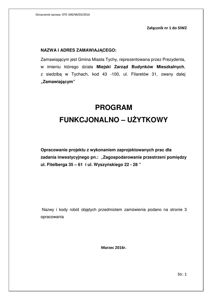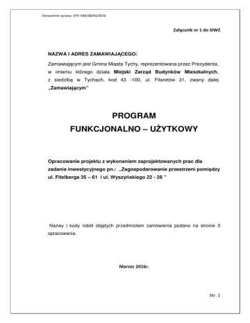 Oznaczenie sprawy: DTE-340/48/03/2016 Załącznik nr 1 do SIWZ NAZWA I ADRES ZAMAWIAJĄCEGO: Zamawiającym jest Gmina Miasta Tychy, reprezentowana przez Prezydenta, w imieniu którego działa Miejski Zarząd Budynków Mieszkalnych, z siedzibą w Tychach, kod 43 -100, ul. Filaretów 31, zwany dalej „Zamawiającym” PROGRAM FUNKCJONALNO – UŻYTKOWY Opracowanie projektu z wykonaniem zaprojektowanych prac dla zadania inwestycyjnego pn.: „Zagospodarowanie przestrzeni pomiędzy ul. Fitelberga 35 – 61 i ul. Wyszyńskiego 22 - 28 ” Nazwy i kody robót objętych przedmiotem zamówienia podano na stronie 3 opracowania Marzec 2016r. Str. 1 Oznaczenie sprawy: DTE-340/48/03/2016 II. ZAWARTOŚĆ OPRACOWANIA I. STRONA TYTUŁOWA ............................................. Błąd! Nie zdefiniowano zakładki. II. ZAWARTOŚĆ OPRACOWANIA .................................................................................. 2 III. CZĘŚĆ OPISOWA...................................................................................................... 3 1.Wspólny słownik Zamówień (CPV) ............................................................................ 3 2.Nazwa nadana zamówieniu ....................................................................................... 4 3.Opis i lokalizacja przedmiotu zamówienia ................................................................. 4 4.Zakres i wymagania dotyczące zamówienia .............................................................. 4 5.Wykonanie zaprojektowanych robót budowlanych wraz z robotami towarzyszącymi ...................................................................................................................................... 9 6.Wymagania dotyczące zamówienia ......................................................................... 10 7.Uwagi końcowe ........................................................................................................ 10 IV. PRZEPISY PRAWNE I NORMY ................................................................................ 10 V. ZAŁĄCZNIKI ............................................................................................................ 11 Str. 2 Oznaczenie sprawy: DTE-340/48/03/2016 III. CZĘŚĆ OPISOWA 1. Wspólny słownik Zamówień (CPV) ROBOTY BUDOWLANE 45 00 00 00 – 7 – Roboty budowlane 45 11 12 91 – 4 – Roboty w zakresie zagospodarowania terenu 45 23 32 00 – 1 – Roboty w zakresie różnych nawierzchni 45 23 33 22 – 1 – Roboty w zakresie chodników 37 53 52 00 – 9 – Wyposażenie placów zabaw 45 31 12 00 – 2 – Roboty w zakresie instalacji elektrycznych PRACE PROJEKTOWE 71 22 00 00 – 6 – Usługi projektowania architektonicznego 71 40 00 00 – 7 – Usługi architektoniczne dotyczące planowania przestrzennego i zagospodarowania terenu Str. 3 Oznaczenie sprawy: DTE-340/48/03/2016 2. Nazwa nadana zamówieniu OPRACOWANIE PROJEKTU Z WYKONANIEM ZAPROJEKTOWANYCH PRAC DLA ZADANIA INWESTYCYJNEGO PN.: „ZAGOSPODAROWANIE PRZESTRZENI POMIĘDZY UL. FITELBERGA 35 – 61 I UL. WYSZYŃSKIEGO 22 - 28 ” 3. Opis i lokalizacja przedmiotu zamówienia 3.1. Przedmiotem zamówienia jest: - Opracowanie projektu budowlanego wraz z projektem zagospodarowania terenu - wykonanie zaprojektowanych prac - sporządzenie dokumentacji powykonawczej 3.2. Lokalizacja: terytorium Polski, w województwie śląskim, w mieście na prawach powiatu – Tychy nieruchomości stanowiące własność Miasta Tychy, administrowane przez Rejon Obsługi Mieszkańców Nr IV ul. Fitelberga 35 – 61 i ul. Wyszyńskiego 22 – 28. położone pomiędzy: 4. Zakres i wymagania dotyczące zamówienia A. OPRACOWANIE PROJEKTU BUDOWLANEGO WRAZ Z PROJEKTEM ZAGOSPODAROWANIA TERENU Zakres dokumentacji projektowej powinien obejmować : A.1. Projekt zagospodarowania terenu – z wymaganymi uzgodnieniami, (w tym z właścicielami sieci podziemnych), pozwoleniami, decyzjami. Dokumentacje należy wykonać w 4 egzemplarzach + wersja elektroniczna w formacie pdf na płycie CD. A.2. Projekt budowlany winien obejmować specyfikacje techniczne wykonania i odbioru robót wraz z zakresem robót. A.3. Projekt należy opracować zgodnie z obowiązującymi przepisami z uwzględnieniem specyfiki terenu, oraz niniejszego programu funkcjonalnoużytkowego. A.4. Zamawiający wymaga przedłożenia do akceptacji rysunków wykonawczych i szczegółowych oraz wykazu proponowanych materiałów, przed ich skierowaniem do zatwierdzenia, w aspekcie ich zgodności z założeniami programu funkcjonalno-użytkowego. Str. 4 Oznaczenie sprawy: DTE-340/48/03/2016 A.5. Materiały wskazane w projekcie powinny posiadać deklaracje zgodności z Polską Normą lub Europejską Aprobatą techniczną. A.6. Uzyskanie stosownego pozwolenia na budowę lub zgłoszenia zamiaru budowy w Wydziale Budownictwa w Urzędzie Miasta Tychy. A.7. Projekt musi uzyskać na etapie koncepcji pozytywną akceptację Wnioskodawców. A.8. ZAKRES ROBÓT BUDOWLANYCH DO ZAPROJEKTOWANIA I WYKONANIA Zakres wynikający z opracowanego projektu budowlanego powinien obejmować między innymi: A.8.1. Modernizację i zagospodarowanie terenów zielonych - budowa chodników w miejscach zlikwidowanych przedeptów o powierzchni: (26 mb + 22 mb) * 1,5 m = 72 m² Zakres prac: korytowanie, podbudowa z klińca 0 – 31,50mm o grubości 15 cm, ułożenie nawierzchni z kostki brukowej betonowej szarej gr. 6 cm na podsypce cementowo-piaskowej 1:4 i obustronnym obrzeżem 8x30, - wykonanie nowej nawierzchni istniejących chodników ~ (82 mb + 46 mb) * 1,5 m = 192 m² Zakres prac: rozbiórka nawierzchni z mas mineralno-asfaltowych, płytek chodnikowych oraz kostki brukowej betonowej, uzupełnienie podbudowy tłuczniowej, ułożenie nawierzchni z kostki brukowej betonowej szarej gr. 6 cm na podsypce cementowo-piaskowej 1:4 i obustronnym obrzeżem 8x30, - wykonanie utwardzenia terenu na 10-cio stanowiskowy stojak na rowery wraz z jego montażem ~ (6 m x 4,5 m) = 27,00m² (6 x 4