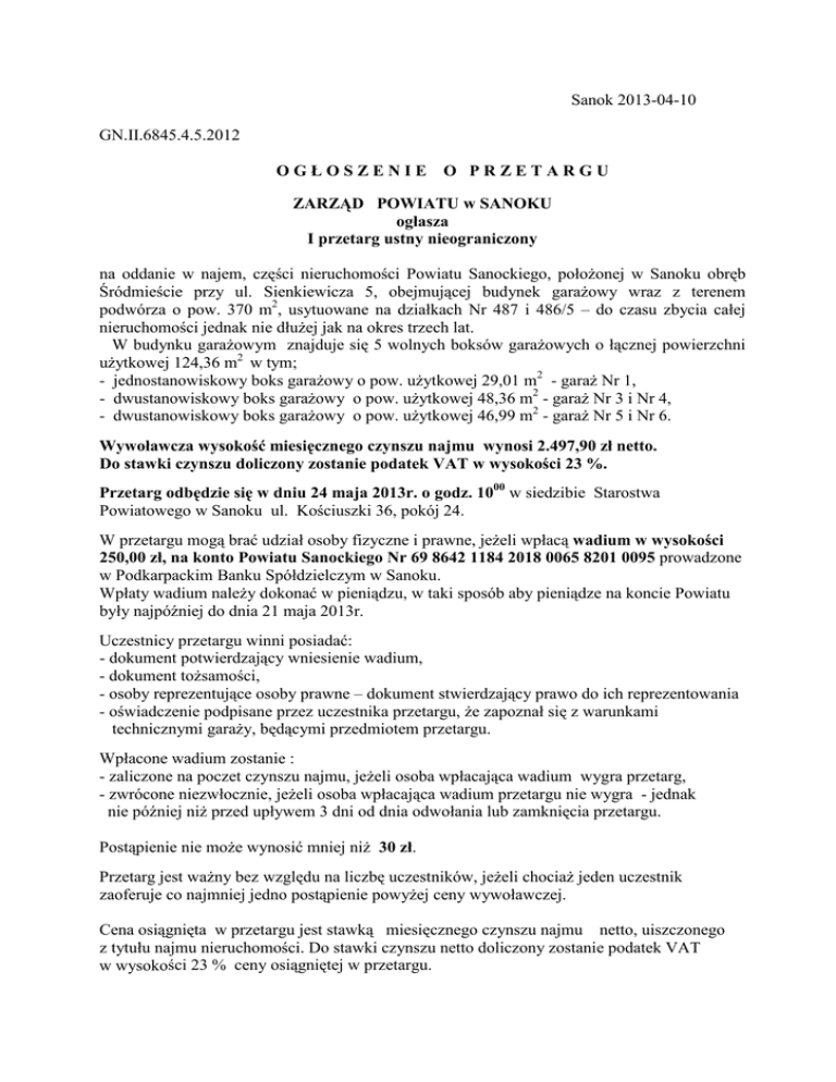 Sanok 2013-04-10 GN.II.6845.4.5.2012 OGŁOSZENIE O PRZETARGU ZARZĄD POWIATU w SANOKU ogłasza I przetarg ustny nieograniczony na oddanie w najem, części nieruchomości Powiatu Sanockiego, położonej w Sanoku obręb Śródmieście przy ul. Sienkiewicza 5, obejmującej budynek garażowy wraz z terenem podwórza o pow. 370 m2, usytuowane na działkach Nr 487 i 486/5 – do czasu zbycia całej nieruchomości jednak nie dłużej jak na okres trzech lat. W budynku garażowym znajduje się 5 wolnych boksów garażowych o łącznej powierzchni użytkowej 124,36 m2 w tym; - jednostanowiskowy boks garażowy o pow. użytkowej 29,01 m2 - garaż Nr 1, - dwustanowiskowy boks garażowy o pow. użytkowej 48,36 m2 - garaż Nr 3 i Nr 4, - dwustanowiskowy boks garażowy o pow. użytkowej 46,99 m2 - garaż Nr 5 i Nr 6. Wywoławcza wysokość miesięcznego czynszu najmu wynosi 2.497,90 zł netto. Do stawki czynszu doliczony zostanie podatek VAT w wysokości 23 %. Przetarg odbędzie się w dniu 24 maja 2013r. o godz. 1000 w siedzibie Starostwa Powiatowego w Sanoku ul. Kościuszki 36, pokój 24. W przetargu mogą brać udział osoby fizyczne i prawne, jeżeli wpłacą wadium w wysokości 250,00 zł, na konto Powiatu Sanockiego Nr 69 8642 1184 2018 0065 8201 0095 prowadzone w Podkarpackim Banku Spółdzielczym w Sanoku. Wpłaty wadium należy dokonać w pieniądzu, w taki sposób aby pieniądze na koncie Powiatu były najpóźniej do dnia 21 maja 2013r. Uczestnicy przetargu winni posiadać: - dokument potwierdzający wniesienie wadium, - dokument tożsamości, - osoby reprezentujące osoby prawne – dokument stwierdzający prawo do ich reprezentowania - oświadczenie podpisane przez uczestnika przetargu, że zapoznał się z warunkami technicznymi garaży, będącymi przedmiotem przetargu. Wpłacone wadium zostanie : - zaliczone na poczet czynszu najmu, jeżeli osoba wpłacająca wadium wygra przetarg, - zwrócone niezwłocznie, jeżeli osoba wpłacająca wadium przetargu nie wygra - jednak nie później niż przed upływem 3 dni od dnia odwołania lub zamknięcia przetargu. Postąpienie nie może wynosić mniej niż 30 zł. Przetarg jest ważny bez względu na liczbę uczestników, jeżeli chociaż jeden uczestnik zaoferuje co najmniej jedno postąpienie powyżej ceny wywoławczej. Cena osiągnięta w przetargu jest stawką miesięcznego czynszu najmu netto, uiszczonego z tytułu najmu nieruchomości. Do stawki czynszu netto doliczony zostanie podatek VAT w wysokości 23 % ceny osiągniętej w przetargu. -2Termin uiszczenia pierwszego czynszu najmu, pomniejszonego o wpłacone wadium określi umowa najmu. Termin uiszczenia miesięcznego czynszu ustala się do dnia 10 każdego miesiąca. Czynsz należy uiszczać na konto Powiatu Sanockiego nr 43 8642 1184 2018 0065 8201 0078 prowadzone w Podkarpackim Banku Spółdzielczym w Sanoku. Termin zawarcia umowy najmu rozstrzygnięcia przetargu. zostanie ustalony najpóźniej w ciągu 14 dni od dnia Przekazanie garaży nastąpi w dniu zawarcia umowy na podstawie protokołu zdawczoodbiorczego. W przypadku uchylenia się wygrywającego przetarg od zawarcia umowy, kwota wpłaconego wadium nie podlega zwrotowi. Szczegółowe informacje dotyczące w/w nieruchomości można uzyskać w Wydziale Geodezji i Gospodarki Nieruchomościami Starostwa Powiatowego w Sanoku, ul. Kościuszki 36, pok. 23 Z uzasadnionej przyczyny Zarząd Powiatu w Sanoku może odwołać ogłoszony przetarg, podając niezwłocznie informację o odwołaniu przetargu do publicznej wiadomości, poprzez umieszczenie odpowiedniej informacji na stronie internetowej oraz tablicach ogłoszeń Powiatu Sanockiego Podanie do publicznej wiadomości następuje w drodze: - wywieszenia na tablicy ogłoszeń w budynkach Starostwa Powiatowego w Sanoku, przy ul. Rynek 1 oraz przy ul. Kościuszki 36, - wywieszenie na tablicy ogłoszeń w budynku Gminy Miasta Sanoka, przy ul. Rynek 1, - wywieszenie na tablicy ogłoszeń w budynku Gminy Sanok, przy ul. Kościuszki 23, - opublikowanie na stronie internetowej biuletynu informacji publicznej Starostwa Powiatowego w Sanoku – www.bip.powiat-sanok.pl. Otrzymują: 1. Wydział Organizacyjny Starostwa Powiatowego w Sanokucelem wywieszenia na tablicy ogłoszeń i opublikowania na stronach internetowych Powiatu Sanockiego. 2. Wydział Geodezji i Gospodarki Nieruchomościami w Sanoku ul. Kościuszki 36 – celem wywieszenia na tablicy ogłoszeń. 3. Gmina Miasta Sanoka – celem wywieszenia na tablicy ogłoszeń. 4. Gmina Sanok - celem wywieszenia na tablicy ogłoszeń. 5. A/a.