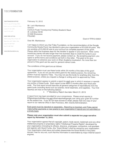 February 10, 2012 NEW YORK OFFICE Mr. Lech Mankfewicz Director Centrum Fizyki Teoretycznej Polskiej Akademii Nauk AL LotnikOw 32/46 02-668 Warszawa POLAND Grant #TFR12-00501 Dear Mr. Mankiewicz: am happy to inform you that Tides Foundation, on the recommendation of the Google Community Grants Fund, has decided to give your organization a $1 5,000.00 grant. We are sending a $15,000.00 wire to your account as complete payment of this grant. Please allow five business days for the transfer to appear in your account. Note: some beneficiary banks will take longer than five business days to credit the funds to your account. If you do not receive payment, please contact us. By accepting payment, you agree to all the terms and conditions set forth in this letter. This grant is for your organization to advance your work on Khan Academy localization. No more than ten percent of this grant can be used for general indirect costs. The conditions of this grant are as follows: Your organization must use these funds within 24 months of the date of this grant agreement. If you do not use the entire grant for the stated purpose, the remaining portion must be repaid to Tides. You may not use the funds for anything other than the stated purpose, unless you request a change in writing and it is approved by Tides. Your organization agrees to submit a report for each year in which it receives or spends any portion of these funds. Each report is due within 3 months after your fiscal year ends. The final report should describe all general categories of expenditures from the grant funds (including items such as salaries, travel expenses, and supplies). Your first report(s) are due on the following date(s): St 1 Mandatory Report due date: March 31, 2013 A report form has been provided for your convenience. Please email reports to [email protected] and [email protected] using your grant ID number as the subject line. If you do not have access to email, please mail one copy of your report to our national office in San Francisco, Attn: Grants Administration. Each grant must be reported on separately. Reporting is important, and Tides cannot make further payments or new grants to your organization if reports are not submitted on a timely basis. Please note your organization must also submit a separate two page narrative report by November 12, 2012. Your organization agrees that all copyright, patent, trade secret, trademark and any other intellectual property or proprietary rights (Intellectual Property Rights) developed by your organization (including its officers, directors, employees, contractors, sub-grantees and agents) with Grant Funds, (the Grant Works) shall be owned by your organization. Your organization shall place and widely disseminate the Grant Works in the public domain, free for any use, such that the information is searchable by major Internet search engines. Your organization agrees to comply with all applicable laws in connection with the expenditure of the grant. Additionally, your organization agrees that no portion of the grant will be used to corruptly give anything of value to anyone, including a government official, for the purpose of a) gaining or retaining business, b) causing a government official to do or not do something in their official capacity or c) to gain any other improper advantage. Your organization certifies that it has not and will not support or conduct, directly or indirectly, violence or terrorist activity of any kind. Your organization must notify Tides immediately, in writing, of any change in its tax-exempt status, its executive or key staff responsible for achieving the grant purposes. or any other change affecting its ability to achieve the grant purposes. Any change of purpose for this grant must be requested and approved in writing. Your organization may not use any portion of these funds to carry on propaganda or to attempt to influence specific legislation either by direct or grassroots lobbying. It also may not use these funds to participate or intervene in any campaign (including the publishing or distribution of statements) on behalf of or in opposition to any candidate for public office; or to fund any specific voter registration drive conducted in a manner that favors a particular candidate or slate of candidates. Your organization must account for grant funds separately— either in a separate bank account or a separate bookkeeping account that is dedicated to this grant’s stated purpose and maintained as part of your financial records. All expenditures made for the purposes of the grant must appear in your organizations financial records, and such records must be made available to Tides upon request. Your organization agrees that it shall not use any portion of this grant to make sub-grants or subcontracts to individuals or organizations on a non-objective basis, or for any non-charitable or noneducational purpose. This grant does not represent the payment of a pledge or other financial obligation. No goods or services should be provided in return for this grant. If the Donor or Fund Advisor is known to you, your organization agrees that it shall not use any portion of this grant to make any grant or loan, pay compensation. reimburse expenses. or make any other similar payment to: (i) any Donor to this Fund, (ii) any Fund Advisor to this Fund, (iii) any Relative of a Donor or Fund Advisor to this Fund, or (iv) any Controlled Entity. If you have any questions about these terms please refer to the Resources Section on Tides Foundation website. This grant must be used exclusively for activities conducted outside of the U.S. Your organization is expected to take all necessary steps to counteract exchange rate fluctuations and inflation. Any exchange losses will not be paid by Tides. If you have occasion to announce or acknowledge this grant publicly, please indicate that support was provided by the Google Community Grants Fund of Tides Foundation. Should you ha