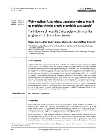 ® Postepy Hig Med Dosw (online), 2011; 65: 244-254 e-ISSN 1732-2693 www.phmd.pl Review Wpływ polimorfizmu wirusa zapalenia wątroby typu B na przebieg choroby u osób przewlekle zakażonych* Received: 2010.12.17 Accepted: 2011.03.24 Published: 2011.04.21 The influence of hepatitis B virus polymorphism on the progression of chronic liver disease Magda Rybicka1, Piotr Stalke2, Urszula Charmuszko3, Krzysztof Piotr Bielawski1 K atedra Biotechnologii, Międzyuczelnianego Wydziału Biotechnologii Uniwersytetu Gdańskiego i Gdańskiego Uniwersytetu Medycznego 2 Klinika Chorób Zakaźnych Gdańskiego Uniwersytetu Medycznego 3 Zakład Mikrobiologii Molekularnej i Serologii – Krajowy Ośrodek Salmonella, Katedra Mikrobiologii Gdańskiego Uniwersytetu Medycznego 1 Streszczenie Zakażenie wirusem zapalenia wątroby typu B (HBV) jest problemem ogólnoświatowym, który dotyka ponad 350 milionów ludzi. Jest jedną z ważniejszych przyczyn przewlekłego zapalenia wątroby prowadzącego do rozwoju marskości wątroby, a następnie raka wątrobowokomórkowego. Charakterystyczną cechą wirusa HBV jest jego duża zmienność genetyczna, która powstaje na skutek błędów polimerazy. Odwrotna transkryptaza wirusa nie ma bowiem aktywności korekcyjnej błędów replikacyjnych, co skutkuje większą niż w przypadku innych wirusów DNA frekwencją mutacji. Występowanie rozmaitych wariantów wirusa HBV ma istotny wpływ na przebieg zakażenia. Dotąd zidentyfikowano 8 genotypów wirusa (A–H), a ich występowanie uzależnione jest od położenia geograficznego. Określenie typu genetycznego HBV dostarcza informacji na temat aktywności choroby, tempa progresji w kierunku marskości i pierwotnego raka wątroby. Naturalny polimorfizm wirusa sprzyja powstawaniu zmian w sekwencji genomu wirusa HBV, które mają istotny wpływ na przebieg zakażenia oraz powstawanie wariantów o obniżonej wrażliwości na leki przeciwwirusowe. Zmienność genetyczna wirusa HBV jest jedną z głównych przyczyn przewlekłego zakażenia oraz trudności w terapii. Słowa kluczowe: HBV • genotyp • polimorfizm Summary Hepatitis B virus (HBV) infection is one of the major human health problems worldwide. It is estimated that chronic HBV infection affects more than 350 million people globally. It is one of the leading causes of liver cirrhosis and hepatocellular carcinoma. High genetic variability is a characteristic feature of HBV as the viral polymerase lacks proofreading activity. The nucleotide substitution rate for HBV is 10-fold higher than for other DNA viruses. Genetic variations of HBV influence the clinical outcome of HBV infection. There are eight genotypes of hepatitis B virus (A–H) that have a distinct geographical distribution. There is clinical significance of HBV genotype in terms of disease activity, risk of progression to cirrhosis, the development of hepatocellular carcinoma and response to antiviral treatments. Moreover, - - - - - * Praca finansowana z grantu ST-79 Gdańskiego Uniwersytetu Medycznego i grantu Ministerstwa Nauki i Szkolnictwa Wyższego NN302183639. 244 ® Postepy Hig Med Dosw (online), 2011; 65 Rybicka M i wsp. – Wpływ polimorfizmu wirusa zapalenia wątroby typu B… polymorphism in HBV viral polymerase influences the development of HBV mutants resistant to nucleotide analogue treatment that is a consequence of treatment failure. Key words: Full-text PDF: Word count: Tables: Figures: References: Adres autora: HBV • genotype • polymorphism http://www.phmd.pl/fulltxt.php?ICID=939665 4878 — 3 121 prof.dr hab. Krzysztof Piotr Bielawski, Katedra Biotechnologii, Międzyuczelnianego Wydziału Biotechnologii Uniwersytetu Gdańskiego i Gdańskiego Uniwersytetu Medycznego, ul. Kładki 24, 80-822 Gdańsk; e-mail: [email protected] 1. Wirus zapalenia wątroby typu B Zakażenie wirusem zapalenia wątroby typu B (HBV) jest ogólnoświatowym problemem dotykającym 30% całej populacji (anty-HBc plus), spośród której ponad 350 milionów cierpi na przewlekłe zapalenie wątroby (chronic hepatitis B – CHB). U blisko 30% osób proces ten prowadzi do rozwoju marskości wątroby, a następnie raka wątrobowokomórkowego (hepatocellular carcinoma – HCC). Szacuje się, że wirus HBV jest najczęstszym, po tytoniu, pojedynczym czynnikiem rakotwórczym [20,91]. Z powodu zakażenia HBV co roku rejestruje się na świecie ponad 1 mln zgonów [68,116]. W Polsce liczba nosicieli HBV (HBsAg dodatnich) stanowi około 1,3% populacji i sukcesywnie obniża się [12]. Wirus zapalenia wątroby typu B (hepatitis B virus – HBV) należy do rodziny Hepadnaviridae i rodzaju Orthohepadnavirus [103]. Do tej grupy zaliczane są również zwierzęce wirusy zapalenia wątroby: świstaka amerykańskiego (woodchuck hepatitis virus – WHV), wiewiórki ziemnej (ground squirrel hepatitis virus – GSHV) [66,95], kaczki pekińskiej (duck hepatitis B virus – DHBV) oraz czapli siwej (heron hepatitis virus – HHBV) [66]. Wszystkie hepadnawirusy wykazują swoisty hepatotropizm oraz zbliżony cykl życiowy. Umożliwiło to wykorzystanie ich jako modeli przebiegu zakażenia HBV, a doświadczenia prowadzone na zakażonych nimi zwierzętach laboratoryjnych pomogły w lepszym poznaniu biologii oraz przebiegu infekcji HBV u człowieka. Do tej pory nie było to możliwe, ponieważ wirus zapalenia wątroby typu B jest patogenny jedynie dla ludzi i niektórych małp naczelnych (szympansy) [63,90]. - - - - - 1a. Budowa wirionu HBV Cząsteczka infekcyjna wirusa HBV (wirion, ryc. 1), tzw. cząstka Dane’a [26], ma średnicę około 42 nm, otoczona jest białkowo-lipidowym płaszczem składającym się z trzech białek budujących strukturę otoczki: dużego (L), średniego (M) oraz małego (S) nazywanego białkiem powierzchniowym – HBsAg; Env (hepatitis B surface antygen; envelope protein) [91]. Białko S to główny komponent otoczki, przeciwciała skierowane przeciw niemu pełnią funkcję ochronną oraz umożliwiają neutraliz