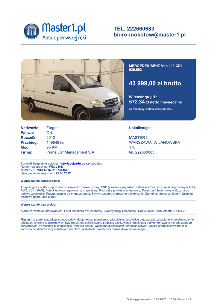 TEL. 222660683 [email protected] MERCEDES-BENZ Vito 110 CDI 639.603 43 999,00 zł brutto W leasingu już: 572.34 zł netto miesięcznie 36 miesięcy, opłata wstępna 10% Nadwozie: Paliwo: Rocznik: Przebieg: Moc: Firma: Furgon ON 2012 149548 km 95 KM Prime Car Management S.A. Lokalizacja: MASTER1 WARSZAWA, WILANOWSKA 178 tel. 222660683 Sprawdź bezpłatnie auto na historiapojazdu.gov.pl podając: Numer rejestracyjny: WD3086E Numer VIN: WDF63960313744454 Datę pierwszej rejestracji: 28.05.2012 Wyposażenie standardowe: Adaptacyjne światła stop, Drzwi przesuwne z prawej strony, ESP (elektroniczny układ stabilizacji toru jazdy ze zintegrowanym ABS, ASR, EBV i BAS), Fotel kierowcy regulowany, Klapa tylna, Poduszka powietrzna kierowcy, Przestrzeń ładunkowa wyłożona do połowy wysokości, Przygotowanie do montażu radia, Szyby przednie sterowane elektrycznie, Zamek centralny z pilotem, Ścianka działowa pełna (bez okna) Wyposażenie dealerskie: Alarm ze zdalnym sterowaniem, Fotel pasażera dwuosobowy, Klimatyzacja Tempmatik, Radio CD/MP3/Bluetooth AUDIO 20 Master1 to punkt sprzedaży samochodów Masterlease, pierwszego właściciela. Wszystkie auta zostały zakupione w polskim salonie, posiadają wycenę rzeczoznawcy, były regularnie serwisowane podczas użytkowania i posiadają udokumentowaną historię zdarzeń serwisowych. W Master1.pl znajdziecie Państwo szeroki wachlarz ubezpieczeń komunikacyjnych. Nasza oferta skierowana jest zarówno do klientów indywidualnych jak i firm. Wszelkich formalności można dokonać na miejscu. Opis wygenerowano 16.02.2017 o 11:00 Strona 1 z 1