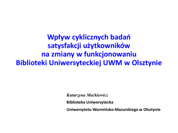 Wpływ cyklicznych badań satysfakcji użytkowników na zmiany w funkcjonowaniu Biblioteki Uniwersyteckiej UWM w Olsztynie Katarzyna Maćkiewicz Biblioteka Uniwersytecka Uniwersytetu Warmińsko-Mazurskiego w Olsztynie Wymogi ankietyzacji • W celu osiągnięcia wysokiej jakości kształcenia został wprowadzony Wewnętrzny System Zapewniania Jakości Kształcenia, którego integralnymi elementami są m. in. procedury zapewniania i doskonalenia jakości kształcenia, w tym system badań ankietowych. • System badań ankietowych stanowi integralną część Wewnętrznego Systemu Zapewniania Jakości Kształcenia i obejmuje swoim zakresem działania społeczność akademicką i absolwentów Uniwersytetu oraz interesariuszy spoza środowiska akademickiego. • Wszystkie działania związane z funkcjonowaniem systemu badań ankietowych prowadzone są z poszanowaniem zasad etyki badań społecznych, w szczególności dobrowolności, anonimowości, poufności oraz jawności wyników. • Procedura WSZJK-A-BU-1 – Przeprowadzanie ankietowych badań ewaluacyjnych „Ankieta ewaluacyjna” - Załącznik nr 2 do procedury WSZJK-A-BU-1; • Raport – wyniki ankietyzacji; • Karta samooceny jednostki; • Analiza raportów samooceny jednostek UWM w Olsztynie; • Zalecenia i rekomendacje UWM w Olsztynie. Charakterystyka • Terminy ankietyzacji: • 17-27 kwietnia 2013 r. • 07-16 kwietnia 2014 r. • 13-18 kwietnia 2015 r. • Liczba czytelników zarejestrowanych w systemie bibliotecznym: • 2013 r. – 48.257 (17.887 – aktywnych użytkowników) • 2014 r. – 42.863 (23.245 – aktywnych użytkowników) • 2015 r. – 40.656 (24.719 – aktywnych użytkowników) • Liczba ankietowanych: • 2013 r. – 1.455 (8,13 % – aktywnych użytkowników) • 2014 r. – 930 (4,00 % – aktywnych użytkowników) • 2015 r. – 431 (1,74 % – aktywnych użytkowników) Metryczka użytkownik płeć 75,38 72,65 94,91 67,52 96,06 94,84 32,48 27,35 5,09 2013 5,16 2014 studenci pracownicy 24,62 3,94 2015 2013 2014 kobiety mężczyźni 2015 Procentowy udział ankietowanych z poszczególnych Wydziałów UWM w Olsztynie 30 25 20 15 10 5 0 2013 WBZ WBiB WGiGP 2014 WH WKŚiR WMiI WMW WNE WNM 2015 WNS WNT WNoŚ WNoŻ WPiA WS WT Inni Procentowy udział ankietowanych z poszczególnych roczników studiów 35,37 30,65 29,25 28,66 28,05 26,67 25,4 24,09 20,49 9,51 8,71 5,9 6,85 5,48 0,11 1,9 0,53 0 2013 6,59 5,16 0,65 0 2014 I II III IV V VI 2015 st. doktor. st. podypl. 0 0 1. Jak często korzysta Pani/Pan z usług Biblioteki? 40 37,35 35 33,66 30 25 26,12 27,42 27,56 26,91 24,3 20 23,43 23,12 18,92 18,9 15 12,3 10 5 0 2013 częściej niż raz w tygodniu 2014 raz w tygodniu 2015 raz w miesiącu rzadziej niż raz w miesiącu 2. Czy odpowiadają Pani/Panu godziny pracy Biblioteki? 100 92,16 92,59 89,89 90 80 70 60 50 40 30 20 10,11 7,84 10 7,42 0 2013 2014 TAK NIE 2015 3. W jakim celu odwiedza Pani/Pan zazwyczaj Bibliotekę? Można podać więcej niż jedną odpowiedź. wypożyczam zbiory do domu korzystam ze zbiorów w czytelni korzystam w Bibliotece z zasobów elektronicznych (bazy danych, książki elektroniczne) korzystam zdalnie z zasobów elektronicznych (bazy danych, książki elektroniczne) korzystam z informacji zamieszczonych na stronie WWW Biblioteki zasięgam informacji spotykam się ze znajomymi w celach towarzyskich 2013 2014 2015 17,17 12,76 23,67 7,66 11,83 55,77 20,88 21,08 12,37 19,46 12,26 10,75 8,63 5,00 8,45 4,05 4,5 9,13 23,76 28,2 32,04 63,12 72,85 83,01 korzystam z komputerów i Internetu 4. W skali 1-5, gdzie 5 jest oceną najwyższą, jak Pani/Pan ocenia: warunki lokalowe i wyposażenie zbiory biblioteczne 80 50 70 45 40 60 35 50 30 40 25 30 20 15 20 10 10 5 0 0 2013 2014 1 2 3 2015 4 5 2013 2014 1 2 3 2015 4 5 4. W skali 1-5, gdzie 5 jest oceną najwyższą, jak Pani/Pan ocenia: limit przewidzianych regulaminem książek do wypożyczenia czas realizacji zamówienia z magazynu Biblioteki 70 45 60 40 35 50 30 40 25 20 30 15 20 10 10 5 0 0 2013 2014 1 2 3 2015 4 5 2013 2014 1 2 3 2015 4 5 4. W skali 1-5, gdzie 5 jest oceną najwyższą, jak Pani/Pan ocenia: okres na jaki można wypożyczać książki 50 usługi informacyjne 60 45 50 40 35 40 30 25 30 20 20 15 10 10 5 0 0 2013 2014 1 2 3 2015 4 5 2013 2014 1 2 3 2015 4 5 4. W skali 1-5, gdzie 5 jest oceną najwyższą, jak Pani/Pan ocenia: stronę WWW Biblioteki możliwość korzystania z komputerów i Internetu 60 70 50 60 50 40 40 30 30 20 20 10 10 0 0 2013 2014 1 2 3 2015 4 5 2013 2014 1 2 3 2015 4 5 5. Jaką formą edukacyjną proponowaną przez Bibliotekę jest Pani/Pan zainteresowana/zainteresowany? 61,4 53,6 39,91 26,34 15,38 17,36 14,44 12,91 2013 18,71 13,44 16,56 2014 17,63 17,87 16,24 16,01 2015 materiały informacyjne zamieszczane na stronie WWW Biblioteki zajęcia dotyczące korzystania ze zbiorów Biblioteki prezentacje i szkolenia ze źródeł elektronicznych przysposobienie biblioteczne indywidualne szkolenia korzystania ze zbiorów Biblioteki (bezpośrednie, telefoniczne, mailowe) 6. W skali 1-5, gdzie 5 jest oceną najwyższą, jak Pani/Pan ocenia pracowników Biblioteki: kompetencje kultura obsługi dostępność 90 90 90 80 80 80 70 70 70 60 60 60 50 50 50 40 40 40 30 30 30 20 20 20 10 10 10 0 0 0 2013 1 2 2014 3 2015 4 5 2013 1 2 2014 3 2015 4 5 2013 1 2 2014 3 2015 4 5 Wdrożenia • Adaptacja przestrzeni dla użytkowników; • Wydłużenie godzin pracy Biblioteki Uniwersyteckiej; • Wymiana komputerów; • Instalacja MS Office; • Zmiana systemu logowania; • Wi-Fi; • Skaner, drukarki. Dziękuję za uwagę