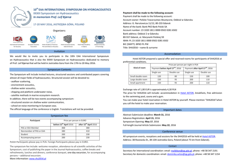 10th EAA INTERNATIONAL SYMPOSIUM ON HYDROACOUSTICS XXXIII Symposium on Hydroacoustics In memoriam Prof. Leif Bjørnø 17-20 MAY 2016, JASTRZĘBIA GÓRA, POLAND Organizers: International Commission for Acoustics European Acoustics Association Polish Academy of Sciences The Committee on Acoustics Polish Acoustical Society Gdansk Division Polish Naval Academy in Gdynia Gdansk University of Technology Payment shall be made to the following account: Payment shall be made to the following account: Account owner: Polskie Towarzystwo Akustyczne, Oddzial w Gdansku Address: G. Narutowicza 11/12, 80-233 Gdansk Name of the bank: Bank PKO Bank Polski SA Account number: 23 1020 1811 0000 0502 0281 6502 Bank address: Oddzial 2 w Gdansku 80-557 Gdansk, ul. Marynarki Polskiej 59 IBAN: PL 23 1020 1811 0000 0502 0281 6502 BIC (SWIFT): BPKO PL PW Title: SHA2016 – name & surname Invitation We would like to invite you to participate in the 10th EAA International Symposium on Hydroacoustics that is also the XXXIII Symposium on Hydroacoustics dedicated to memory of Prof. Leif Bjørnø that will be held in Jastrzebia Gora from the 17th to 20 May 2016. The Symposium will include invited lectures, structured sessions and contributed papers covering almost all major fields of hydroacoustics. Structured session will be devoted to: - seafloor scattering, - environment acoustics, - shallow water acoustics, - shipping and platform underwater noise, - satellite methods in marine ecosystem research. In addition, there will be two events accompanying symposium: - structured session on shallow water communication, - school on noise monitoring in European seas. The official language of the conference is English. Translations will not be provided. Symposium fee PAS or EEA Member Nonmember of PAS or EAA Student Accompanying person Price per person in EURO before 15th April 2016 350 380 200 200 Hotel ASTOR prepared a special offer and reserved rooms for participants of SHA2016 at preferential conditions. Price per person per night in PLN Kind of room Symposium Contents Participant Accomodation after 15th April 2016 380 410 230 230 Polish Participants please pay in PLN. Foreign Participants please pay in EURO. The symposium fee include: welcome reception, attendance to all scientific activities of the Symposium, cost of publishing the paper in the Journal Hydroacoustics, coffee breaks and refreshments, lunches and dinners, conference banquet, one-day excursion, for accompanying persons – additional excursion. More information: www.sha2016.pl Small double room Large double room Small apartment Payment before April 17 th, 2016 Payment after April 17 th, 2016 Single use Single use 120 150 150 Double use 80 95 95 150 200 200 Double use 100 110 110 Exchange rate of 1,00 EUR is approximately 4,30 PLN The price for SHA2016 will include: accommodation in Hotel ASTOR, breakfasts, free admission to the swimming pool, sauna and a gym. You can make your hotel reservation in Hotel ASTOR by yourself. Please mention “SHA2016”when you call the hotel to make your reservation. Important dates Abstract Submission deadline: March 31, 2016 Advance Registration: April 15, 2016 Symposium Opening: May 17, 2016 Full-length Journal Article Submission: May 22, 2016 Conference venue All symposium events, receptions and sessions for the SHA2016 will be held at Hotel ASTOR. Address: 38 Rozewska St., 84-104 Jastrzebia Gora, Poland (about 75 km from Gdansk). Contact Secretary for international coordination: email: [email protected], phone: +48 58 347 2191 Secretary for domestic coordination: email: [email protected], phone: +48 58 347 1154