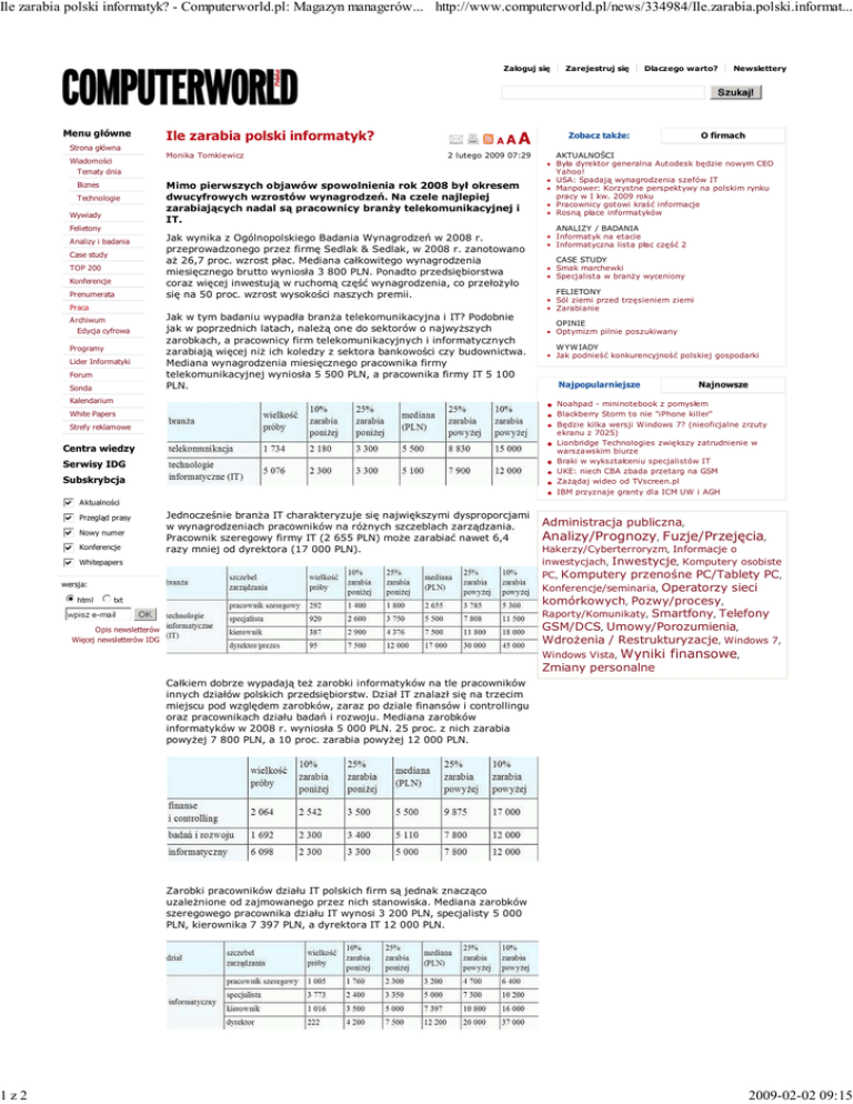 Ile zarabia polski informatyk? - Computerworld.pl: Magazyn managerów... http://www.computerworld.pl/news/334984/Ile.zarabia.polski.informat... 1z2 Zaloguj się Zarejestruj się Dlaczego warto? Newslettery Szukaj! Menu główne Ile zarabia polski informatyk? Strona główna Wiadomości Tematy dnia Biznes Technologie Wywiady Monika Tomkiewicz AA A 2 lutego 2009 07:29 Mimo pierwszych objawów spowolnienia rok 2008 był okresem dwucyfrowych wzrostów wynagrodzeń. Na czele najlepiej zarabiających nadal są pracownicy branŜy telekomunikacyjnej i IT. Felietony Analizy i badania Case study TOP 200 Konferencje Prenumerata Jak wynika z Ogólnopolskiego Badania Wynagrodzeń w 2008 r. przeprowadzonego przez firmę Sedlak & Sedlak, w 2008 r. zanotowano aŜ 26,7 proc. wzrost płac. Mediana całkowitego wynagrodzenia miesięcznego brutto wyniosła 3 800 PLN. Ponadto przedsiębiorstwa coraz więcej inwestują w ruchomą część wynagrodzenia, co przełoŜyło się na 50 proc. wzrost wysokości naszych premii. Praca Archiwum Edycja cyfrowa Programy Lider Informatyki Forum Sonda Jak w tym badaniu wypadła branŜa telekomunikacyjna i IT? Podobnie jak w poprzednich latach, naleŜą one do sektorów o najwyŜszych zarobkach, a pracownicy firm telekomunikacyjnych i informatycznych zarabiają więcej niŜ ich koledzy z sektora bankowości czy budownictwa. Mediana wynagrodzenia miesięcznego pracownika firmy telekomunikacyjnej wyniosła 5 500 PLN, a pracownika firmy IT 5 100 PLN. Kalendarium Zobacz także: O firmach AKTUALNOŚCI Była dyrektor generalna Autodesk będzie nowym CEO Yahoo! USA: Spadają wynagrodzenia szefów IT Manpower: Korzystne perspektywy na polskim rynku pracy w I kw. 2009 roku Pracownicy gotowi kraść informacje Rosną płace informatyków ANALIZY / BADANIA Informatyk na etacie Informatyczna lista płac część 2 CASE STUDY Smak marchewki Specjalista w branŜy wyceniony FELIETONY Sól ziemi przed trzęsieniem ziemi Zarabianie OPINIE Optymizm pilnie poszukiwany WYWIADY Jak podnieść konkurencyjność polskiej gospodarki Najpopularniejsze Najnowsze Noahpad - mininotebook z pomysłem Blackberry Storm to nie "iPhone killer" Będzie kilka wersji Windows 7? (nieoficjalne zrzuty ekranu z 7025) Lionbridge Technologies zwiększy zatrudnienie w warszawskim biurze Braki w wykształceniu specjalistów IT UKE: niech CBA zbada przetarg na GSM ZaŜądaj wideo od TVscreen.pl IBM przyznaje granty dla ICM UW i AGH White Papers Strefy reklamowe Centra wiedzy Serwisy IDG Subskrybcja Aktualności Przegląd prasy Nowy numer Konferencje Jednocześnie branŜa IT charakteryzuje się największymi dysproporcjami w wynagrodzeniach pracowników na róŜnych szczeblach zarządzania. Pracownik szeregowy firmy IT (2 655 PLN) moŜe zarabiać nawet 6,4 razy mniej od dyrektora (17 000 PLN). Whitepapers wersja: html Administracja publiczna, Analizy/Prognozy, Fuzje/Przejęcia, Hakerzy/Cyberterroryzm, Informacje o inwestycjach, Inwestycje, Komputery osobiste PC, Komputery przenośne PC/Tablety PC, Konferencje/seminaria, Operatorzy sieci komórkowych, Pozwy/procesy, Raporty/Komunikaty, Smartfony, Telefony GSM/DCS, Umowy/Porozumienia, WdroŜenia / Restrukturyzacje, Windows 7, txt Opis newsletterów Więcej newsletterów IDG Windows Vista, Wyniki finansowe, Zmiany personalne Całkiem dobrze wypadają teŜ zarobki informatyków na tle pracowników innych działów polskich przedsiębiorstw. Dział IT znalazł się na trzecim miejscu pod względem zarobków, zaraz po dziale finansów i controllingu oraz pracownikach działu badań i rozwoju. Mediana zarobków informatyków w 2008 r. wyniosła 5 000 PLN. 25 proc. z nich zarabia powyŜej 7 800 PLN, a 10 proc. zarabia powyŜej 12 000 PLN. Zarobki pracowników działu IT polskich firm są jednak znacząco uzaleŜnione od zajmowanego przez nich stanowiska. Mediana zarobków szeregowego pracownika działu IT wynosi 3 200 PLN, specjalisty 5 000 PLN, kierownika 7 397 PLN, a dyrektora IT 12 000 PLN. 2009-02-02 09:15 Ile zarabia polski informatyk? - Computerworld.pl: Magazyn managerów... http://www.computerworld.pl/news/334984/Ile.zarabia.polski.informat... 2z2 Ja wynika z przeprowadzonego badania, najwyŜsze zarobki osiągają Linki sponsorowane pracownicy duŜych przedsiębiorstw zatrudniających powyŜej 1000 osób, mające w ponad 50 proc. kapitał zagraniczny. Badanie potwierdziło teŜ, Król netbooków w ekstracenie! Zobacz Ŝe do najwaŜniejszych czynników kształtujących nasze dochody naleŜą staŜ pracy i wykształcenie. Największe zarobki osiągają osoby między 36 a 40 rokiem Ŝycia, posiadające wykształcenie wyŜsze. więcej » * - W badaniu uwzględniono dane ponad 55 tys. osób, głównie osób młodych (75,7 proc. badanych ma nie więcej niŜ 35 lat) z wyŜszym wykształceniem (78,7 proc. to osoby z wykształceniem wyŜszym, w tym licencjat). Źródło: Sedlak & Sedlak Oceń artykuł średnio: 0 liczba ocen: 0 Komentarze Redakcja Computerworld.pl nie ponosi odpowiedzialności za wypowiedzi Internautów opublikowane na stronach serwisu oraz zastrzega sobie prawo do redagowania, skracania bądź usuwania komentarzy zawierających treści zabronione przez prawo, uznawane za obraźliwie lub naruszające zasady współŜycia społecznego. Osoby zamieszczające wypowiedzi naruszające prawo lub prawem chronione dobra osób trzecich mogą ponieść z tego tytułu odpowiedzialność karną lub cywilną. dodaj komentarz | Ta wiadomość nie ma jeszcze Ŝadnych komentarzy. Twój moŜe być pierwszy... Efektywne metody zabezpieczania danych. Backup i storage. Raport specjalny: Przegląd systemów ERP Strategie Outsourcingu Zarządzanie ToŜsamością Zarządzanie IT nie musi być koszmarem Kompleksowa ochrona zasobów IT Bezpieczeństwo informacji w administracji publicznej w Polsce Raport DECYZJE Wszystko o COBIT Strona główna | Wiadomości | TOP 200 | Konferencje | Prenumerata | Praca | Archiwum | Download | Lider Informatyki | Forum | Kalendarium | White Papers | Str