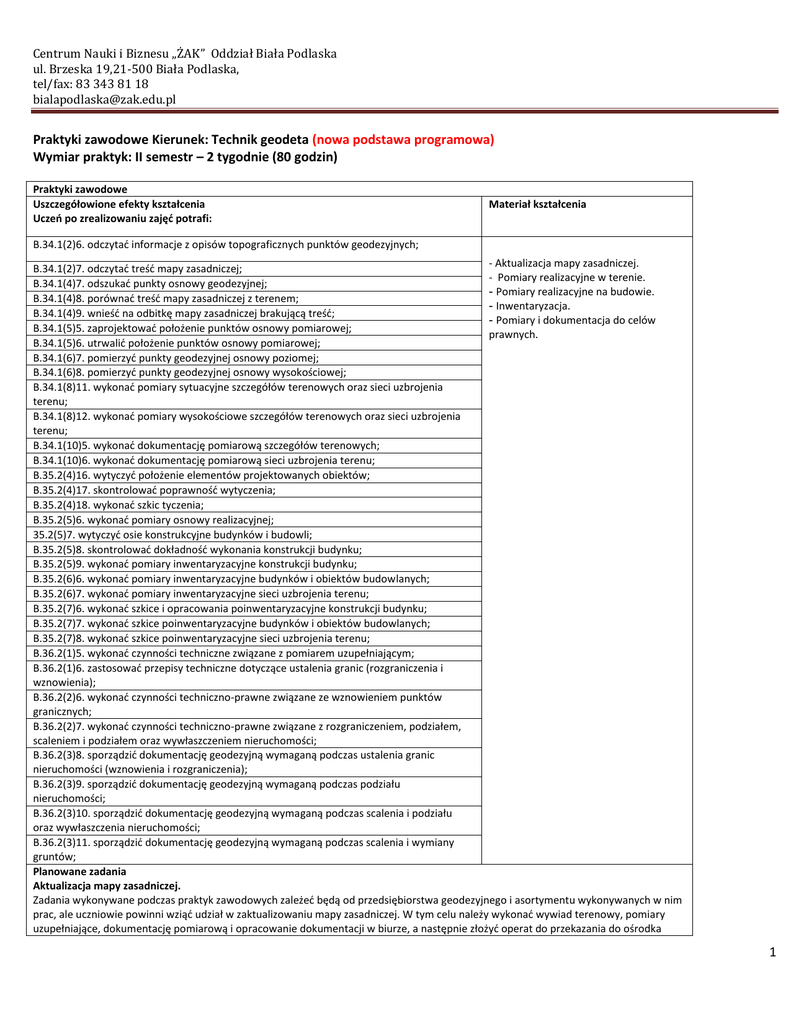 Centrum Nauki i Biznesu „ŻAK” Oddział Biała Podlaska ul. Brzeska 19,21-500 Biała Podlaska, tel/fax: 83 343 81 18 [email protected] Praktyki zawodowe Kierunek: Technik geodeta (nowa podstawa programowa) Wymiar praktyk: II semestr – 2 tygodnie (80 godzin) Praktyki zawodowe Uszczegółowione efekty kształcenia Uczeo po zrealizowaniu zajęd potrafi: Materiał kształcenia B.34.1(2)6. odczytad informacje z opisów topograficznych punktów geodezyjnych; - Aktualizacja mapy zasadniczej. B.34.1(2)7. odczytad treśd mapy zasadniczej; - Pomiary realizacyjne w terenie. B.34.1(4)7. odszukad punkty osnowy geodezyjnej; - Pomiary realizacyjne na budowie. B.34.1(4)8. porównad treśd mapy zasadniczej z terenem; - Inwentaryzacja. B.34.1(4)9. wnieśd na odbitkę mapy zasadniczej brakującą treśd; - Pomiary i dokumentacja do celów B.34.1(5)5. zaprojektowad położenie punktów osnowy pomiarowej; prawnych. B.34.1(5)6. utrwalid położenie punktów osnowy pomiarowej; B.34.1(6)7. pomierzyd punkty geodezyjnej osnowy poziomej; B.34.1(6)8. pomierzyd punkty geodezyjnej osnowy wysokościowej; B.34.1(8)11. wykonad pomiary sytuacyjne szczegółów terenowych oraz sieci uzbrojenia terenu; B.34.1(8)12. wykonad pomiary wysokościowe szczegółów terenowych oraz sieci uzbrojenia terenu; B.34.1(10)5. wykonad dokumentację pomiarową szczegółów terenowych; B.34.1(10)6. wykonad dokumentację pomiarową sieci uzbrojenia terenu; B.35.2(4)16. wytyczyd położenie elementów projektowanych obiektów; B.35.2(4)17. skontrolowad poprawnośd wytyczenia; B.35.2(4)18. wykonad szkic tyczenia; B.35.2(5)6. wykonad pomiary osnowy realizacyjnej; 35.2(5)7. wytyczyd osie konstrukcyjne budynków i budowli; B.35.2(5)8. skontrolowad dokładnośd wykonania konstrukcji budynku; B.35.2(5)9. wykonad pomiary inwentaryzacyjne konstrukcji budynku; B.35.2(6)6. wykonad pomiary inwentaryzacyjne budynków i obiektów budowlanych; B.35.2(6)7. wykonad pomiary inwentaryzacyjne sieci uzbrojenia terenu; B.35.2(7)6. wykonad szkice i opracowania poinwentaryzacyjne konstrukcji budynku; B.35.2(7)7. wykonad szkice poinwentaryzacyjne budynków i obiektów budowlanych; B.35.2(7)8. wykonad szkice poinwentaryzacyjne sieci uzbrojenia terenu; B.36.2(1)5. wykonad czynności techniczne związane z pomiarem uzupełniającym; B.36.2(1)6. zastosowad przepisy techniczne dotyczące ustalenia granic (rozgraniczenia i wznowienia); B.36.2(2)6. wykonad czynności techniczno-prawne związane ze wznowieniem punktów granicznych; B.36.2(2)7. wykonad czynności techniczno-prawne związane z rozgraniczeniem, podziałem, scaleniem i podziałem oraz wywłaszczeniem nieruchomości; B.36.2(3)8. sporządzid dokumentację geodezyjną wymaganą podczas ustalenia granic nieruchomości (wznowienia i rozgraniczenia); B.36.2(3)9. sporządzid dokumentację geodezyjną wymaganą podczas podziału nieruchomości; B.36.2(3)10. sporządzid dokumentację geodezyjną wymaganą podczas scalenia i podziału oraz wywłaszczenia nieruchomości; B.36.2(3)11. sporządzid dokumentację geodezyjną wymaganą podczas scalenia i wymiany gruntów; Planowane zadania Aktualizacja mapy zasadniczej. Zadania wykonywane podczas praktyk zawodowych zależed będą od przedsiębiorstwa geodezyjnego i asortymentu wykonywanych w nim prac, ale uczniowie powinni wziąd udział w zaktualizowaniu mapy zasadniczej. W tym celu należy wykonad wywiad terenowy, pomiary uzupełniające, dokumentację pomiarową i opracowanie dokumentacji w biurze, a następnie złożyd operat do przekazania do ośrodka 1 Centrum Nauki i Biznesu „ŻAK” Oddział Biała Podlaska ul. Brzeska 19,21-500 Biała Podlaska, tel/fax: 83 343 81 18 [email protected] powiatowego. Wykonane prace należy porównad z podanym wzorcem i dokonad samooceny prawidłowości wykonania zadania. Warunki osiągania efektów kształcenia w tym środki dydaktyczne, metody, formy organizacyjne Praktyki zawodowe mają na celu zapoznanie uczniów z praktycznym zastosowanie geodezji na terenie powiatu bądź województwa, w którym działa szkoła. Należy monitorowad działania uczniów wysyłanych na praktyki do firm i analizowad na przyszłośd korzyści płynące ze współpracy z przedsiębiorstwami geodezyjnymi. Uczniowie powinni zapoznad się praktyczną geodezją w możliwie najszerszym zakresie. Należy dopilnowad, żeby pracodawca umożliwił uczniom maksymalnie wykorzystad do nauki praktycznej czas spędzony w firmie. Środki dydaktyczne Sprzęt i oprogramowanie geodezyjne dostępne w firmie. Zalecane metody dydaktyczne Praktyczna praca pod kontrolą przedsiębiorcy. Formy organizacyjne Zespół: jeden uczeo i jeden bądź dwóch pracowników etatowych. Propozycje kryteriów oceny i metod sprawdzania efektów kształcenia Ocena prowadzącego o uczniu podana w formie opisowej każdej wykonywanej czynności i postępów. Ocena według skali ocen wystawiana przez opiekuna praktyk w szkole. Formy indywidualizacji pracy uczniów uwzględniające: - dostosowanie warunków, środków, metod i form kształcenia do potrzeb ucznia, - dostosowanie warunków, środków, metod i form kształcenia do możliwości ucznia. 2