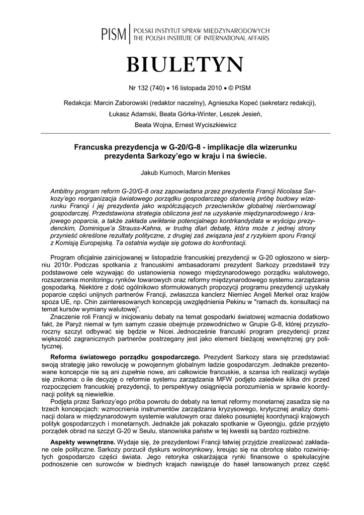 BIULETYN Nr 132 (740) 16 listopada 2010 © PISM Redakcja: Marcin Zaborowski (redaktor naczelny), Agnieszka Kopeć (sekretarz redakcji), Łukasz Adamski, Beata Górka-Winter, Leszek Jesień, Beata Wojna, Ernest Wyciszkiewicz Francuska prezydencja w G-20/G-8 - implikacje dla wizerunku prezydenta Sarkozy’ego w kraju i na świecie. Jakub Kumoch, Marcin Menkes Ambitny program reform G-20/G-8 oraz zapowiadana przez prezydenta Francji Nicolasa Sarkozy’ego reorganizacja światowego porządku gospodarczego stanowią próbę budowy wizerunku Francji i jej prezydenta jako współczujących przeciwników globalnej nierównowagi gospodarczej. Przedstawiona strategia obliczona jest na uzyskanie międzynarodowego i krajowego poparcia, a także zakłada uwikłanie potencjalnego kontrkandydata w wyścigu prezydenckim, Dominique’a Strauss-Kahna, w trudną dlań debatę, która może z jednej strony przynieść określone rezultaty polityczne, z drugiej zaś związana jest z ryzykiem sporu Francji z Komisją Europejską. Ta ostatnia wydaje się gotowa do konfrontacji. Program oficjalnie zainicjowanej w listopadzie francuskiej prezydencji w G-20 ogłoszono w sierpniu 2010r. Podczas spotkania z francuskimi ambasadorami prezydent Sarkozy przedstawił trzy podstawowe cele wzywając do ustanowienia nowego międzynarodowego porządku walutowego, rozszerzenia monitoringu rynków towarowych oraz reformy międzynarodowego systemu zarządzania gospodarką. Niektóre z dość ogólnikowo sformułowanych propozycji programu prezydencji uzyskały poparcie części unijnych partnerów Francji, zwłaszcza kanclerz Niemiec Angeli Merkel oraz krajów spoza UE, np. Chin zainteresowanych koncepcją uwzględnienia Pekinu w "ramach ds. konsultacji na temat kursów wymiany walutowej”. Znaczenie roli Francji w inicjowaniu debaty na temat gospodarki światowej wzmacnia dodatkowo fakt, że Paryż niemal w tym samym czasie obejmuje przewodnictwo w Grupie G-8, której przyszłoroczny szczyt odbywać się będzie w Nicei. Jednocześnie francuski program prezydencji przez większość zagranicznych partnerów postrzegany jest jako element bieżącej wewnętrznej gry politycznej. Reforma światowego porządku gospodarczego. Prezydent Sarkozy stara się przedstawiać swoją strategię jako rewolucję w powojennym globalnym ładzie gospodarczym. Jednakże prezentowane koncepcje nie są ani zupełnie nowe, ani całkowicie francuskie, a szansa ich realizacji wydaje się znikoma: o ile decyzję o reformie systemu zarządzania MFW podjęto zaledwie kilka dni przed rozpoczęciem francuskiej prezydencji, to perspektywy osiągnięcia porozumienia w sprawie koordynacji polityk są niewielkie. Podjęta przez Sarkozy’ego próba powrotu do debaty na temat reformy monetarnej zasadza się na trzech koncepcjach: wzmocnienia instrumentów zarządzania kryzysowego, krytycznej analizy dominacji dolara w międzynarodowym systemie walutowym oraz daleko posuniętej koordynacji krajowych polityk gospodarczych i monetarnych. Jednakże jak pokazało spotkanie w Gyeongju, gdzie przyjęto porządek obrad na szczyt G-20 w Seulu, stanowiska państw w tej kwestii są bardzo rozbieżne. Aspekty wewnętrzne. Wydaje się, że prezydentowi Francji łatwiej przyjdzie zrealizować zakładane cele polityczne. Sarkozy porzucił dyskurs wolnorynkowy, kreując się na obrońcę słabo rozwiniętych gospodarczo części świata. Jego retoryka oskarżająca rynki finansowe o spekulacyjne podnoszenie cen surowców w biednych krajach nawiązuje do haseł lansowanych przez część 2325 Polski Instytut Spraw Międzynarodowych środowisk lewicowych. Może to skłaniać do wniosku, że wykorzystując pozycję międzynarodową prezydent Francji usiłuje poprawić własny wizerunek. Wydaje się, że w ten sposób Sarkozy zmierza do realizacji dwóch celów na poziomie krajowym: zapewnienia bezpieczeństwa politycznego po prawej stronie sceny politycznej oraz do eliminacji głównego rywala spośród socjalistów Dominique’a Strauss-Kahna. Na wyborcach prawicowych Sarkozy usiłuje wywrzeć wrażenie polityka, który zwiększył francuskie wpływy na świecie, ograniczając tym samym pole manewru silnego kontrkandydata prawicy, zagorzałego krytyka Sarkozy’ego i byłego premiera Dominique’a de Villepin, który próbuje wrócić do głównego nurtu francuskiej polityki. De Villepin, kojarzony z francuskim sprzeciwem wobec amerykańskiej inwazji na Irak w 2003 r., będzie musiał się liczyć ze stratą istotnej część wyborców, jeśli Sarkozy zdecyduje się prezentować opinii publicznej jako równie zdeterminowany przeciwnik amerykańskiej dominacji w globalnym porządku gospodarczym. Tym niemniej główna batalia w wyborach prezydenckich rozegra się na polu rywalizacji z najniebezpieczniejszym kontrkandydatem Sarkozy’ego - socjalistą i dyrektorem zarządzającym MFW Dominique Strauss-Kahnem. Według ostatnich sondaży to właśnie były wykładowca akademicki i weteran francuskiej polityki, którego poparcie w drugiej turze wyborczej szacowane jest na 61%, stanowi największe zagrożenie dla urzędującego szefa państwa. Technokratyczne, centrowe poglądy Strauss-Kahna, gwarantujące wyraźną przewagę w wyborach prezydenckich, stanowią zarazem źródło jego słabości w prawyborach partyjnych w listopadzie 2011 roku. Wielu członków ugrupowania nie zechce głosować na kandydata, będącego zwolennikiem koncepcji monetaryzmu i kojarzonego z MFW – dla wielu symbolu światowego porządku neoliberalnego. Sarkozy może zatem dążyć do rozchwiania relacji między prezydencją G-20/G-8 a MFW, atakując Strauss-Kahna jako neoliberalnego obrońcę obecnego globalnego porządku gospodarczego i tym samym pozbawiając go poparcia lewicującego elektoratu Partii Socjalistycznej. Pozostali kontrkandydaci socjalistyczni – pierwszy sekretarz partii, Martine Aubry, a tym bardziej Ségolene Royal, rywalka w ostatnich wyborach prezydenckich – nie powinni stanowić p