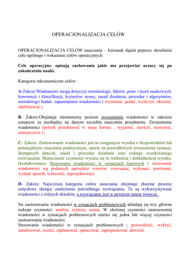 OPERACJONALIZACJA CELÓW OPERACJONALIZACJA CELÓW nauczania – kierunek dążeń poprzez określenie celu ogólnego i wskazanie celów operacyjnych. Cele operacyjne- opisują zachowania jakie ma przejawiać uczacy się po zakończeniu nauki. Kategorie taksonomiczne celów: A-Zakres:Wiadomości mogą dotyczyć terminologii, faktów, praw i teorii naukowych, konwencji i klasyfikacji, kryteriów oceny, zasad działania, procedur i algorytmów, metodologii badań. zapamiętanie wiadomości ( wymienić, podać, wyliczyć, okreslić, zdefiniować ). B- Zakres:Obejmuje elementarny poziom zrozumienia wiadomości w zakresie uznanym za niezbędny na danym szczeblu nauczania przedmiotu. Zrozumienie wiadomości (potrafi przedstawić w innej formie , wyjaśnić, streścić, rozróznić, umiejscowić ). C- Zakres: Zastosowanie wiadomości jest to osiągnięcie wyniku o bezpośrednim lub potencjalnym znaczeniu praktycznym, oparte na prawidłowym zrozumieniu sytuacji, dostępnych danych, zasad i procedur działania oraz rodzaju oczekiwanego rozwiązania. Skuteczność czynności wyraża się tu trafnością i dokładnością wyniku. (kształtowanie). Stosowanie wiadomości w sytuacjach typowych ( stosowanie wiadomości wg podanych uprzednio wzorów: rozwiązać, wykonać, porównać, wybrać sposób, wykreslić, zaprojektować). D- Zakres: Najwyższa kategoria celów nauczania obejmuje złożone procesy umysłowe służące znalezieniu potrzebnego rozwiązania. Tu są wykorzystywane wiadomości z różnych dziedzin, a rozwiązanie jest w pewnym sensie twórcze. Na zastosowanie wiadomości w sytuacjach problemowych składają się trzy główne rodzaje czynności: analiza, synteza, ocena. W złożonej czynności zastosowania wiadomości w sytuacjach problemowych mieści się jedna lub więcej czynności zastosowania wiadomości. Stosowanie wiadomości w sytuacjach problemowych ; przewidzieć, wykryć, zanalizować, ocenić, zaplanować, opracować, zaproponować, dowieść.