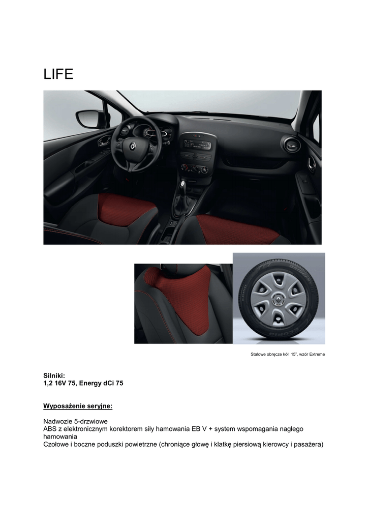 LIFE Stalowe obręcze kół 15”, wzór Extreme Silniki: 1,2 16V 75, Energy dCi 75 Wyposażenie seryjne: Nadwozie 5-drzwiowe ABS z elektronicznym korektorem siły hamowania EB V + system wspomagania nagłego hamowania Czołowe i boczne poduszki powietrzne (chroniące głowę i klatkę piersiową kierowcy i pasażera) System dynamicznej kontroli toru jazdy ESC z systemem zapobiegania poślizgowi kół ASR System wspomagania ruszania pod górę (Hill Start Assist) Regulator – ogranicznik prędkości Komputer pokładowy Zespół wskaźników analogowo-cyfrowych Karta Renault (umożliwiająca włączanie silnika oraz otwieranie/zamykanie drzwi) Centralny zamek drzwi zdalnie sterowany Kartą Renault System Renault BASS REFLEX® Fotel kierowcy z regulacją wysokości Zagłówki przednie z regulacją wysokości Kierownica z regulacją wysokości i głębokości Światła do jazdy dziennej z diodami LED Elektrycznie regulowane szyby przednie Tylne szyby regulowane manualnie Lusterka boczne regulowane elektrycznie w czarnej obudowie o ziarnistej fakturze Instalacja do montażu radioodtwarzacza Przykrycie części bagażowej Przegroda oddzielająca część pasażerską od bagażowej Zestaw do naprawy opon Przednia listwa z logo Renault w kolorze lśniącej czerni Boczne listwy ochronne oraz listwa zderzaka w kolorze czarnym o ziarnistej fakturze Wewnętrzne klamki drzwi chromowane Tapicerka materiałowa czarno-czerwona Stalowe obręcze kół 15 Wzór stalowych felg 15” Extreme Opcje: Pakiet Klimat: klimatyzacja manualna i radioodtwarzacz 4x20 W, z Bluetooth®, USB i jack Pakiet Komfort: klimatyzacja manualna, system multimedialny Media Nav Evolution z ekranem dotykowym 7", nawigacją, radioodtwarzaczem z Bluetooth®, USB i Jack oraz Bass Reflex Pakiet Plus: światła przeciwmgłowe, wycieraczki przednie o zmiennej częstotliwości pracy Koło zapasowe DOSTĘPNE KOLORY: Szary Kasjopea, Czerwony Flamme, Szary Platynowy, Czarny Etoile, Brązowy Ardent , Kość Słoniowa, Biel Alpejska WYMIARY CLIO SOCIETE WYMIARY (mm) A Rozstaw osi 2589 B Długość całkowita 4063 C Przedni zwis 853 D Tylny zwis 621 E' Rozstaw kół przednich ( koła 15") 1509 F' Rozstaw kół tylnych ( koła 15") 1513 G Szerokość całkowita/ z rozłożonymi lusterkami wstecznymi H Wysokość pojazdu nieobciążonego H1 Wysokość z otwartą klapą pojazdu nieobciążonego J Wysokość progu bagażnika pojazdu nieobciążonego 1732 / 1945 1448 1920 716 K Prześwit pojazdu obciążonego ≥120 M Szerokość nad przednimi podłokietnikami 1363 N Szerokość na wysokości przednich podłokietników 1370 P Odległość od siedzenia do dachu pod kątem 14° na przednich siedzeniach Y Szerokość otworu bagażnika u góry Maksymnalna szerokość bagażnika 770 1038 Y1 Szerokość otworu bagażnika u dołu 905 Y2 Szerokość wewnętrzna między wnękami kół Z Wysokość otworu bagażnika Z1 Maksymalna długość bagażnika (od tylnej klapy, do przegrody ) Z3 Wysokość pod tylną półką 880 1011 550 1245 538 POJEMNOŚĆ BAGAŻNIKA (dm3) Pojemność VDA (norma ISO 3832) (do wysokości tylnej półki) 563 Pojemność maksymalna (do wysokości dachu) 911
