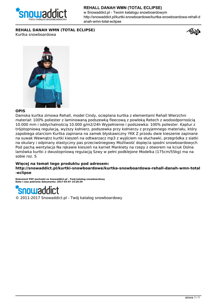 REHALL DANAH WMN (TOTAL ECLIPSE) w Snowaddict.pl - Twoim katalogu snowboardowym http://snowaddict.pl/kurtki-snowboardowe/kurtka-snowboardowa-rehall-d anah-wmn-total-eclipse REHALL DANAH WMN (TOTAL ECLIPSE) Kurtka snowboardowa OPIS Damska kurtka zimowa Rehall, model Cindy, ocieplana kurtka z elementami Rehall Wierzchni materiał: 100% poliester z laminowaną podszewką fleecową z powłoką Retech z wodoodpornością 10.000 mm i oddychalnością 10.000 g/m2/24h Wypełnienie i podszewka: 100% poliester. Kaptur z trójstopniową regulacją, wyższy kołnierz, podszewka przy kołnierzu z przyjemnego materiału, który zapobiega otarciom Kurtka zapinana na zamek błyskawiczny YKK Z przodu dwie kieszenie zapinane na suwak Wewnątrz kurtki kieszeń na odtwarzacz mp3 z wyjściem na słuchawki, przegródka z siatki na okulary i odpinany elastyczny pas przeciwśniegowy Możliwość dopięcia spodni snowboardowych Pod pachą wentylacja Na rękawie kieszeń na karnet Mankiety na rzepy z otworem na kciuk Dolna lamówka kurtki z dwustopniową regulacją Szwy w pełni podklejone Modelka (175cm/55kg) ma na sobie roz. S Więcej na temat tego produktu pod adresem: http://snowaddict.pl/kurtki-snowboardowe/kurtka-snowboardowa-rehall-danah-wmn-total -eclipse Dokument PDF pochodzi ze Snowaddict.pl - Twój katalog snowboardowy Data i czas pobrania dokumentu: 2017-03-07 14:28:39 © 2011-2017 Snowaddict.pl - Twój katalog snowboardowy strona 1 / 1 Powered by TCPDF (www.tcpdf.org)