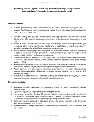 Zał. nr 12 Statutu ZSP nr 4 w Gliwicach Procedury kontroli i egzekucji realizacji obowiązku rocznego przygotowania przedszkolnego/ obowiązku szkolnego i obowiązku nauki Podstawa Prawna. Ustawa o systemie oświaty z dnia 7 września 1991 r. (Dz. U. 2004 r. Nr 256 poz. 2572 z późn. zm.). Ustawa z dnia 17 czerwca 1966 r. o postępowaniu egzekucyjnym w administracji (tekst jednolity Dz. U. z 2012 r. poz. 1015 z późn. zm.). 1. Obowiązek szkolny rozpoczyna się z początkiem roku szkolnego w tym roku kalendarzowym, w którym dziecko kończy 5 lat, oraz trwa do ukończenia gimnazjum, nie dłużej jednak niż do ukończenia 18 roku życia. 2. Dziecko w wieku 5 lat oraz dziecko 6-letnie, które nie rozpoczęło nauki w szkole podstawowej, jest obowiązane odbyć roczne przygotowanie przedszkolne w przedszkolu, w oddziale przedszkolnym w szkole podstawowej albo w innej formie wychowania przedszkolnego. 3. Rodzice dziecka podlegającego w/w obowiązkowi są obowiązani dopełnić czynności związanych ze zgłoszeniem dziecka do szkoły, przedszkola, oddziału przedszkolnego zorganizowanego w szkole podstawowej lub innej formy wychowania przedszkolnego. 4. Kontrolowanie spełniania obowiązku, o którym mowa należy do zadań dyrektora szkoły podstawowej, w obwodzie, której dziecko mieszka, gmina kontroluje spełnianie obowiązku nauki przez młodzież w wieku 16-18 lat. 5. Niespełnianie obowiązku rocznego przygotowania przedszkolnego/ obowiązku szkolnego lub obowiązku nauki podlega egzekucji w trybie przepisów o postępowaniu egzekucyjnym w administracji. 6. Przez niespełnianie obowiązku rocznego przygotowania przedszkolnego i obowiązku szkolnego należy rozumieć nieusprawiedliwioną nieobecność w okresie jednego miesiąca, na co najmniej 50% obowiązkowych zajęć. 7. Uprawnionym do złożenia wniosku o wszczęcie egzekucji jest dyrektor szkoły zobowiązany do kontroli obowiązku rocznego przygotowania szkolnego lub obowiązku szkolnego. Obowiązki rodziców. 1. Dopełnienia czynności związanych ze zgłoszeniem dziecka do szkoły/ przedszkola/ oddziału przedszkolnego. 2. Zapewnienia regularnego uczęszczania dziecka na zajęcia szkolne. 3. Informowania, w terminie do dnia 30 września każdego roku, dyrektora szkoły podstawowej lub gimnazjum, w obwodzie, których dziecko mieszka, o realizacji obowiązku szkolnego w szkole za granicą lub przy przedstawicielstwie dyplomatycznym innego państwa w Polsce. 4. Zapewnienie dziecku realizującemu obowiązek szkolny poza szkołą, warunków nauki określonych w zezwoleniu udzielonym przez dyrektora 5. Usprawiedliwianie na bieżąco nieobecności dziecka w szkole ( w terminie do 3 dni od ostatniego dnia nieobecności) Zał. nr 12 Statutu ZSP nr 4 w Gliwicach Strona 1 z 3 Zał. nr 12 Statutu ZSP nr 4 w Gliwicach Obowiązki nauczycieli 1. Systematycznie ( na każdych zajęciach) sprawdza obecność uczniów. 2. Odnotowuje każdą nieobecność ucznia na prowadzonych przez siebie zajęciach. 3. Zgłasza wychowawcy klasy wszystkie próby unikania przez ucznia określonych zajęc dydaktycznych. (Najpóźniej w dniu następnym) Obowiązki wychowawcy 1. Wychowawca jest zobowiązany do sprawdzenia przyczyn nieobecności dziecka czwartego dnia od chwili nieobecności. 2. Jeżeli nieobecności nie zostaną usprawiedliwione w wyznaczonym terminie, wychowawca powiadamia o nieobecnościach rodziców/prawnych opiekunów ucznia. ( do trzech dni od daty ostatniego dnia nieobecności) 3. Informacja może być przekazana telefonicznie lub listownie. Rodzice mogą też być poproszeni o zgłoszenie się do szkoły w celu wyjaśnienia przyczyn nieobecności dziecka. (w trybie natychmiastowym) 4. W przypadku braku współpracy rodzica (opiekuna) z wychowawcą zgłasza fakt pedagogowi szkolnemu (w trybie natychmiastowym). Obowiąki pedagoga Pedagog sprawdza przyczyny nieobecności ucznia poprzez: Rozmowę z rodzicami ucznia na terenie szkoły, Wywiad przeprowadzony przez Policję. Wychowawca, pedagog szkolny oraz rodzice ucznia podejmują wspólne działania zaradcze w celu regularnego realizowania obowiązku szkolnego przez danego ucznia. Po wyczerpaniu wszystkich możliwych działań szkoły – dyrektor podejmuje następujące czynności: 1. Kieruje do rodziców dziecka upomnienie zawierające: stwierdzenie, że obowiązek szkolny nie jest realizowany, wezwanie do posyłania dziecka do szkoły z wyznaczeniem terminu, informację, że niespełnianie obowiązku jest zagrożone skierowaniem sprawy na drogę postępowania egzekucyjnego. Dla celów dowodowych konieczne jest takie doręczenie upomnienia, aby można było ustalić dzień, w którym doręczenie nastąpiło, czyli za zwrotnym potwierdzeniem odbioru. 2. W przypadku konieczności skierowania sprawy na drogę egzekucji administracyjnej (niezastosowania się do wezwania mimo upływu terminu określonego w upomnieniu, czyli w dalszym ciągu nie realizowania przez dziecko obowiązku szkolnego) – po upływie 7 dni, od dnia doręczenia upomnienia wystawia WNIOSEK O WSZCZĘCIE EGZEKUCJI ADMINISTRACYJNEJ do organu jednostki samorządu terytorialnego wraz z tytułem wykonawczym i dowodem doręczenia upomnienia. Na podstawie art.20 1pkt 2 ustawy o postępowaniu egzekucyjnym w administracji organem egzekucyjnym jest właściwy organ jednostki samorządu terytorialnego, a więc Prezydent Miasta Gliwice. Zał. nr 12 Statutu ZSP nr 4 w Gliwicach Strona 2 z 3 Zał. nr 12 Statutu ZSP nr 4 w Gliwicach Podjęte działania 1. Systematyczna kontrola obecności ucznia na zajęciach szkolnych 2. Rozmowa wyjaśniająca wychowawcy z uczniem: ustalenie przyczyn nieobecności objęcie ucznia pomocą (opieka świetlicy, pomoc w nauce, zaj. dyd - wyr., dożywianie itp.) powiadomienie rodziców 3. 4. Rozmowa dyscyplinująca z uczniem: przypomnienie wniosków z poprzedniej rozmowy poinformowanie o konsekwencjach nierealizowania obowiązku szkolnego określenie konsekwencji (zgodnych z Regulaminem Zachowania i Statutem 