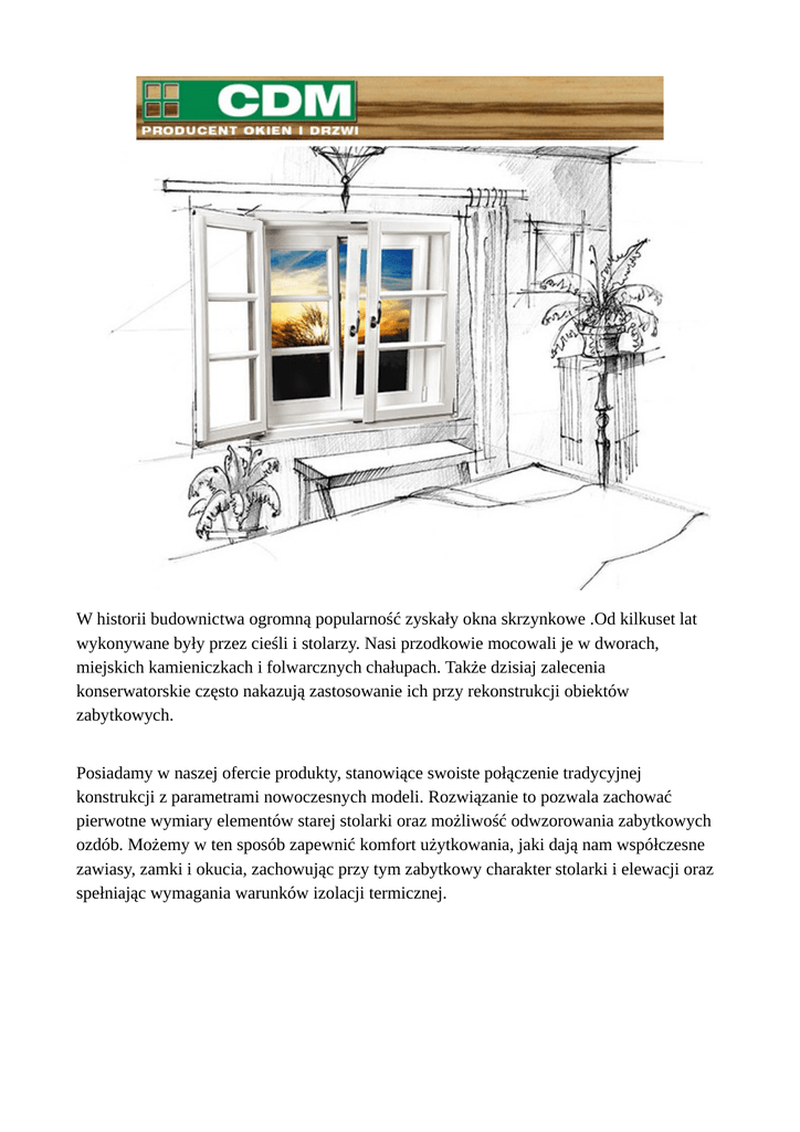 W historii budownictwa ogromną popularność zyskały okna skrzynkowe .Od kilkuset lat wykonywane były przez cieśli i stolarzy. Nasi przodkowie mocowali je w dworach, miejskich kamieniczkach i folwarcznych chałupach. Także dzisiaj zalecenia konserwatorskie często nakazują zastosowanie ich przy rekonstrukcji obiektów zabytkowych. Posiadamy w naszej ofercie produkty, stanowiące swoiste połączenie tradycyjnej konstrukcji z parametrami nowoczesnych modeli. Rozwiązanie to pozwala zachować pierwotne wymiary elementów starej stolarki oraz możliwość odwzorowania zabytkowych ozdób. Możemy w ten sposób zapewnić komfort użytkowania, jaki dają nam współczesne zawiasy, zamki i okucia, zachowując przy tym zabytkowy charakter stolarki i elewacji oraz spełniając wymagania warunków izolacji termicznej.