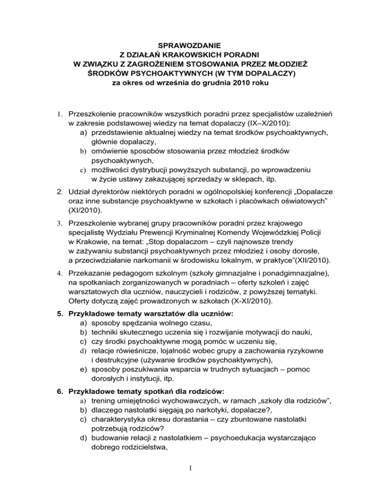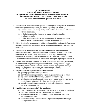 SPRAWOZDANIE Z DZIAŁAŃ KRAKOWSKICH PORADNI W ZWIĄZKU Z ZAGROŻENIEM STOSOWANIA PRZEZ MŁODZIEŻ ŚRODKÓW PSYCHOAKTYWNYCH (W TYM DOPALACZY) za okres od września do grudnia 2010 roku 1. Przeszkolenie pracowników wszystkich poradni przez specjalistów uzależnień w zakresie podstawowej wiedzy na temat dopalaczy (IX–X/2010): a) przedstawienie aktualnej wiedzy na temat środków psychoaktywnych, głównie dopalaczy, b) omówienie sposobów stosowania przez młodzież środków psychoaktywnych, c) możliwości dystrybucji powyższych substancji, po wprowadzeniu w życie ustawy zakazującej sprzedaży w sklepach, itp. 2. Udział dyrektorów niektórych poradni w ogólnopolskiej konferencji „Dopalacze oraz inne substancje psychoaktywne w szkołach i placówkach oświatowych” (XI/2010). 3. Przeszkolenie wybranej grupy pracowników poradni przez krajowego specjalistę Wydziału Prewencji Kryminalnej Komendy Wojewódzkiej Policji w Krakowie, na temat: „Stop dopalaczom – czyli najnowsze trendy w zażywaniu substancji psychoaktywnych przez młodzież i osoby dorosłe, a przeciwdziałanie narkomanii w środowisku lokalnym, w praktyce”(XII/2010). 4. Przekazanie pedagogom szkolnym (szkoły gimnazjalne i ponadgimnazjalne), na spotkaniach zorganizowanych w poradniach – oferty szkoleń i zajęć warsztatowych dla uczniów, nauczycieli i rodziców, z powyższej tematyki. Oferty dotyczą zajęć prowadzonych w szkołach (X-XI/2010). 5. Przykładowe tematy warsztatów dla uczniów: a) sposoby spędzania wolnego czasu, b) techniki skutecznego uczenia się i rozwijanie motywacji do nauki, c) czy środki psychoaktywne mogą pomóc w uczeniu się, d) relacje rówieśnicze, lojalność wobec grupy a zachowania ryzykowne i destrukcyjne (używanie środków psychoaktywnych), e) sposoby poszukiwania wsparcia w trudnych sytuacjach – pomoc dorosłych i instytucji, itp. 6. Przykładowe tematy spotkań dla rodziców: a) trening umiejętności wychowawczych, w ramach „szkoły dla rodziców”, b) dlaczego nastolatki sięgają po narkotyki, dopalacze?, c) charakterystyka okresu dorastania – czy zbuntowane nastolatki potrzebują rodziców? d) budowanie relacji z nastolatkiem – psychoedukacja wystarczająco dobrego rodzicielstwa, 1 e) stałe dyżury pracowników poradni w szkołach, pozwalające na bezpośredni kontakt i przekaz informacji dla rodziców, itp. 7. Przykładowe tematy spotkań dla nauczycieli: a) sytuacje kryzysowe w szkole – procedury zachowania i reagowania w sytuacjach trudnych, b) zjawisko subkultur młodzieżowych – charakterystyka wybranych grup, ryzyko stosowania środków psychoaktywnych, zachowania dorosłych wobec uczniów z kręgów subkultury. c) pomoc w tworzeniu scenariuszy lekcji o tematyce profilaktycznej (zwłaszcza dotyczącej dopalaczy), itp. 8. Dyrektorzy wszystkich poradni uzgodnili, że na stronach internetowych swoich placówek umieszczą jednakowe dane na temat instytucji udzielających pomocy osobom uzależnionym i zagrożonych uzależnieniem (w tym dopalaczami): a) Krakowskie Centrum Terapii Uzależnień, Kraków, ul. Wielicka 73, tel. 12/4255747, b) Punkt Konsultacyjny „MONAR”, Kraków, ul. Św. Katarzyny 3, tel. 12 4306135, c) Ośrodek Interwencji Kryzysowej, Kraków, ul. Radziwiłłowska 8b, tel. 12 4219282, d) Telefon Zaufania – ogólny: 12 4137133, e) Telefon Zaufania – Młodzieżowy: 19288, 9. W celu podniesienia skuteczności działań profilaktycznych w szkołach, związanych z zagrożeniem „dopalaczami” – warto powyższą bazę uzupełnić o adres strony internetowej Krajowego Biura ds. Przeciwdziałania Narkomanii w zakładce poświęconej dopalaczom: http://www.dopalaczeinfo.pl Ponadto wiele wskazówek dla rodziców i wychowawców szkolnych zawiera internetowy poradnik „Bliżej siebie, dalej od narkotyków” – zamieszczony pod adresem: http://www.kbpn.gov.pl/portal?id=112271 10. Szczegółowe oferty zajęć warsztatowych, szkoleń i spotkań w zakresie powyższej problematyki są umieszczone na stronach internetowych poszczególnych poradni i znane są szkołom. 11. Omawiane powyżej działania realizowane są w ramach całorocznej współpracy poradni ze szkołami. Ważnym aktem prawnym i źródłem informacji o zapobieganiu i leczeniu narkomanii oraz nielegalnych środkach i substancjach jest Ustawa o przeciwdziałaniu narkomanii z dnia 29 lipca 2005 r. (Dz. U. z 2005 r., Nr 179; poz. 1486, z późn. zm.). 2
