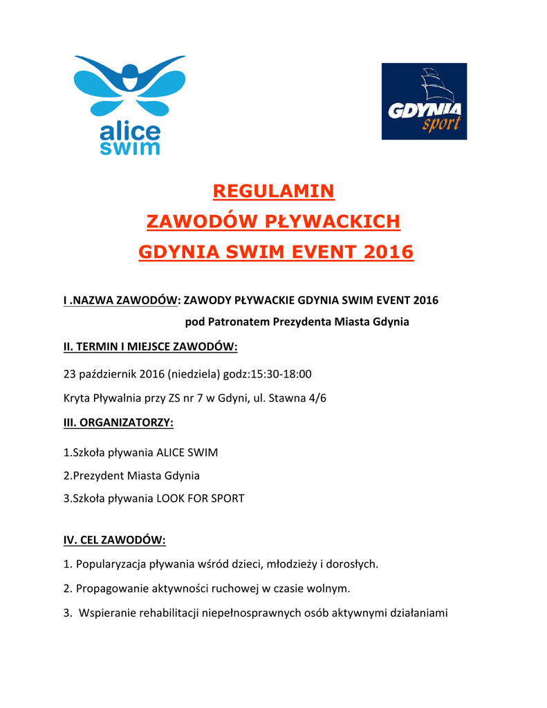 REGULAMIN ZAWODÓW PŁYWACKICH GDYNIA SWIM EVENT 2016 I.NAZWAZAWODÓW:ZAWODYPŁYWACKIEGDYNIASWIMEVENT2016 podPatronatemPrezydentaMiastaGdynia II.TERMINIMIEJSCEZAWODÓW: 23październik2016(niedziela)godz:15:30-18:00 KrytaPływalniaprzyZSnr7wGdyni,ul.Stawna4/6 III.ORGANIZATORZY: 1.SzkołapływaniaALICESWIM 2.PrezydentMiastaGdynia 3.SzkołapływaniaLOOKFORSPORT IV.CELZAWODÓW: 1. Popularyzacjapływaniawśróddzieci,młodzieżyidorosłych. 2. Propagowanieaktywnościruchowejwczasiewolnym. 3. Wspieranierehabilitacjiniepełnosprawnychosóbaktywnymidziałaniami V.ZASADYUCZESTNICTWA: Wzawodachmogąuczestniczyć:dzieci,młodzieżidorośli. Zgłoszenia do zawodów należy wysłać drogą mailową na adres [email protected].(piątek)dogodziny18.00. Organizatorzastrzegasobieprawozamknięcialistyzgłoszeńprzedterminem. Liczbamiejscograniczona,decydujekolejnośćzgłoszeń. KażdyzawodnikpowinienposiadaćwypełnionąKartęStartową (drukwzałączeniu). Karta startowa winna być podpisana przez rodzica lub opiekuna. Jest to jednoznaczne ze zgodą na udział w zawodach oraz potwierdzeniem braku przeciwwskazańzdrowotnych. Wypełnioną i podpisaną Kartę Startową zawodnik wręcza sędziemu rozprowadzającemubezpośrednioprzedstartem. WPISOWE:30zł/każdyuczestnikzawodów:płatnewsekretariaciezawodów Wcałościprzeznaczonenacelecharytatywne. VI.PROGRAMZAWODÓW: Kategoria I -rocznik 2009 i młodsi 15:20 wejście do szatni 15:30-16:10 konkurencje pływackie, wręczenie nagród *25m stylem dowolnym dziewcząt i chłopców- start z wody (możliwość korzystania z przyborów pływackich) Kategoria II- rocznik 2008-2007 16:00 wejście do szatni 16:10-16:40 konkurencje pływackie, wręczenie nagród *25m stylem dowolnym dziewcząt i chłopców - start z wody lub ze słupka startowego (możliwość korzystania z przyborów pływackich) Pokazy pływaia sportowego trenerów i zawodników UKS Lokomotywa Sopot SZTAFETA TRENERZY 4x50m vs. ZAWODNICY UKS LOKOMOTYWA 8x25m SZTAFETA RODZINNA :RODZIC+ DZIECKO 16:10 wejście do szatni 16:20-16:45 konkurencje pływackie, wręczenie nagród 50 m stylem dowolnym (każdy 25 m płynie) *25 m płynie dziecko, 25 m płynie rodzic: start w dowolny sposób (możliwość korzystania z przyborów pływackich) Kategoria III- rocznik 2006-2005 Kategoria IV-rocznik 2004-2003 Kategoria V- rocznik 2002 i starsi 16:35 wejście do szatni 16:40-17:25 konkurencje pływackie, wręczenie nagród *50m stylem dowolnym dziewcząt i chłopców - start ze słupka startowego VII.NAGRODY: 1. Pierwszych trzech zawodników i zawodniczek w poszczególnych kategoriachwiekowychzostanienagrodzonychpamiątkowymipucharami. 2. Każdyuczestnikzawodówotrzymapamiątkowymedal. 3. WkategoriiIII,IV,Vklasyfikacjamedalowaprowadzonabędziezpodziałem na profesjonalistów (zawodnicy posiadający licencję PZP) oraz amatorów ( zawodnicynieposiadającylicencjiPZP). 4. Dekoracjeuczestnikówzawodówodbywaćsiębędąwprzerwachpomiędzy kolejnymikonkurencjami. VIII.PRZEPISYTECHNICZNE: Zawodyodbędąsięnapływalni25metrowejwedługprzepisówFINA. Zawodyrozgrywanebędąseriaminaczas.Wniektórychprzypadkach sędziowiemogąodstąpićodrygorystycznegoprzestrzeganiaprzepisów. Wszystkieprotestymogąbyćzgłaszanedomomenturozpoczęciadekoracji. Ostatecznądecyzjęwewszystkichsprawachspornychdotyczących przebiegurywalizacjiorazinterpretacjiregulaminupodejmujesędziagłówny zawodów. Kompletwynikówopublikowanyzostanienastępnegodnianastronie: www.facebook.com/szkola.plywania.Alice.Swim IX.KOMISJASĘDZIOWSKA: TrenerzyALICESWIMorazTrenerzyLOOKFORSPORT SĘDZIAGŁÓWNY:JarosławGawlik X.ZGŁOSZENIA: Imięinazwiskodziecka/Rodzica/sztafety+rocznikurodzeniakażdegouczestnika e-mail:[email protected] tel:0-501-518-461 SERDECZNIEZAPRASZAMY!!!