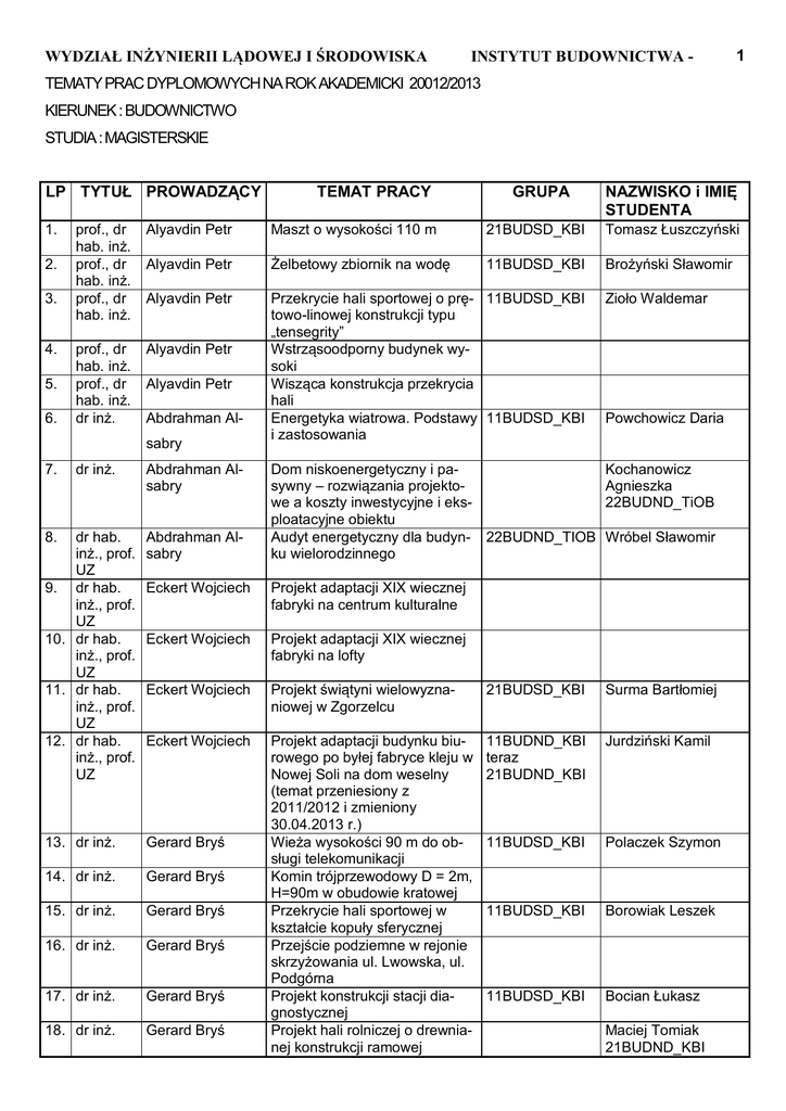 WYDZIAŁ INŻYNIERII LĄDOWEJ I ŚRODOWISKA INSTYTUT BUDOWNICTWA - 1 TEMATY PRAC DYPLOMOWYCH NA ROK AKADEMICKI 20012/2013 KIERUNEK : BUDOWNICTWO STUDIA : MAGISTERSKIE LP TYTUŁ PROWADZĄCY 1. 2. 3. 4. 5. 6. GRUPA NAZWISKO i IMIĘ STUDENTA prof., dr hab. inż. prof., dr hab. inż. prof., dr hab. inż. Alyavdin Petr Maszt o wysokości 110 m 21BUDSD_KBI Tomasz Łuszczyński Alyavdin Petr Żelbetowy zbiornik na wodę 11BUDSD_KBI Brożyński Sławomir Alyavdin Petr Zioło Waldemar prof., dr hab. inż. prof., dr hab. inż. dr inż. Alyavdin Petr Przekrycie hali sportowej o prę- 11BUDSD_KBI towo-linowej konstrukcji typu „tensegrity” Wstrząsoodporny budynek wysoki Wisząca konstrukcja przekrycia hali Energetyka wiatrowa. Podstawy 11BUDSD_KBI i zastosowania Dom niskoenergetyczny i pasywny – rozwiązania projektowe a koszty inwestycyjne i eksploatacyjne obiektu Audyt energetyczny dla budyn- 22BUDND_TIOB ku wielorodzinnego Kochanowicz Agnieszka 22BUDND_TiOB Alyavdin Petr Abdrahman Alsabry 7. TEMAT PRACY dr inż. 8. Abdrahman Alsabry dr hab. inż., prof. UZ 9. dr hab. inż., prof. UZ 10. dr hab. inż., prof. UZ 11. dr hab. inż., prof. UZ 12. dr hab. inż., prof. UZ Abdrahman Alsabry 13. dr inż. Gerard Bryś 14. dr inż. Gerard Bryś 15. dr inż. Gerard Bryś 16. dr inż. Gerard Bryś 17. dr inż. Gerard Bryś 18. dr inż. Gerard Bryś Powchowicz Daria Wróbel Sławomir Eckert Wojciech Projekt adaptacji XIX wiecznej fabryki na centrum kulturalne Eckert Wojciech Projekt adaptacji XIX wiecznej fabryki na lofty Eckert Wojciech Projekt świątyni wielowyznaniowej w Zgorzelcu 21BUDSD_KBI Surma Bartłomiej Eckert Wojciech Projekt adaptacji budynku biurowego po byłej fabryce kleju w Nowej Soli na dom weselny (temat przeniesiony z 2011/2012 i zmieniony 30.04.2013 r.) Wieża wysokości 90 m do obsługi telekomunikacji Komin trójprzewodowy D = 2m, H=90m w obudowie kratowej Przekrycie hali sportowej w kształcie kopuły sferycznej Przejście podziemne w rejonie skrzyżowania ul. Lwowska, ul. Podgórna Projekt konstrukcji stacji diagnostycznej Projekt hali rolniczej o drewnianej konstrukcji ramowej 11BUDND_KBI teraz 21BUDND_KBI Jurdziński Kamil 11BUDSD_KBI Polaczek Szymon 11BUDSD_KBI Borowiak Leszek 11BUDSD_KBI Bocian Łukasz Maciej Tomiak 21BUDND_KBI WYDZIAŁ INŻYNIERII LĄDOWEJ I ŚRODOWISKA INSTYTUT BUDOWNICTWA - 2 TEMATY PRAC DYPLOMOWYCH NA ROK AKADEMICKI 20012/2013 KIERUNEK : BUDOWNICTWO STUDIA : MAGISTERSKIE LP TYTUŁ PROWADZĄCY 19. dr inż. 20. dr inż. 21. dr inż. 22. dr inż. 23. dr inż. 24. dr inż. 25. dr inż. 26. dr inż. 27. dr inż. 28. dr inż. 29. dr inż. 30. dr inż. 31. dr inż. 32. dr inż. TEMAT PRACY Grochowska Elż- Projekt konstrukcji oraz bieta Rozwiązanie architektonicz- no-funkcjonalne hali magazynowo-produkcyjnej z zapleczem socjalnoadministracyjnym Grochowska Elż- Projekt konstrukcji dwunabieta wowej hali stalowej wyposażonej w suwnicę Grochowska Projekt hali produkcyjnej Elżbieta wraz z częścią biurowosocjolną w konstrukcji mieszanej Grochowska Projekt handlowego obiektu Elżbieta w konstrukcji stalowej Grochowska Projekt dobudowy nowego Elżbieta pawilonu Szpitala WSS P ZOZ w Nowej Soli Grochowska Projekt obiektu handlowoElżbieta rozrywkowego Adaptacja targowiska przy ul Owocowej w Zielonej Górze na obiekt handloworozrywkowy. Grochowska Projekt kompleksu hal proElżbieta dukcyjno-montażowych z pośrednią wiatą załadunkową wyposażonych w suwnice Grochowska Elż- Projekt konstrukcji budynku bieta szkoły podstawowej Kaliszuk Joanna Projekt architektoniczno – konstrukcyjny pięciokondygnacyjnego garażu. Korentz Jacek Projekt konstrukcji 10 kondygnacyjnego budynku domu studenta Korentz Jacek Projekt budynku biurowomieszkalnego o konstrukcji słupowo-płytowej Korentz Jacek Projekt konstrukcji krytego basenu pływackiego Korentz Jacek Projekt budynku biurowego w zabudowie zwartej o konstrukcji słupowo-płytowej Korentz Jacek Projekt konstrukcji winnicy spełniającej funkcje produk- GRUPA NAZWISKO i IMIĘ STUDENTA 11BUDSD_KBI Orlicki Krzysztof 11BUDSD_KBI Zalewska Joanna Aanna Kornik Grzegorz 11BUDSD_KBI 21BUDND_KBI 21BUDND_KBI Przybysz Przemysław Gembara Sebastian 11BUDSD_KBI Horodyska Marta 11BUDSD_KBI Kucharczyk Anna 11BUDSP_KBI Meyer Wiktor 11BUDSD_KBI Wojtyła Małgorzata 11BUDND_KBI Bobek Agnieszka 11BUDSD_KBI Wróblewski Marcin WYDZIAŁ INŻYNIERII LĄDOWEJ I ŚRODOWISKA INSTYTUT BUDOWNICTWA - 3 TEMATY PRAC DYPLOMOWYCH NA ROK AKADEMICKI 20012/2013 KIERUNEK : BUDOWNICTWO STUDIA : MAGISTERSKIE LP TYTUŁ PROWADZĄCY 33. dr inż. Korentz Jacek 34. dr inż. Korentz Jacek 35. dr hab. inż. prof. UZ Kuczma Mieczysław 36. dr hab. inż. prof. UZ 37. dr hab. inż. prof. UZ 38. dr hab. inż. prof. UZ 39. dr hab. inż. prof. UZ Kuczma Mieczysław 40. dr hab. inż. prof. UZ 41. dr inż. Kuczma Mieczysław 42. dr inż. Kula Krzysztof 43. dr inż. Kula Krzysztof 44. dr inż. Kula Krzysztof 45. dr inż. Kula Krzysztof 46. dr inż. Kula Krzysztof 47. dr inż. Kula Krzysztof TEMAT PRACY cyjną i turystyczną. Projekt pływającego domku jednorodzinnego Projekt konstrukcji krytego basenu pływackiego Projekt architektonicznobudowlany obiektu straży pożarnej z zapleczem GRUPA NAZWISKO i IMIĘ STUDENTA 11BUDND_KBI Osada Daniel 11BUDND_KBI Wójtowicz Joanna 11BUDSD_KBI Jacek Janik Projekt osiedlowego przedszkola* 11BUDSD_KBI Kozłowski Bartosz Kuczma Mieczysław Projekt budynku mieszkalnego wielorodzinnego* 11BUDSD_KBI Walkowiak Anna Kuczma Mieczysław Projekt mostu drogowego w Pomorsku 11BUDSD_KBI Werkowski Jakub Kuczma Mieczysław Projekt architektoniczno11BUDSD_KBI konstrukcyjny dwunawowej hali przemysłowej z suwnicą. Konstrukcja stalowa Projekt komina stalowego Kozłowski Łukasz Projekt adaptacji obiektu biurowo-magazynowego zlokalizowanego w Lubaniu Śląskim przy ulicy Armii Krajowej na budynek użyteczności publicznej Projekt konstrukcji budynku dworca kolejowego w mieście ok. 100 tys. mieszkańców. Projekt kina 3 salami projekcyjnymi Projekt try