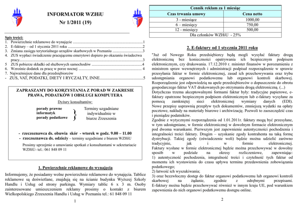 INFORMATOR WZHiU Nr 1/2011 (19) Spis treści: 1. Powierzchnie reklamowe do wynajęcie ........................................................................1 2. E-faktury – od 1 stycznia 2011 roku .............................................................................2 3. Zmiana zasięgu terytorialnego urzędów skarbowych w Poznaniu ...............................3 4. ZUS wypłaci świadczenie pracującemu emerytowi dopiero po okazaniu świadectwa pracy...............................................................................................................................3 5 ZUS pobierze składki od służbowych samochodów ....................................................4 6. Wzrośnie dodatek za pracę w porze nocnej ................................................................. 4 7. Najważniejsze dane dla przedsiębiorców - ZUS, VAT, PODATKI, DIETY I RYCZAŁTY, INNE.........................................5 ZAPRASZAMY DO KORZYSTANIA Z PORAD W ZAKRESIE PRAWA, PODATKÓW I OBSŁUGI KOMPUTERA Dyżury konsultantów: porady prawne informatyk porady podatkowe } Terminy uzgadniane indywidualnie w biurze Zrzeszenia - rzeczoznawca ds. obuwia skór - wtorek w godz. 9.00 – 11.00 - rzeczoznawca ds. odzieży – terminy uzgadniane z biurem WZHiU Prosimy uprzejmie o umawianie spotkań z konsultantami w sekretariacie WZHiU- tel.: 061 848 09 11 1. Powierzchnie reklamowe do wynajęcia Informujemy, że posiadamy wolne powierzchnie reklamowe do wynajęcia. Tablice reklamowe są doświetlane, znajdują się na ścianie budynku Wyższej Szkoły Handlu i Usług od strony parkingu. Wymiary tablic 6 x 3 m. Osoby zainteresowane umieszczeniem reklamy prosimy o kontakt z biurem Wielkopolskiego Zrzeszenia Handlu i Usług w Poznaniu tel.: 61 848 09 11 1 Cennik reklam za 1 miesiąc Czas trwania umowy Cena netto 3 - miesiące 1000,00 6 – miesięcy 750,00 12 - miesięcy 500,00 Dla członków WZHiU - 25% 2. E-faktury od 1 stycznia 2011 roku "Już od Nowego Roku przedsiębiorcy będą mogli wysyłać faktury drogą elektroniczną bez konieczności opatrywania ich bezpiecznym podpisem elektronicznym, czy drukowania. 17.12.2010 r. minister finansów w porozumieniu z ministrem spraw wewnętrznych i administracji podpisał rozporządzenie w sprawie przesyłania faktur w formie elektronicznej, zasad ich przechowywania oraz trybu udostępniania organowi podatkowemu lub organowi kontroli skarbowej. Rozporządzenie jest odpowiedzią na apele przedsiębiorców o dopuszczenie do obrotu gospodarczego faktur VAT drukowanych po otrzymaniu drogą elektroniczną. (...) Dotychczas trzema akceptowalnymi formami faktur były: tradycyjne papierowe, efaktury opatrzone bezpiecznym podpisem elektronicznym lub e-faktury wysyłane za pomocą zamkniętej sieci elektronicznej wymiany danych (EDI). Nowe przepisy usprawnią przepływ tych dokumentów, zmniejszą wydatki na opłaty pocztowe, nakłady na materiały biurowe i archiwizację. Pozwoli to zaoszczędzić czas i pieniądze podatników. Zgodnie z wytycznymi rozporządzenia od 1.01.2011r. faktury mogą być przesyłane, w tym udostępniane, w formie elektronicznej w dowolnym formacie elektronicznym pod dwoma warunkami. Pierwszym jest zapewnienie autentyczności pochodzenia i integralności treści faktury. Drugim – uzyskanie zgody kontrahenta na taką formę dystrybucji. Takiej zgody (oświadczenie woli) będzie można udzielić zarówno tradycyjnie, jak i w formie elektronicznej. Faktury wysłane w formie elektronicznej będzie można przechowywać w dowolny sposób w podziale na okresy rozliczeniowe, zapewniając: 1) autentyczność pochodzenia, integralność treści i czytelność tych faktur od momentu ich wystawienia do czasu upływu terminu przedawnienia zobowiązania podatkowego; 2) łatwość ich wyszukiwania; 3) oraz bezzwłoczny dostęp do faktur organowi podatkowemu lub organowi kontroli skarbowej na żądanie, zgodnie z odrębnymi przepisami. E-faktury można będzie przechowywać również w innym kraju UE, pod warunkiem zapewnienia do nich organowi podatkowemu dostępu online. 2 3. Zmiana zasięgu terytorialnego urzędów skarbowych Naczelnik Pierwszego Urzędu Skarbowego w Poznaniu informuje, że dnia 1.01.2011 roku nastąpi zmiana zasięgu terytorialnego urzędów skarbowych Powiatu poznańskiego i miasta Poznania. Podatnicy, płatnicy i inkasenci ze względu na adres siedziby, miejsce zamieszkania lub miejsce wykonywania czynności na terenie: • Gminy Suchy Las będą obsługiwani przez urząd Skarbowy PoznańWinogrady • Gminy Tarnowo Podgórne i Gminy Rokietnica będą obsługiwani przez Urząd Skarbowy Poznań-Jeżyce • Miasta Luboń i Miasta Puszczykowo będą obsługiwani przez Urząd Skarbowy Poznań-Wilda. Jednocześnie z dniem 1 stycznia 2011 r. Urząd Skarbowy Poznań-Śródmieście włączony zostanie w struktury Urzędu Skarbowego Poznań-Wilda, tym samym podatnicy, płatnicy i inkasenci zobowiązani są dokonywać rozliczeń podatkowych w Urzędzie Skarbowym Poznań-Wilda. 4. ZUS wypłaci świadczenie pracującemu emerytowi dopiero po okazaniu świadectwa pracy Pracujący emeryci chcąc zachować prawo do świadczenia, muszą przedstawić w ZUS świadectwo pracy albo zaświadczenie z firmy o tym, że rozwiązali stosunek pracy. Od 1 stycznia wejdzie w życie nowelizacja ustawy o emeryturach i rentach z Funduszu Ubezpieczeń Społecznych, przewidująca zawieszenie prawa do emerytury przysługującej osobom, które nie rozwiązały stosunku pracy z pracodawcą, na rzecz którego wykonywały zatrudnienie bezpośrednio przed nabyciem prawa do emerytury. Jak wyjaśnia ZUS, prawo to ulega zawieszeniu nie tylko niezależnie od wysokości osiąganego przychodu, ale także od wieku osoby uprawnionej do emerytury. Dotyczy to także osób, które ukończyły powszechny wiek emerytalny (60 lat dla kobiet i 65 dla mężczyzn). Zawieszeniu podlega też okresowa emerytura kapitałowa. Dotyczy to wszystkich emerytów, którzy nie rozwiązali