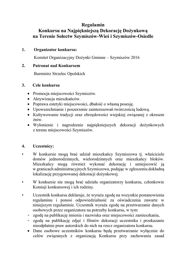 Regulamin Konkursu na Najpiękniejszą Dekorację Dożynkową na Terenie Sołectw Szymiszów-Wieś i Szymiszów-Osiedle 1. Organizator konkursu: Komitet Organizacyjny Dożynki Gminne – Szymiszów 2016 2. Patronat nad Konkursem Burmistrz Strzelec Opolskich 3. Cele konkursu Promocja miejscowości Szymiszów. Aktywizacja mieszkańców. Poprawa estetyki miejscowości, dbałość o własną posesję. Upowszechnianie i poszerzenie zainteresowań twórczością ludową. Kultywowanie tradycji oraz obrzędowości wiejskiej związanej z okresem żniw. Wyłonienie i nagrodzenie najpiękniejszych dekoracji dożynkowych z terenu miejscowości Szymiszów. 4. Uczestnicy: • W konkursie mogą brać udział mieszkańcy Szymiszowa tj. właściciele domów jednorodzinnych, wielorodzinnych oraz mieszkańcy bloków. Mieszkańcy mogą również wykonać dekorację i umiejscowić ją w granicach administracyjnych Szymiszowa, podając w zgłoszeniu dokładną lokalizację przygotowanej dekoracji dożynkowej. • W konkursie nie mogą brać udziału organizatorzy konkursu, członkowie Komisji konkursowej i ich rodziny. • Uczestnik konkursu deklaruje, że wyraża zgodę na wszystkie postanowienia regulaminu i ponosi odpowiedzialność za oświadczenia zawarte w niniejszym regulaminie. Uczestnik wyraża zgodę na przetwarzanie danych osobowych przez organizatora na potrzeby konkursu, w tym: zgodę na publikację imienia i nazwiska oraz miejscowości zamieszkania, zgodę na publikację zdjęć i filmów dekoracji uczestnika i przekazanie nieodpłatnie praw autorskich do nich na rzecz organizatora konkursu. Dane osobowe uczestników konkursu będą przetwarzanie wyłącznie do celów związanych z organizacją Konkursu przy zachowaniu zasad określonych w ustawie z dnia 29 sierpnia 1997 r. o ochronie danych osobowych. 5. Tryb zgłaszania: • Warunkiem udziału w konkursie jest zgłoszenie dekoracji dożynkowej na deklaracji przystąpienia do konkursu wg wzoru stanowiącego załącznik do niniejszego regulaminu, w terminie od 22 sierpnia do 5 września 2016 r. • Deklarację można pobrać ze strony internetowej http://szymiszow.pl oraz u sołtysów sołectwa Szymiszów-Wieś i Szymiszów-Osiedle. • Komisja konkursowa przystąpi do oceny zgłoszonych dożynkowych w dniu 11 września od godziny 10.00. dekoracji • Zgłoszenia mogą być składane w czasie trwania konkursu przez: właściciela lub współwłaściciela posesji (oraz ich pełnoletnie dzieci), właścicieli dekoracji umiejscowionych na terenie miejscowości Szymiszów. Zgłoszenia należy składać w kopercie z napisem „Konkurs na najpiękniejszą dekorację dożynkową” u sołtysów sołectw SzymiszówWieś i Szymiszów-Osiedle 6. Sposób realizacji Konkursu • Oceny prac konkursowych ocenia Komisja Konkursowa złożona z: 2 przedstawicieli Urzędu Gminy Strzelce Opolskie, Przedstawiciela Strzeleckiego Ośrodka Kultury, 2 przedstawicieli sołectw wiejskich Gminy Strzelce Opolskie. Komisja dokona oceny punktowej zgłoszonych dekoracji zgodnie z przyjętymi kryteriami oraz regulaminem. 7. Kryteria oceny dekoracji dożynkowych Nawiązanie do tradycji i kultury dożynkowej Wykorzystanie elementów przyjaznych środowisku – technika wykonania 0-5 pkt 0-5 pkt Wkład pracy włożony w przygotowanie dekoracji Ogólna estetyka wykonanej dekoracji 0-5 pkt 0-5 pkt 8. Nagrody Rozstrzygnięcie Konkursu odbędzie się 11 września podczas Dożynek Gminnych w Szymiszowie. Dla zwycięzców i wyróżnionych przewidziane są nagrody: Za miejsca w wysokości: od I do V przyznane - I miejsce – 500 zł (sponsor – IMEX Piechota) - II miejsce – bon upominkowy o wartości 300 zł (Hurtownia A-T Elektryka) - III miejsce – bon upominkowy o wartości 200 zł (Hurtownia A-T Elektryka) zostaną nagrody finansowe - IV miejsce – bon upominkowy o wartości 100 zł (Hurtownia A-T Elektryka) - V miejsce - bon na obiad dla dwóch osób w Starym Młynie - VI-X miejsce – rzeczowe nagrody pocieszenia. Kolejność miejsc będzie wynikała z punktacji Komisji Konkursowej. Suma przyznanych przez członków Komisji Konkursowej punktów stanowi ocenę zgłoszonej pracy. Nie dopuszcza się przyznania dwóch równorzędnych miejsc. W przypadku uzyskania jednakowej ilości punktów członkowie komisji będą głosować ponownie na zgłoszone dekoracje, które uzyskały tą samą ilość punktów. Decyzje komisji są ostateczne. Prawo rozstrzygania kwestii nieujętych w Regulaminie przysługuje Organizatorowi i Komisji Konkursowej.