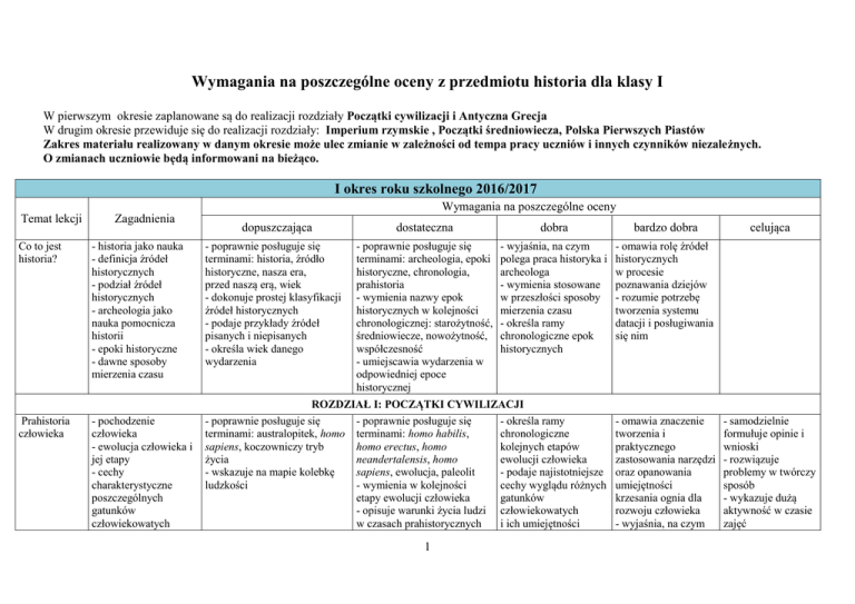 Wymagania na poszczególne oceny z przedmiotu historia dla klasy I W pierwszym okresie zaplanowane są do realizacji rozdziały Początki cywilizacji i Antyczna Grecja W drugim okresie przewiduje się do realizacji rozdziały: Imperium rzymskie , Początki średniowiecza, Polska Pierwszych Piastów Zakres materiału realizowany w danym okresie może ulec zmianie w zależności od tempa pracy uczniów i innych czynników niezależnych. O zmianach uczniowie będą informowani na bieżąco. I okres roku szkolnego 2016/2017 Wymagania na poszczególne oceny Temat lekcji Co to jest historia? Prahistoria człowieka Zagadnienia - historia jako nauka - definicja źródeł historycznych - podział źródeł historycznych - archeologia jako nauka pomocnicza historii - epoki historyczne - dawne sposoby mierzenia czasu - pochodzenie człowieka - ewolucja człowieka i jej etapy - cechy charakterystyczne poszczególnych gatunków człowiekowatych dopuszczająca - poprawnie posługuje się terminami: historia, źródło historyczne, nasza era, przed naszą erą, wiek - dokonuje prostej klasyfikacji źródeł historycznych - podaje przykłady źródeł pisanych i niepisanych - określa wiek danego wydarzenia dostateczna dobra bardzo dobra - poprawnie posługuje się terminami: archeologia, epoki historyczne, chronologia, prahistoria - wymienia nazwy epok historycznych w kolejności chronologicznej: starożytność, średniowiecze, nowożytność, współczesność - umiejscawia wydarzenia w odpowiedniej epoce historycznej - wyjaśnia, na czym polega praca historyka i archeologa - wymienia stosowane w przeszłości sposoby mierzenia czasu - określa ramy chronologiczne epok historycznych - omawia rolę źródeł historycznych w procesie poznawania dziejów - rozumie potrzebę tworzenia systemu datacji i posługiwania się nim ROZDZIAŁ I: POCZĄTKI CYWILIZACJI - poprawnie posługuje się - poprawnie posługuje się - określa ramy terminami: australopitek, homo terminami: homo habilis, chronologiczne sapiens, koczowniczy tryb homo erectus, homo kolejnych etapów życia neandertalensis, homo ewolucji człowieka - wskazuje na mapie kolebkę sapiens, ewolucja, paleolit - podaje najistotniejsze ludzkości - wymienia w kolejności cechy wyglądu różnych etapy ewolucji człowieka gatunków - opisuje warunki życia ludzi człowiekowatych w czasach prahistorycznych i ich umiejętności 1 - omawia znaczenie tworzenia i praktycznego zastosowania narzędzi oraz opanowania umiejętności krzesania ognia dla rozwoju człowieka - wyjaśnia, na czym celująca - samodzielnie formułuje opinie i wnioski - rozwiązuje problemy w twórczy sposób - wykazuje dużą aktywność w czasie zajęć - osiągnięcia człowieka pierwotnego Czas wielkich - wpływ zmian klimatu przemian na życie człowieka - rewolucja neolityczna - początki rolnictwa i hodowli - pierwsze osady - budowle megalityczne - początek metalurgii W kraju Sumerów - położenie geograficzne i warunki naturalne Mezopotamii - powstanie pierwszych państw - organizacja państwa Sumerów - osiągnięcia polegała zależność człowieka od przyrody - wymienia przyczyny powstania pierwszych dzieł sztuki praludzi - poprawnie posługuje się - poprawnie posługuje się - przedstawia wpływ - omawia tryb życia i terminami: rewolucja terminami: neolit, megalit zmian klimatycznych zajęcia ludzi epoki neolityczna, osiadły tryb życia, - określa ramy chronologiczne na tryb życia człowieka neolitu osada, epoka brązu, epoka rewolucji neolitycznej pierwotnego - charakteryzuje żelaza - opisuje życie codzienne - omawia tryb życia i wygląd osad - przedstawia zmiany, które ludzi przed rewolucją zajęcia ludzi epoki neolitycznych zaszły w życiu człowieka w neolityczną neolitu - opisuje wygląd i okresie neolitu - omawia sposób wytopu - nazywa i lokalizuje na funkcje budowli - podaje nazwy metali brązu i żelaza mapie pozostałości megalitycznych wykorzystywanych przez najstarszej znanej osady praludzi do wytopu broni, ludzkiej narzędzi, ozdób - wskazuje na mapie miejsce położenia najbardziej znanej budowli megalitycznej - wyjaśnia, jakie zmiany nastąpiły w życiu człowieka dzięki opanowaniu umiejętności wytopu metali - poprawnie posługuje się - podaje ramy chronologiczne - charakteryzuje - omawia organizację terminami: cywilizacja, istnienia cywilizacji oddziaływanie państwa Sumerów Mezopotamia, system sumeryjskiej warunków naturalnych - przedstawia związek irygacyjny, Sumerowie, miasto- - poprawnie posługuje się na życie mieszkańców między budową państwo terminami: Żyzny Półksiężyc, Mezopotamii i utrzymaniem sieci - lokalizuje na mapie król-kapłan, zikkurat irygacyjnej Mezopotamię - określa rolę rzek w a powstaniem - omawia położenie starożytnej Mezopotamii pierwszych państw - podaje nazwy najważniejszych wynalazków człowieka z czasów prahistorycznych 2 - wskazuje na mapie kierunki i trasy ekspansji gatunku ludzkiego - uzasadnia słuszność określenia rewolucja dla zmian, które zaszły w życiu człowieka w okresie neolitu Ponadto: - samodzielnie formułuje opinie i wnioski - rozwiązuje problemy w twórczy sposób - wykazuje dużą aktywność w czasie zajęć - wyjaśnia, jaki wpływ na organizację pierwszych państw miało ich położenie geograficzne oraz warunki naturalne Babilonia i Asyria W Egipcie faraonów cywilizacji sumeryjskiej geograficzne i warunki naturalne panujące w Mezopotamii - wymienia osiągnięcia Sumerów - opisuje wygląd miast sumeryjskich - państwo babilońskie - Hammurabi i jego kodeks prawny - Babilon - państwo asyryjskie - organizacja armii asyryjskiej - poprawnie posługuje się terminami: Babilon, Kodeks Hammurabiego, politeizm - określa, kim był i czym zasłynął Hammurabi - lokalizuje na mapie państwo babilońskie i asyryjskie - omawia najważniejsze zasady prawne zapisane w Kodeksie Hammurabiego - zna wydarzenia związane z datami: ok. 2 tys. lat p.n.e., XVIII w. p.