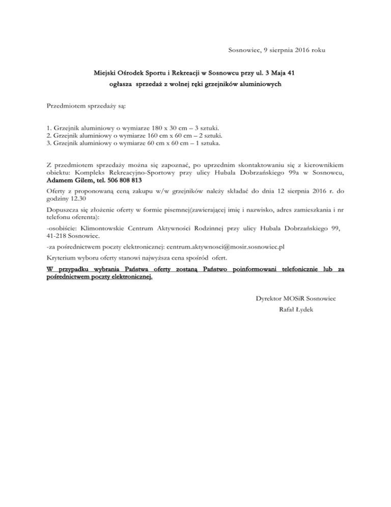 Sosnowiec, 9 sierpnia 2016 roku Miejski Ośrodek Sportu i Rekreacji w Sosnowcu przy ul. 3 Maja 41 ogłasza sprzedaż z wolnej ręki grzejników aluminiowych Przedmiotem sprzedaży są: 1. Grzejnik aluminiowy o wymiarze 180 x 30 cm – 3 sztuki. 2. Grzejnik aluminiowy o wymiarze 160 cm x 60 cm – 2 sztuki. 3. Grzejnik aluminiowy o wymiarze 60 cm x 60 cm – 1 sztuka. Z przedmiotem sprzedaży można się zapoznać, po uprzednim skontaktowaniu się z kierownikiem obiektu: Kompleks Rekreacyjno-Sportowy przy ulicy Hubala Dobrzańskiego 99a w Sosnowcu, Adamem Gilem, tel. 506 808 813 Oferty z proponowaną ceną zakupu w/w grzejników należy składać do dnia 12 sierpnia 2016 r. do godziny 12.30 Dopuszcza się złożenie oferty w formie pisemnej(zawierającej imię i nazwisko, adres zamieszkania i nr telefonu oferenta): -osobiście: Klimontowskie Centrum Aktywności Rodzinnej przy ulicy Hubala Dobrzańskiego 99, 41-218 Sosnowiec. -za pośrednictwem poczty elektronicznej: [email protected] Kryterium wyboru oferty stanowi najwyższa cena spośród ofert. W przypadku wybrania Państwa oferty zostaną Państwo poinformowani telefonicznie lub za pośrednictwem poczty elektronicznej. Dyrektor MOSiR Sosnowiec Rafał Łydek