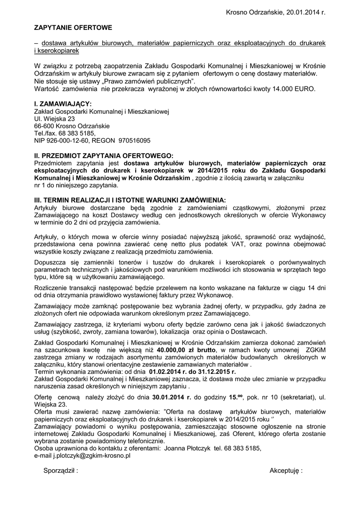 Krosno Odrzańskie, 20.01.2014 r. ZAPYTANIE OFERTOWE – dostawa artykułów biurowych, materiałów papierniczych oraz eksploatacyjnych do drukarek i kserokopiarek W związku z potrzebą zaopatrzenia Zakładu Gospodarki Komunalnej i Mieszkaniowej w Krośnie Odrzańskim w artykuły biurowe zwracam się z pytaniem ofertowym o cenę dostawy materiałów. Nie stosuje się ustawy „Prawo zamówień publicznych”. Wartość zamówienia nie przekracza wyrażonej w złotych równowartości kwoty 14.000 EURO. I. ZAMAWIAJĄCY: Zakład Gospodarki Komunalnej i Mieszkaniowej Ul. Wiejska 23 66-600 Krosno Odrzańskie Tel./fax. 68 383 5185, NIP 926-000-12-60, REGON 970516095 II. PRZEDMIOT ZAPYTANIA OFERTOWEGO: Przedmiotem zapytania jest dostawa artykułów biurowych, materiałów papierniczych oraz eksploatacyjnych do drukarek i kserokopiarek w 2014/2015 roku do Zakładu Gospodarki Komunalnej i Mieszkaniowej w Krośnie Odrzańskim , zgodnie z ilością zawartą w załączniku nr 1 do niniejszego zapytania. III. TERMIN REALIZACJI I ISTOTNE WARUNKI ZAMÓWIENIA: Artykuły biurowe dostarczane będą zgodnie z zamówieniami cząstkowymi, złożonymi przez Zamawiającego na koszt Dostawcy według cen jednostkowych określonych w ofercie Wykonawcy w terminie do 2 dni od przyjęcia zamówienia. Artykuły, o których mowa w ofercie winny posiadać najwyższą jakość, sprawność oraz wydajność, przedstawiona cena powinna zawierać cenę netto plus podatek VAT, oraz powinna obejmować wszystkie koszty związane z realizacją przedmiotu zamówienia. Dopuszcza się zamienniki tonerów i tuszów do drukarek i kserokopiarek o porównywalnych parametrach technicznych i jakościowych pod warunkiem możliwości ich stosowania w sprzętach tego typu, które są w użytkowaniu zamawiającego. Rozliczenie transakcji następować będzie przelewem na konto wskazane na fakturze w ciągu 14 dni od dnia otrzymania prawidłowo wystawionej faktury przez Wykonawcę. Zamawiający może zamknąć postępowanie bez wybrania żadnej oferty, w przypadku, gdy żadna ze złożonych ofert nie odpowiada warunkom określonym przez Zamawiającego. Zamawiający zastrzega, iż kryteriami wyboru oferty będzie zarówno cena jak i jakość świadczonych usług (szybkość, zwroty, zamiana towarów), lokalizacja oraz opinia o Dostawcach. Zakład Gospodarki Komunalnej i Mieszkaniowej w Krośnie Odrzańskim zamierza dokonać zamówień na szacunkowa kwotę nie większą niż 40.000,00 zł brutto, w ramach kwoty umownej ZGKiM zastrzega zmiany w rodzajach asortymentu zamówionych materiałów budowlanych określonych w załączniku, który stanowi orientacyjne zestawienie zamawianych materiałów . Termin wykonania zamówienia: od dnia 01.02.2014 r. do 31.12.2015 r. Zakład Gospodarki Komunalnej i Mieszkaniowej zaznacza, iż dostawa może ulec zmianie w przypadku naruszenia zasad określonych w niniejszym zapytaniu . Ofertę cenową należy złożyć do dnia 30.01.2014 r. do godziny 15.ºº, pok. nr 10 (sekretariat), ul. Wiejska 23. Oferta musi zawierać nazwę zamówienia: ”Oferta na dostawę artykułów biurowych, materiałów papierniczych oraz eksploatacyjnych do drukarek i kserokopiarek w 2014/2015 roku ‘’ Zamawiający powiadomi o wyniku postępowania, zamieszczając stosowne ogłoszenie na stronie internetowej Zakładu Gospodarki Komunalnej i Mieszkaniowej, zaś Oferent, którego oferta zostanie wybrana zostanie powiadomiony telefonicznie. Osoba uprawniona do kontaktu z oferentami: Joanna Płotczyk tel. 68 383 5185, e-mail [email protected] Sporządził : Akceptuję :