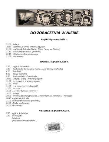 DO ZOBACZENIA W NIEBIE PIĄTEK 9 grudnia 2016 r. 19.00 19.30 21.00 21.15 22.15 23.30 kolacja rekreacja, z krótką prezentacją grup wyjście do kościoła (Najśw. Marii Panny na Piasku) adoracja (możliwość spowiedzi) słówko, modlitwy wieczorne cisza nocna SOBOTA 10 grudnia 2016 r. 7.15 7.30 8.20 9.00 9.30 10.30 11.30 12.30 14.00 15.30 16.00 18.00 19.00 20.45 21.00 22.00 24.00 wyjście do kościoła Eucharystia ( w kościele Najśw. Marii Panny na Piasku) śniadanie etiuda teatralna konferencja ks. Piotra Lorka Usłysz i zaufaj - praca w grupach prezentacje z pracy w grupach obiad …a może bym coś stworzył? przerwa …a może bym coś stworzył? kolacja prezentacja umiejętności (z ..a może bym coś stworzył?) i rekreacja wyjście do kościoła adoracja (możliwość spowiedzi) słówko na dobranoc cisza nocna NIEDZIELA 11 grudnia 2016 r. 7.15 wyjście do kościoła 7.30 Eucharystia śniadanie sprzątanie i do zobaczenia…
