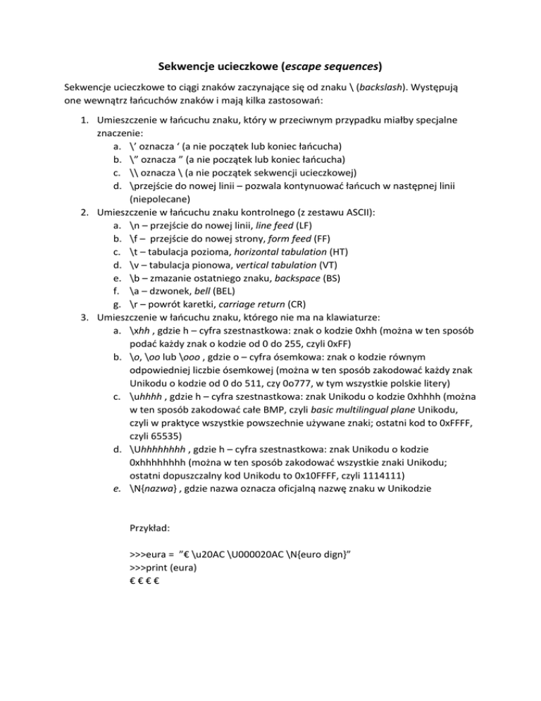 Sekwencje ucieczkowe to ciągi znaków zaczynające się od znaku \ (backslash). Występują