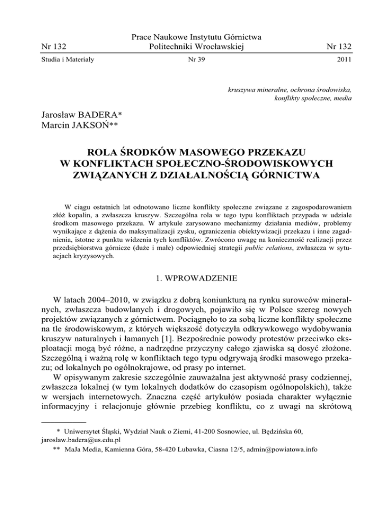 Nr 132 Studia i Materia y Prace Naukowe Instytutu Górnictwa Politechniki Wroc awskiej Nr 132 Nr 39 2011 kruszywa mineralne, ochrona rodowiska, konflikty spo!eczne, media Jaros aw BADERA* Marcin JAKSO!** ROLA RODKÓW MASOWEGO PRZEKAZU W KONFLIKTACH SPO!ECZNO- RODOWISKOWYCH ZWI"ZANYCH Z DZIA!ALNO CI" GÓRNICTWA W ci"gu ostatnich lat odnotowano liczne konflikty spo eczne zwi"zane z zagospodarowaniem z ó# kopalin, a zw aszcza kruszyw. Szczególna rola w tego typu konfliktach przypada w udziale $rodkom masowego przekazu. W artykule zarysowano mechanizmy dzia ania mediów, problemy wynikaj"ce z d"#enia do maksymalizacji zysku, ograniczenia obiektywizacji przekazu i inne zagadnienia, istotne z punktu widzenia tych konfliktów. Zwrócono uwag% na konieczno$& realizacji przez przedsi%biorstwa górnicze (du#e i ma e) odpowiedniej strategii public relations, zw aszcza w sytuacjach kryzysowych. 1. WPROWADZENIE W latach 2004–2010, w zwi"zku z dobr" koniunktur" na rynku surowców mineralnych, zw aszcza budowlanych i drogowych, pojawi o si% w Polsce szereg nowych projektów zwi"zanych z górnictwem. Poci"gn% o to za sob" liczne konflikty spo eczne na tle $rodowiskowym, z których wi%kszo$& dotyczy a odkrywkowego wydobywania kruszyw naturalnych i amanych [1]. Bezpo$rednie powody protestów przeciwko eksploatacji mog" by& ró#ne, a nadrz%dne przyczyny ca ego zjawiska s" dosy& z o#one. Szczególn" i wa#n" rol% w konfliktach tego typu odgrywaj" $rodki masowego przekazu; od lokalnych po ogólnokrajowe, od prasy po internet. W opisywanym zakresie szczególnie zauwa#alna jest aktywno$& prasy codziennej, zw aszcza lokalnej (w tym lokalnych dodatków do czasopism ogólnopolskich), tak#e w wersjach internetowych. Znaczna cz%$& artyku ów posiada charakter wy "cznie informacyjny i relacjonuje g ównie przebieg konfliktu, co z uwagi na skrótow" __________ * Uniwersytet 'l"ski, Wydzia Nauk o Ziemi, 41-200 Sosnowiec, ul. B%dzi(ska 60, [email protected] ** MaJa Media, Kamienna Góra, 58-420 Lubawka, Ciasna 12/5, [email protected] 4 zazwyczaj form% relacji, wi"#e si% na ogó z do$& uproszczonym potraktowaniem zagadnienia. W radiu i telewizji temat konfliktów pojawia si% tak#e w bardziej obszernych reporta#ach lub tzw. programach interwencyjnych. Merytoryczna jako$& tych programów bywa niestety ró#na. W epoce internetu du#" popularno$ci" ciesz" si% ró#nego rodzaju portale i strony tematyczne, a tak#e blogi i fora dyskusyjne. Bardziej wytrawny internauta mo#e znale)& tam szerokie spektrum obiektywnych i subiektywnych informacji na temat korzy$ci i zagro#e( zwi"zanych z rozwojem górnictwa, powinien te# dokona& ich selekcji jako$ciowej. Niestety, mniej cierpliwy natknie si% g ównie na strony skierowane wprost przeciwko projektom górniczym. Z kolei informacje pojawiaj"ce si% na stronach internetowych reprezentuj"cych bran#% górnicz" ra#" zwykle zbyt technokratycznym spojrzeniem na prowadzon" lub projektowan" dzia alno$& eksploatacyjn", co w czasach spo ecze(stwa postindustrialnego stanowi jednak pewien anachronizm. Podstawowym celem dziennikarstwa jest zdobywanie i przekazywanie informacji dla dobra pa(stwa i spo ecze(stwa. Dzia ania dziennikarskie powinny by& wykonywane zgodnie z zasadami etyki zawodowej, której najwa#niejszymi elementami s" otwarto$& komunikacji oraz poszanowanie dóbr osobistych obywateli [5]. Ka#dy dziennikarz ma zatem prawo do informacji, cho& w uzasadnionych przypadkach mo#na mu jej odmówi&. Do pewnego stopnia zagadnienia te reguluje prawo prasowe, które powinno by& znane zarówno profesjonalnym dziennikarzom, jak i osobom odpowiedzialnym za kontakt z mediami z ramienia przedsi%biorstw i instytucji. W praktyce kryteria prawa bywaj" niejednoznaczne, tak wi%c wiele zale#y równie# od odpowiedniego wyczucia i sprawdzonych wzorców dzia ania. Niew"tpliwie wi%kszy problem stanowi naturalna, uwarunkowana ch%ci" zysku, tendencja mediów do szukania sensacji, zw aszcza o negatywnym zabarwieniu, a tak#e ich post%puj"ca tabloidyzacja. Cechy te, z punktu widzenia przedmiotowego zagadnienia, omówiono w dalszej cz%$ci artyku u. Media, b%d"c czynnikiem opiniotwórczym, czy cho&by jedynie )ród em wyselekcjonowanej informacji, mog" bra& w konflikcie aktywny udzia , a nawet sta& si% jego kolejn" stron". Z uwagi na demokratyzacj% rozpowszechniania informacji, przy jednoczesnym zachowaniu mo#liwo$ci wywierania wp ywu na opini% publiczn", rola mediów wydaje si% stale rosn"ca. 2. MEDIA A RZECZYWISTO'* KONFLIKTU W drugiej po owie lat 1960. Marshall McLuhan i Quentin Fiore [2] zaproponowali termin „globalna wioska” opisuj"cy zmiany zachodz"ce w postrzeganiu $wiata. Dzi%ki wszechobecnym i b yskawicznie reaguj"cym mediom niemal ka#dy ma stosunkowo szybki dost%p do informacji o wydarzeniach maj"cych miejsce w dowolnym miejscu globu. Dzisiaj, termin ten wydaje si% jeszcze bardziej uzasadniony. W dobie Internetu 5 i telefonów komórkowych, ka#da informacja mo#e dotrze& do odbiorcy na drugim ko(cu gminy, województwa, kraju czy $wiata w ci"gu zaledwie kilku minut. Dotyczy to równie# wszelkich sytuacji konfliktowych jako tych, które w szczególnym stopniu absorbuj" uwag% opinii publicznej. Zainteresowanie mediów konkretnym konfliktem mo#e by& wynikiem dzia ania jednej ze stron, b"d) te# skutkiem przypadkowego zainteresowania dziennikarza. W przypadku antagonizmów mi%dzy przedsi%biorstwem, samorz"dem, osob" fizyczn" lub grup" osób, najcz%$ciej ta druga, teoretycznie s absza strona, inicjuje kontakty z mediami. Z tego te# powodu ka#da instytucja, samorz"d czy przedsi%biorca, powinna mie& z góry przygotowan" strategi% komunikowania si% z mediami w sytuacjach kryzysowych, a zw aszcza w razie konfliktów o charakterze spo ecznym. Mo#e si% ona bowiem spodziewa& prezentacji w negatywnym lub przynajmniej gorszym $wietle, cz%sto w charakterze )ród a konfliktu. W szczególny sposób dotyka to przemys u wydobywczego, który kojarzony jest jednoznacznie z negatywnymi skutkami swojej dzia alno$ci. W powszechnej 