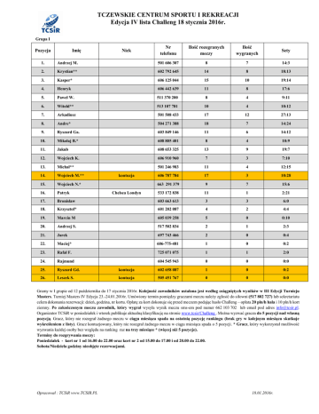 TCZEWSKIE CENTRUM SPORTU I REKREACJI Edycja IV lista Challeng 18 stycznia 2016r. Grupa I Imię Pozycja Nick Nr telefonu Ilość rozegranych meczy Ilość wygranych Sety 1. Andrzej M. 501 606 307 8 7 14:3 2. Krystian** 602 792 645 14 8 18:13 3. Kasper* 606 125 044 15 10 19:14 4. Henryk 606 442 639 11 8 17:6 5. Paweł W. 511 370 200 8 4 9:11 6. Witold** 513 107 781 10 4 10:12 7. Arkadiusz 501 508 433 17 12 27:13 8. Andre* 504 271 388 18 7 14:24 9. Ryszard Ga. 603 849 146 11 6 14:12 10. Mikołaj B.* 608 805 401 8 4 10:9 11. Jakub 608 653 325 13 9 19:7 12. Wojciech K. 606 910 960 7 3 7:10 13. Michał** 501 246 983 11 4 12:15 14. Wojciech M.** 606 787 784 17 3 10:28 15. Wojciech N.* 663 291 379 9 7 15:6 16. Patryk 533 172 838 11 1 2:21 17. Bronisław 603 663 613 3 3 6:0 18. Krzysztof* 601 202 087 4 2 4:4 19. Marcin M 605 039 258 5 0 0:10 20. Andrzej S. 517 502 834 2 1 2:3 21. Jarek 697 743 466 2 0 0:4 22. Maciej* 606-775-481 1 0 0:2 23. Rafał F. 725 071 075 1 1 2:0 24. Rajmund 604 545 943 0 0 0:0 25. Ryszard Gd. kontuzja 602 658 087 1 0 0:2 26. Leszek S. kontuzja 505 451 767 0 0 0:0 kontuzja Chelsea Londyn Gramy w I grupie od 12 października do 17 stycznia 2016r. Kolejność zawodników ustalona jest według osiągniętych wyników w III Edycji Turnieju Masters. Turniej Masters IV Edycja 23.-24.01.2016r. Umówiony termin pomiędzy graczami meczu należy zgłosić do siłowni (517 802 727) lub sekretariatu celem dokonania rezerwacji: dzień, godzina, nr kortu. Opłatę za kort dokonuje się przed meczem podając hasło Challeng – opłata 20 pln/h hala i 10 pln/h kort ziemny. Po zakończonym meczu zawodnik, który wygrał wysyła wynik meczu sms-em pod numer 662 103 702 lub email pod adres [email protected]. Organizator TCSiR w poniedziałek i wtorek publikuje aktualną klasyfikację na stronie www.tcsir/Challeng . Można wyzwać gracza do 5 pozycji nad własną pozycją. Gracz, który nie rozegrał żadnego meczu w ciągu miesiąca spada na ostatnią pozycję rankingu (brak gry w kolejnym miesiącu skutkuje wykreśleniem z listy). Gracz kontuzjowany, który nie rozegrał żadnego meczu w ciągu miesiąca spada o 5 pozycji. * Gracz, który wykorzystał możliwość wyzwania każdej osoby bez względu na ranking raz na trzy miesiące * (więcej niż 5 pozycje). Terminy do rozgrywania meczy: Poniedziałek - kort nr 1 od 16.00 do 22.00 oraz kort nr 2 od 15.00 do 17.00 i od 20.00 do 22.00. Sobota/Niedziela godziny nieobjęte rezerwacjami. Opracował : TCSiR www.TCSIR.PL 18.01.2016r.