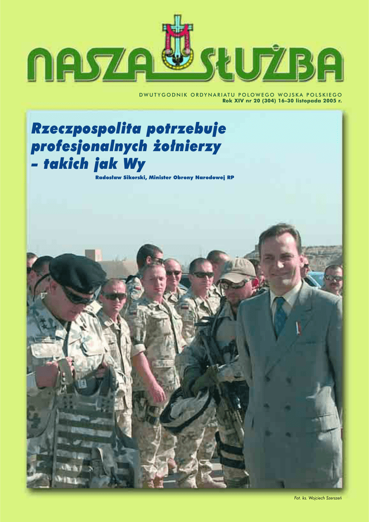 DW U T Y G O D N I K O R DY N A R I AT U P O LO W E G O W O J S K A P O L S K I E G O Rok XIV nr 20 (304) 16-30 listopada 2005 r. Rzeczpospolita potrzebuje profesjonalnych ˝o∏nierzy – takich jak Wy Rados∏aw Sikorski, Minister Obrony Narodowej RP Fot. ks. Wojciech Szerszeƒ z nauczania KoÊcio∏a Katolickiego Pan króluje 1. W dzisiejszà, ostatnià niedziel´ roku liturgicznego obchodzimy uroczystoÊç Jezusa Chrystusa Króla WszechÊwiata. KoÊció∏ zach´ca nas do kontemplowania królewskiej godnoÊci Odkupiciela, którà w sposób szczególnie wymowny ukazuje ˝ycie Êwi´tych. (...) Ich Êwiadectwo potwierdza prawd´, ˝e Ukrzy˝owany „˝yje i króluje na wieki wieków”. Tak, On jest „˚yjàcym”, „Panem” i króluje w ˝yciu ludzi w ka˝dym miejscu i w ka˝dym czasie, gdy przyjmujà Go w sposób wolny i wiernie za Nim podà˝ajà. Jego Królestwo, „królestwo sprawiedliwoÊci, mi∏oÊci i pokoju” (prefacja mszalna) objawi si´ jednak w pe∏ni dopiero na koƒcu czasów. 2. Wed∏ug kryteriów tego Êwiata królowanie Jezusa mo˝e si´ wydawaç czymÊ „paradoksalnym”. Istotnie, w∏adza, którà si´ pos∏uguje, nie odpowiada ziemskiej logice. Jest to bowiem w∏adza mi∏oÊci i s∏u˝by, która wymaga bezinteresownego daru z siebie i konsekwentnego dawania Êwiadectwa prawdzie (por. J 18, 37). Dlatego Pan „ofiarowa∏ siebie samego na o∏tarzu krzy˝a, jako niepokalanà ofiar´ pojednania” (prefacja mszalna), wiedzàc, ˝e tylko w ten sposób wyzwoli z niewoli grzechu i Êmierci ludzkoÊç, histori´ i ca∏y Êwiat. Jego zmartwychwstanie dowodzi, ˝e jest On Królem zwyci´skim, Panem „istot niebieskich i ziemskich, i podziemnych” (por. Flp 2, 10-11). 3. Ze wszystkich stworzeƒ najbardziej z∏àczona z królowaniem Chrystusa jest Maryja, przez Niego samego ukoronowana na Królowà nieba i ziemi. To Ona by∏a niezawodnym wzorem Êwi´tych, których KoÊció∏ pozwala nam dziÊ otaczaç kultem. Ku Niej tak˝e i my kierujemy spojrzenie, proszàc, aby nam pomog∏a „królowaç” z Chrystusem i budowaç Êwiat, w którym „b´dzie panowa∏” pokój. Musimy modliç si´ bez wytchnienia o wielki dar, jakim jest pokój; dar, którego ludzkoÊç tak bardzo potrzebuje. Jak zapowiedzia∏em w ubieg∏à niedziel´, b´dziemy mieli dwie szczególne okazje, aby prosiç o niego z ufnoÊcià: Dzieƒ Postu w grudniu i modlitewne spotkanie w Asy˝u w styczniu z przedstawicielami religii Êwiata. Niech or´duje za nami Maryja, Królowa Pokoju, u swojego Boskiego Syna, nieÊmiertelnego Króla i Pana pokoju. Jan Pawe∏ II Fragmenty rozwa˝ania przed modlitwà „Anio∏ Paƒski”, 25.11.2001 Wyruszyç wczeÊnie, zdà˝yç na czas Wiadomo, ˝e chcàc zdà˝yç na czas, trzeba na czas wyruszyç w drog´ – i lepiej wczeÊniej ni˝ póêniej. Co nie przeczy powiedzeniu: „Lepiej póêno ni˝ wcale”. Spostrze˝enie to dobrze pasuje do Adwentu: Kto w Adwencie wczeÊnie wybiera si´ w drog´, zdà˝y na czas na Bo˝e Narodzenie. Przed spóênieniem mo˝e nas uchroniç roratnia Msza Êwi´ta. PAPIESKIE INTENCJE MISYJNE NA LISTOPAD Módlmy si´, aby pasterze z krajów misyjnych troszczyli si´ o sta∏à formacj´ swych kap∏anów 2 Liturgia KoÊcio∏a 21 listopada – Niedziela Chrystusa Króla WszechÊwiata [Mt 25, 31-46] „Gdy Syn Cz∏owieczy przyjdzie w swej chwale, a z Nim wszyscy anio∏owie, wtedy zasiàdzie na swym tronie pe∏nym chwa∏y” (Mt 25, 31). Oto wype∏ni∏ si´ czas, przyszed∏ Król Chwa∏y. Staj´ wi´c dziÊ przed pytaniem, czy rozpozna∏em Go, gdy pokazywa∏ mi siebie. Gdy przyszed∏ do mnie jako ubogi, chory, nagi, spragniony, g∏odny? On uni˝y∏ samego siebie po to, aby pokazaç mi, na czym polega prawdziwe panowanie i w∏adza. To nic innego jak pe∏na mi∏oÊci s∏u˝ba drugiemu cz∏owiekowi, w którego zranionym i zel˝onym obliczu mam zobaczyç oblicze naszego Pana Jezusa Chrystusa, który zakrólowa∏ na wieki na drzewie krzy˝a. Wspominam dziÊ mojà postaw´ wobec biednych i opuszczonych, mo˝e trzeba jà diametralnie zmieniç? Ju˝ teraz?! 27 listopada – I Niedziela Adwentu [Mk 13, 33-37] „Czuwajcie wi´c, bo nie wiecie, kiedy pan domu przyjdzie” (Mk 13, 35). Dzisiejsza niedziela rozpoczyna nowy rok w ˝yciu KoÊcio∏a, nowy rok liturgiczny. Adwent oznacza „przyjÊcie” i wyra˝a nasze oczekiwanie na przyjÊcie Pana. Jest to okres, który ma nas przygotowaç na w∏aÊciwe prze˝ycie Narodzenia Paƒskiego. W tym okresie najbardziej aktualne stajà si´ s∏owa Jezusa wzywajàce do czuwania. Mamy zawsze czuwaç, to znaczy byç gotowi na spotkanie z Panem, który przychodzi do nas przez ∏ask´ i kiedyÊ przyjdzie w dniu Sàdu ostatecznego. Wezwanie dotyczy ka˝dego z nas bez wyjàtku. Czuwajmy! Aby nie zasta∏ nas Êpiàcych. 30 listopada – Âwi´to Êwi´tego Andrzeja, Aposto∏a [Mt 4, 18-22] „»Pójdêcie za Mnà, a uczyni´ was rybakami ludzi«. Oni natychmiast, zostawiwszy sieci, poszli za Nim” (Mt 4, 19-20). Zg∏´biajàc dzisiejszà Ewangeli´, uderza mi´dzy innymi ochoczoÊç, z jakà aposto∏owie poszli za Jezusem. Jednym z najbardziej zapalonych by∏ niewàtpliwie Andrzej, brat Piotra, którego zresztà on sam przyprowadzi∏ do Mistrza. Ten zapa∏ o˝ywia∏ go do samego koƒca. Prastara tradycja hagiograficzna mówi, ˝e jeszcze w obliczu krzy˝a, na którym mia∏ zawisnàç, umia∏ z entuzjazmem przywitaç i pozdrowiç to narz´dzie m´ki, bo dostrzeg∏ w nim Êrodek do ÊciÊlejszego zjednoczenia z ukochanym Mistrzem. Uszczknijmy zatem coÊkolwiek z tego ujmujàcego przyk∏adu. Rozpalmy w sobie i podtrzymujmy zapa∏ mi∏oÊci, aby jak najbardziej upodobniç si´ do Tego, który nas ukocha∏ nad ˝ycie. Na ok∏adce: Minister Obrony Narodowej Rados∏aw Sikorski z ˝o∏nierzami w Iraku. Ad Diwaniyah, 11.11.2005 r. Rok XIV nr 20 (304) Warszawa – Bazylika Âwi´tego Krzy˝a: kazanie Biskupa Polowego wyg∏oszone podczas Âwi´ta Niepodleg∏oÊci Czuwajcie..