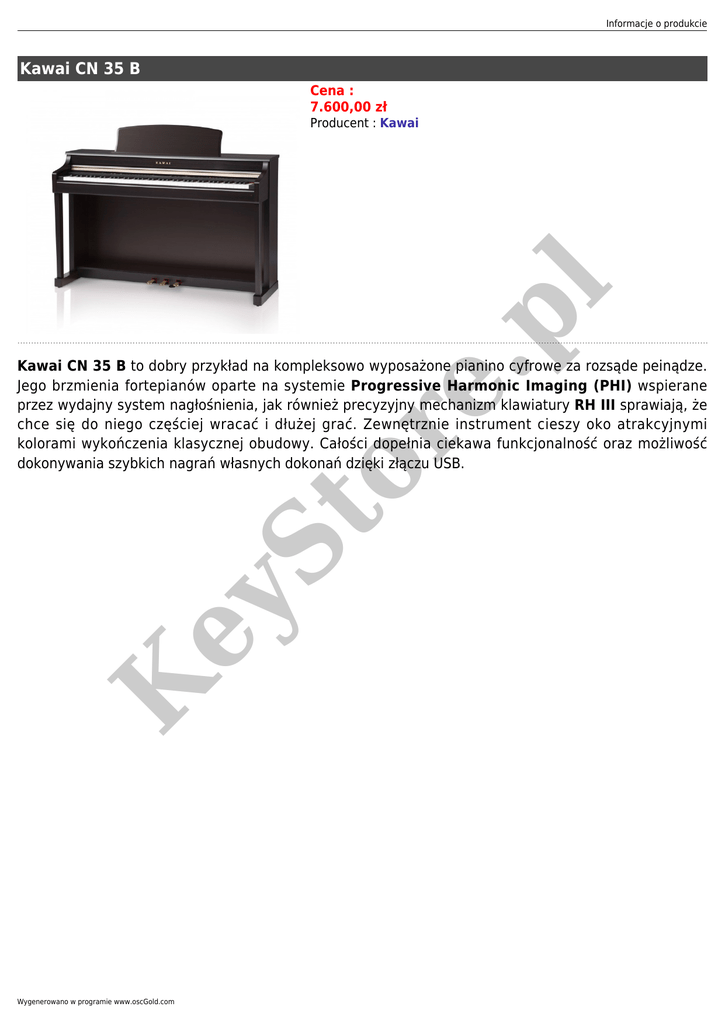Informacje o produkcie Kawai CN 35 B Cena : 7.600,00 zł or e. pl Producent : Kawai K ey St Kawai CN 35 B to dobry przykład na kompleksowo wyposażone pianino cyfrowe za rozsąde peinądze. Jego brzmienia fortepianów oparte na systemie Progressive Harmonic Imaging (PHI) wspierane przez wydajny system nagłośnienia, jak również precyzyjny mechanizm klawiatury RH III sprawiają, że chce się do niego częściej wracać i dłużej grać. Zewnętrznie instrument cieszy oko atrakcyjnymi kolorami wykończenia klasycznej obudowy. Całości dopełnia ciekawa funkcjonalność oraz możliwość dokonywania szybkich nagrań własnych dokonań dzięki złączu USB. Wygenerowano w programie www.oscGold.com or e. pl St ey Podstawowe cechy modelu CN 35: ● ● ● ● ● ● ● ● ● ● ● ● 88 pełnoważonych klawiszy z systemem Responsive Hammer III z wymykiem oraz potrójnym sensorem, pokrycie klawiszy syntetyczną kością słoniową - Ivory Touch 324 brzmienia instrumentalne ( w tym unikalne dla Kawai Concert Grand, Concert Grand2, Studio Grand, Modern Piano,Classic E.Piano, Modern E.Piano, Jazz Organ, Church Organ, Harpsichord, Vibraphone, String Ensemble, Slow Strings, Choir, New Age Pad, Atmosphere) + 12 zestawów perkusyjnych zgodność modułu brzmieniowego z GM2 unikalna opatentowana technologia próbkowania Progressive Harmonic Imaging uwypuklające detale brzmienia i dynamiki fortepianu z próbkowaniem indywidualnym dla każdego z 88 klawiszy 256 głosów polifonii Funkcja podziału klawiatury na brzmieniu fortepianu dla ćwiczeń na jednym instrumencie z nauczycielem Tryby pracy klawiatury: Light, Normal, Heavy, Const Funkcja transpozycji oraz dostrajania Funkcja Concert Magic (40 utworów) - granie za pomocą jednego palca Funkcje edukacyjne: Alfred’s Basic Piano Library Lesson Book Level 1A, Alfred’s Basic Piano Library Lesson Book Level 1B,Alfred’s Premier Piano Course Lesson 1A, Alfred’s Premier Piano Course Lesson 1B, Alfred’s Basic Adult Piano Course Lesson Book Level 1Burgmuller 25 (25 etiud, op. 100), Czerny 30 (Etudes de Mecanisme, op.8-49), Czerny 100 (op.139) Beyer (Vorschule im Klavierspiel, op.101) Funkcja nagrywania:3 utwory, 2 ścieżki, max. 90 000 nut Wbudowany metronom K ● Informacje o produkcie ● ● ● ● ● ● ● ● K ey St or e. pl ● 15 utworów demonstracyjnych Złącza:MIDI ( IN/OUT), USB ( to Host, to Device ), LINE IN ( L/MONO, R), LINE OUT (L/MONO, R), słuchawki x 2 Złącza USB - osobne dla komputera i dla pendrive`a Operacje na pendrive USB: Odtwarzanie i nagrywanie utworów w formatach MP3/WAV/MID, konwersja utworów do audio, zapis plików SMF, formatowanie, kasowanie, zmiana nazw plików Jednostka nagłośnienia: 2 x 20 Watt Potrójny pedał z Grand Feel Pedal System: damper (z funkcją rozpoznania połowy przyciśnięciał pedału), soft, sostenuto Wykończenia: Premium Satin Black, Premium Satin White, Premium Rosewood, Wymiary: 138,2 x 47,3 x 89,2 cm Waga: 55 kg Wygenerowano w programie www.oscGold.com