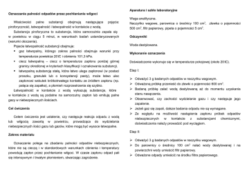 Oznaczanie palności odpadów przez pochłanianie wilgoci Właściwości palne substancji obejmują następujące pojęcia: piroforyczność, łatwopalność i łatwopalność w kontakcie z wodą. Substancja piroforyczna to substancja, która samorzutnie zapala się w powietrzu w ciągu 5 minut, w warunkach badań ustandaryzowanych (warunki otoczenia). Pojecie łatwopalność substancji obejmuje: gaz łatwopalny, którego zakres palności obejmuje warunki przy temperaturze powietrza 20°C i ciśnieniu 101,3 kPa. ciecz łatwopalną – ciecz o temperaturze zapłonu poniżej górnej granicy określonej w kryteriach klasyfikacji i oznakowania substancji. Aparatura i szkło laboratoryjne Waga analityczna. Naczyńko wagowe, parownica o średnicy 100 cm3, zlewka o pojemności 500 cm3, filtr papierowy, pipeta o pojemności 5 cm3. Odczynniki Woda destylowana. Wykonanie oznaczenia Doświadczenie wykonuje się w temperaturze pokojowej (około 20°C). łatwopalną substancję stałą, która łatwo ulega zapłonowi (w postaci proszku, granulek lub o konsystencji pasty), może łatwo ulec zapłonowi wskutek krótkotrwałego kontaktu ze źródłem zapłonu (np. paląca się zapałka), a płomień rozprzestrzenia się szybko. Łatwopalność w kontakcie z wodą wykazują substancje, które w kontakcie z wodą są podatne na samorzutny zapłon lub emitują palne gazy w niebezpiecznych ilościach. Etap I: Cel ćwiczenia Jeżeli gaz się zapali, dalsze badania odpadu nie są wymagane. Ze względu na możliwość nastąpienia zapłonu próbek odpadów Celem ćwiczenia jest ustalenie, czy następuje reakcja odpadu z wodą lub wilgocią zawartą w powietrzu, prowadząca do wydzielania niebezpiecznych ilości gazu lub gazów, które mogą być wysoce łatwopalne. Zakres materiału Oznaczenie polega na zbadaniu palności odpadów niebezpiecznych, które nie są cieczą i w standardowych warunkach ciśnienia i temperatury powodują zapłon przez pochłanianie wilgoci. W czasie zapłonu odpad pali się intensywnym i trwałym płomieniem, stwarzając zagrożenie. Odważyć 3 g badanych odpadów w naczyńku wagowym. Odważoną próbkę przenieść do zlewki o pojemności 600 cm3. Badaną próbkę zalać wodą destylowaną aż do momentu uzyskania stanu nasączenia. Obserwować, czy zachodzi wydzielanie gazu i czy następuje jego zapalenie. niebezpiecznych w kontakcie z substancjami doświadczenia należy prowadzić pod wyciągiem. chemicznymi, Etap II: Odważyć 3 g badanych odpadów w naczyńku wagowym. Do parownicy o średnicy 100 cm3 nalać wody destylowanej i na powierzchni wody umieścić filtr papierowy. Odważone odpady umieścić na środku filtra papierowego. Obserwować, czy zachodzi wydzielanie się gazu i czy następuje jego zapalenie. Jeżeli gaz się zapali, to dalsze badanie odpadu nie jest wymagane. Ze względu na możliwość nastąpienia zapłonu próbek odpadów niebezpiecznych w kontakcie z substancjami doświadczenia należy prowadzić pod wyciągiem. chemicznymi, Etap III: Badany odpad należy uformować w stożek o wysokości 2 cm i średnicy 3 cm z wgłębieniem na szczycie. Do wgłębienia wprowadzić należy kilka kropli wody destylowanej. Obserwować, czy zachodzi wydzielanie gazu i czy następuje jego zapalenie. Jeżeli gaz się zapali, to dalsze badanie odpadu nie jest wymagane Ze względu na możliwość nastąpienia zapłonu próbek odpadów niebezpiecznych w kontakcie z substancjami doświadczenia należy prowadzić pod wyciągiem. chemicznymi, Opracowanie wyników Sprawozdanie powinno zawierać opisy dotyczące procesów, jakie zachodziły na kolejnych etapach przeprowadzanego doświadczenia. BHP Ze względu na możliwość wystąpienia wydzielania gazów oraz płomienia, zaleca się stosowanie okularów ochronnych, maseczek i rękawiczek jednorazowych. Doświadczenie prowadzić pod wyciągiem.