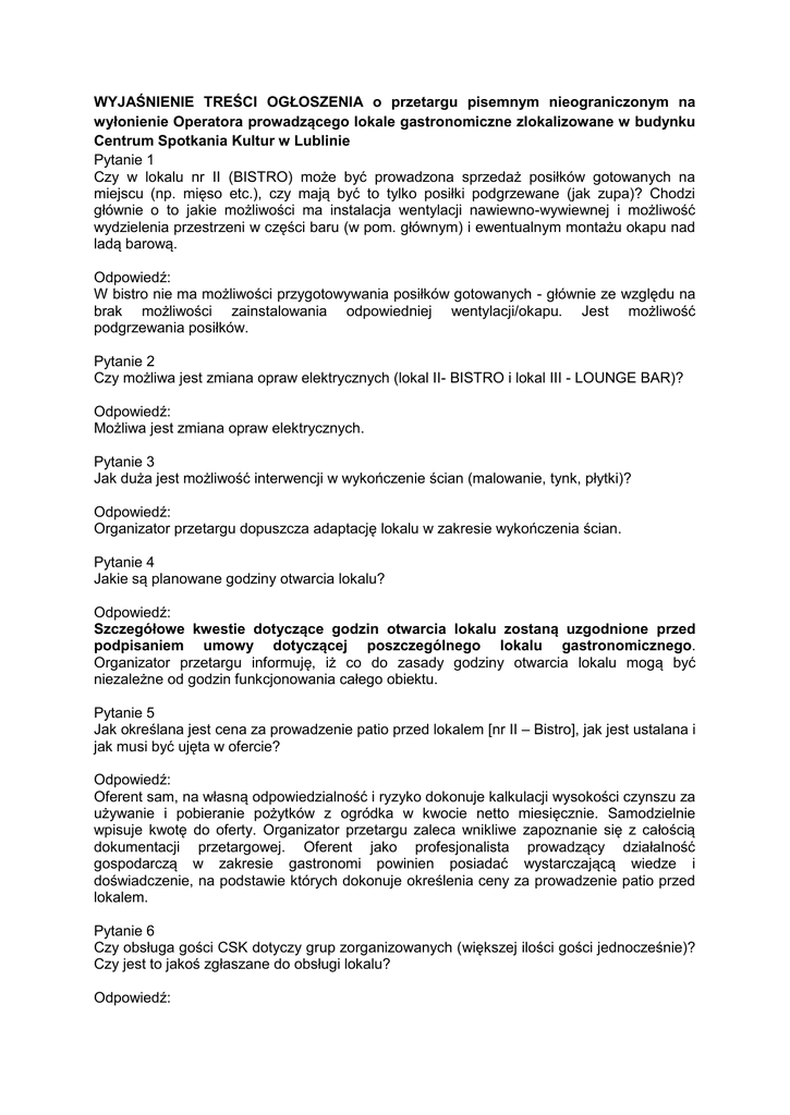 WYJAŚNIENIE TREŚCI OGŁOSZENIA o przetargu pisemnym nieograniczonym na wyłonienie Operatora prowadzącego lokale gastronomiczne zlokalizowane w budynku Centrum Spotkania Kultur w Lublinie Pytanie 1 Czy w lokalu nr II (BISTRO) może być prowadzona sprzedaż posiłków gotowanych na miejscu (np. mięso etc.), czy mają być to tylko posiłki podgrzewane (jak zupa)? Chodzi głównie o to jakie możliwości ma instalacja wentylacji nawiewno-wywiewnej i możliwość wydzielenia przestrzeni w części baru (w pom. głównym) i ewentualnym montażu okapu nad ladą barową. Odpowiedź: W bistro nie ma możliwości przygotowywania posiłków gotowanych - głównie ze względu na brak możliwości zainstalowania odpowiedniej wentylacji/okapu. Jest możliwość podgrzewania posiłków. Pytanie 2 Czy możliwa jest zmiana opraw elektrycznych (lokal II- BISTRO i lokal III - LOUNGE BAR)? Odpowiedź: Możliwa jest zmiana opraw elektrycznych. Pytanie 3 Jak duża jest możliwość interwencji w wykończenie ścian (malowanie, tynk, płytki)? Odpowiedź: Organizator przetargu dopuszcza adaptację lokalu w zakresie wykończenia ścian. Pytanie 4 Jakie są planowane godziny otwarcia lokalu? Odpowiedź: Szczegółowe kwestie dotyczące godzin otwarcia lokalu zostaną uzgodnione przed podpisaniem umowy dotyczącej poszczególnego lokalu gastronomicznego. Organizator przetargu informuję, iż co do zasady godziny otwarcia lokalu mogą być niezależne od godzin funkcjonowania całego obiektu. Pytanie 5 Jak określana jest cena za prowadzenie patio przed lokalem [nr II – Bistro], jak jest ustalana i jak musi być ujęta w ofercie? Odpowiedź: Oferent sam, na własną odpowiedzialność i ryzyko dokonuje kalkulacji wysokości czynszu za używanie i pobieranie pożytków z ogródka w kwocie netto miesięcznie. Samodzielnie wpisuje kwotę do oferty. Organizator przetargu zaleca wnikliwe zapoznanie się z całością dokumentacji przetargowej. Oferent jako profesjonalista prowadzący działalność gospodarczą w zakresie gastronomi powinien posiadać wystarczającą wiedze i doświadczenie, na podstawie których dokonuje określenia ceny za prowadzenie patio przed lokalem. Pytanie 6 Czy obsługa gości CSK dotyczy grup zorganizowanych (większej ilości gości jednocześnie)? Czy jest to jakoś zgłaszane do obsługi lokalu? Odpowiedź: Organizator przetargu zastrzegł sobie możliwość w przypadku zamówień nie przekraczających kwoty określonej w art. 4 pkt 8 ustawy z dnia 29 stycznia 2004 roku Prawo zamówień publicznych (Dz. U. z 2015 r., poz. 2164 ze zm.) to zlecania Operatorom prowadzącym lokale gastronomiczne realizacji zamówień na usługi gastronomiczne. Każdorazowo będzie określana liczba osób oraz menu. Pytanie 7 Czy istnieje możliwość złożenia oferty na przetarg jako jedna osoba fizyczna mająca kilkuletnie doświadczenie gastronomiczne i prowadzenia później tego lokalu przez założoną spółkę cywilną której wspólnikiem będzie osoba wygrywająca przetarg? Odpowiedź: Organizator przetargu dopuszcza możliwość zmiany podmiotowej oferenta na zasadach sukcesji generalnej następującej w wyniku dozwolonego przekształcenia podmiotu bądź dziedziczenia oraz przypadków szczególnej sukcesji z mocy samego prawa. Dotychczasowy oferent pozostaje nadal zobowiązany, do całkowitego wykonania zobowiązania wynikającego z zawartej umowy, pomimo pojawienia się nowego podmiotu odpowiedzialnego za realizację umowy. O fakcie zmiany formy prowadzenia działalności gospodarczej należy wcześniej poinformować Organizatora przetargu. Pytanie 8 Pytania dotyczące poniższych punktów: 14) Operator po podpisaniu umowy przekaże Organizatorowi przetargu 100 kart rabatowych uprawniających do 20% rabatu (upustu) na usługi gastronomiczne świadczone przez Operatora. Pytanie 8.1: Czego dokładnie dotyczy rabat 20%? Odpowiedź: Zgodnie z treścią Ogłoszenia o przetargu rabat dotyczy usług gastronomicznych świadczonych przez Operatora. Pytanie 8.2: Czy jest on określony limitami kwotowymi i ilościowymi na danej karcie? Zgodnie z treścią Ogłoszenia o przetargu wielkość rabatu jest stała i została określona procentowo, w wysokości 20% upustu od końcowej kwoty rachunku/paragonu/faktury. Pytanie 8.3: Czy karty są imienne? Odpowiedź: Organizator przetargu dopuszcza możliwość wydania przez Operatora kart imiennych. Pytanie 8.4: Jakie są zasady przewidziane do korzystania z tych kart? Odpowiedź: Operator jest zobowiązany zawsze uwzględniać 20% rabat. Pytanie 8.5: Czy dotyczą one pracowników CSK? Czy też innych osób? Odpowiedź: Organizator przetargu przekaże 100 kart pracownikom oraz osobom współpracującym z CSK. Pytanie 8.6: Kto pokrywa koszt wydania takich kart? Odpowiedź: Operator poszczególnego lokal. Pytanie 8.7: 15) Operator udzieli 25% rabatu (upustu) gastronomiczne świadczone przez niego. CZEGO I KOGO DOTYCZY RABAT 25%? Organizatorowi przetargu Odpowiedź: Rabat dotyczy usług gastronomicznych świadczonych przez Operatora. Pytanie 8.8: Jakie są zasady jego wykorzystania? Odpowiedź: Na zamówioną usługę gastronomiczną udzielany jest rabat 25%. na usługi