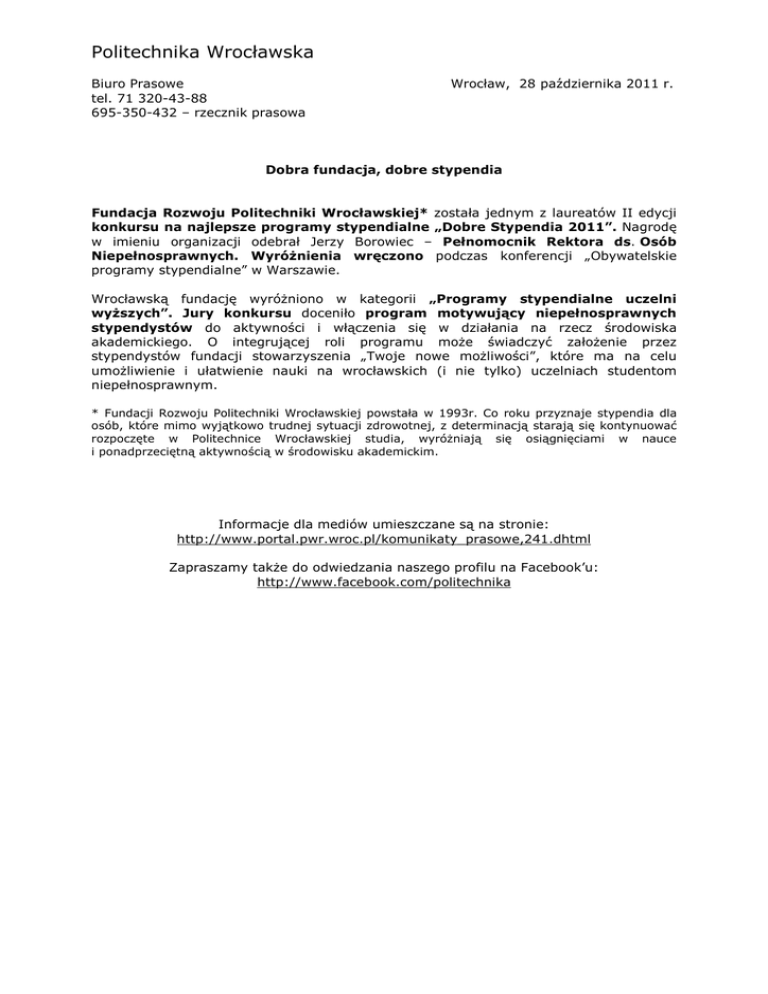 Politechnika Wrocławska Biuro Prasowe tel. 71 320-43-88 695-350-432 – rzecznik prasowa Wrocław, 28 października 2011 r. Dobra fundacja, dobre stypendia Fundacja Rozwoju Politechniki Wrocławskiej* została jednym z laureatów II edycji konkursu na najlepsze programy stypendialne „Dobre Stypendia 2011”. Nagrodę w imieniu organizacji odebrał Jerzy Borowiec – Pełnomocnik Rektora ds. Osób Niepełnosprawnych. Wyróżnienia wręczono podczas konferencji „Obywatelskie programy stypendialne” w Warszawie. Wrocławską fundację wyróżniono w kategorii „Programy stypendialne uczelni wyższych”. Jury konkursu doceniło program motywujący niepełnosprawnych stypendystów do aktywności i włączenia się w działania na rzecz środowiska akademickiego. O integrującej roli programu może świadczyć założenie przez stypendystów fundacji stowarzyszenia „Twoje nowe możliwości”, które ma na celu umożliwienie i ułatwienie nauki na wrocławskich (i nie tylko) uczelniach studentom niepełnosprawnym. * Fundacji Rozwoju Politechniki Wrocławskiej powstała w 1993r. Co roku przyznaje stypendia dla osób, które mimo wyjątkowo trudnej sytuacji zdrowotnej, z determinacją starają się kontynuować rozpoczęte w Politechnice Wrocławskiej studia, wyróżniają się osiągnięciami w nauce i ponadprzeciętną aktywnością w środowisku akademickim. Informacje dla mediów umieszczane są na stronie: http://www.portal.pwr.wroc.pl/komunikaty_prasowe,241.dhtml Zapraszamy także do odwiedzania naszego profilu na Facebook’u: http://www.facebook.com/politechnika