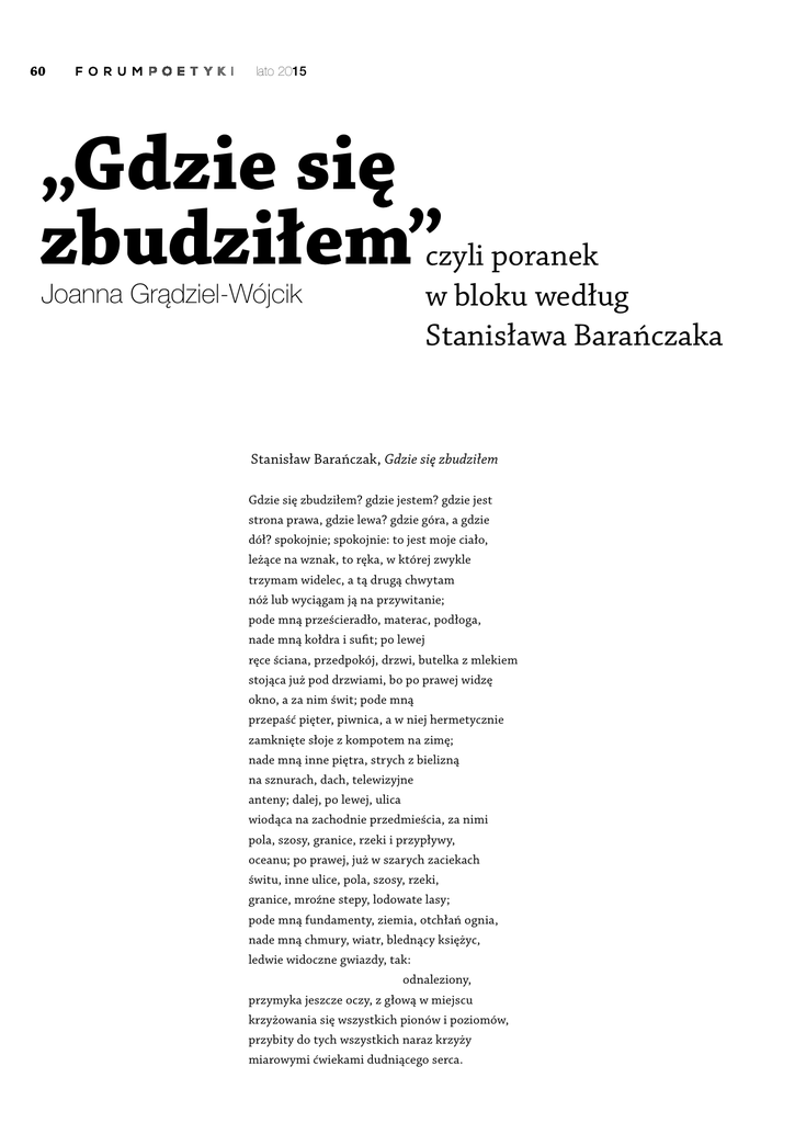 60 lato 2015 „Gdzie się zbudziłem” Joanna Grądziel-Wójcik czyli poranek w bloku według Stanisława Barańczaka Stanisław Barańczak, Gdzie się zbudziłem Gdzie się zbudziłem? gdzie jestem? gdzie jest strona prawa, gdzie lewa? gdzie góra, a gdzie dół? spokojnie; spokojnie: to jest moje ciało, leżące na wznak, to ręka, w której zwykle trzymam widelec, a tą drugą chwytam nóż lub wyciągam ją na przywitanie; pode mną prześcieradło, materac, podłoga, nade mną kołdra i sufit; po lewej ręce ściana, przedpokój, drzwi, butelka z mlekiem stojąca już pod drzwiami, bo po prawej widzę okno, a za nim świt; pode mną przepaść pięter, piwnica, a w niej hermetycznie zamknięte słoje z kompotem na zimę; nade mną inne piętra, strych z bielizną na sznurach, dach, telewizyjne anteny; dalej, po lewej, ulica wiodąca na zachodnie przedmieścia, za nimi pola, szosy, granice, rzeki i przypływy, oceanu; po prawej, już w szarych zaciekach świtu, inne ulice, pola, szosy, rzeki, granice, mroźne stepy, lodowate lasy; pode mną fundamenty, ziemia, otchłań ognia, nade mną chmury, wiatr, blednący księżyc, ledwie widoczne gwiazdy, tak: odnaleziony, przymyka jeszcze oczy, z głową w miejscu krzyżowania się wszystkich pionów i poziomów, przybity do tych wszystkich naraz krzyży miarowymi ćwiekami dudniącego serca. praktyki | Joanna Grądziel-Wójcik, „Gdzie się zbudziłem”... Zacząć wypada od tego, co dane zostało w wierszu1 w sensie jak najbardziej dosłownym: od „niepowtarzalnej prawdy konkretu”2 w planie świata przedstawionego, do której taką wagę przywiązywał Stanisław Barańczak. Określenie psychosomatycznej i percepcyjnej sytuacji podmiotu możliwe jest dzięki ustaleniu czasoprzestrzennych relacji, w których ten się znalazł. Tekst lokuje bowiem „ja” w konkretnym „tu i teraz”, determinując jego sposób wysłowienia oraz nadając czytelnikowi kierunek interpretacji – nie ma właściwie w wierszu niczego, czego wcześniej nie byłoby w zmysłach bohatera3, a jego rozbudowany, rozwijający się in statu nascendi monolog stanowi odpowiedź na tytułowe pytanie: „Gdzie jestem” oraz siłę napędową dla następujących po nim wersów. Odpowiedź nie wydaje się skomplikowana: podmiot znajduje się w bloku, w swoim mieszkaniu, we własnym łóżku; jego przebudzenie ma charakter w pełni fizyczny, dający się odnieść do potocznego doświadczenia dezorientacji przestrzennej, która towarzyszy nam zwykle w nowym, obcym miejscu – otwierając oczy, nie potrafimy się odnaleźć, określić, gdzie jesteśmy. Bohatera zawodzi czucie głębokie, nie działa sprawnie zmysł propriocepcji, który wiąże się ze świadomością lokalizacji ciała w przestrzeni, dlatego też dwa pierwsze wersy wypełniają krótkie pytania, pięciokrotnie, jakby w popłochu i nerwowości powtarzające zaimek pytający. Tekst rozpoczyna się tym samym od specyficznego „układu skracania”, redukowania fraz w celu doprecyzowania znaczeń (odwrotnie niż w Peiperowskim układzie rozkwitania4): „Gdzie się zbudziłem? gdzie jestem? gdzie jest” i ten swoisty redukcjonizm poznawczy, mimo zataczania przez wiersz coraz szerszych kręgów w przestrzeni, będzie nam towarzyszył w dalszym jego ciągu. Bohater stara się ustalić swoje położenie i relacje ze środowiskiem zewnętrznym – „gdzie jest / strona prawa, gdzie lewa? gdzie góra, a gdzie / dół?” – i wysiłek ten zajmuje niemal cały tekst, który wyjaśnia też przyczynę tej dezorientacji – zaburzenia propriocepcji związane są bowiem ze specyficzną sytuacją architektoniczną, która oddziałuje na sposób językowego poznawania świata5. Poczucie zagubienia i niekoherencji obrazu własnego ciała znajdują tu bowiem odbicie w dezintegracji na poziomie składni. Myślenie o świecie zaczyna się zatem od ciała. Próbując rozpoznać strony świata, podmiot lokuje punkt orientacyjny we własnym ciele, jakby na nowo je odnajdując i nazywając. Sytuacja jest zgoła gombrowiczowska: ja, niczym Józio w Ferdydurke, budzi się we własnym pokoju z wrażeniem obcości i próbuje odbudować swoją tożsamość, zaczynając od uporządkowań somatycznych: „to ręka, w której zwykle / trzymam widelec, a tą drugą chwytam / nóż lub wyciągam ją na przywitanie”. Zbudzić się, znaczy być świadomie, co możliwe jest dzięki rekorporalizacji „ja” (umiejscowienie to wszak ucieleśnienie) i przywróceniu bądź nadaniu przezeń światu porządku: „Obecność ciała tutaj koordynuje doświadczenie przestrzeni, określa osie postrzegania i odmierza egzystencjalne dystanse. Ruch i czas stają się zasadniczymi komponentami tego rodzaju doświadczenia, Wszystkie wiersze Stanisława Barańczaka cytuję za wydaniem: S. Barańczak, Wiersze zebrane, Kraków 2007. Tekst Gdzie się zbudziłem – na s. 102. 2 Określenie pochodzi z tytułu wywiadu przeprowadzonego z Barańczakiem. Zob. Niepowtarzalna prawda konkretu, rozmawiała Irena Grudzińska-Gross, „Gazeta Wyborcza” 1996, nr 262, 9.11.1996, s. 8. 3 Zob. A. Nasiłowska, Persona liryczna, Warszawa 2000, s. 49. 4 O układzie rozkwitania u Barańczaka zob. D. Pawelec, Poezja Stanisława Barańczaka. Reguły i konteksty, Katowice 1992, s. 60–62. Szerzej o związkach wczesnej poezji Barańczaka z koncepcją Tadeusza Peipera na przykładzie Dziennika porannego, który wyrasta z ducha i w krytycznej kontynuacji myśli przywódcy pierwszej awangardy, pisałam w tekście „Zmiażdżona epopeja”. Dziennik poranny Stanisława Barańczaka a twórczość Tadeusza Peipera, [w:] J. Grądziel-Wójcik, Przestrzeń porównań. Szkice o polskiej poezji współczesnej, Poznań 2010, s. 114–130. 5 Zob. M. Rembowska-Płuciennik, Propriocepcja, [w:] Sensualność w kulturze polskiej, <http://sensualnosc.ibl.waw.pl/pl/articles/propriocepcja-394/> [dostęp: 26.01.2015]. 1 61 62 lato 2015 nierozdzielnymi z przestrzenią”6. Dla podmiotu w