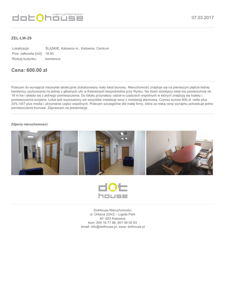 07.03.2017 ZEL-LW-29 Lokalizacja: ŚLĄSKIE, Katowice m., Katowice, Centrum Pow. całkowita [m2]: 18.00 Rodzaj budynku: kamienica Cena: 600.00 zł Polecam do wynajęcia niezwykle atrakcyjnie zlokalizowany mały lokal biurowy. Nieruchomość znajduje się na pierwszym piętrze ładnej kamienicy usytuowanej na jednej z głównych ulic w Katowicach bezpośrednio przy Rynku. Na dzień dzisiejszy lokal ma powierzchnię ok. 18 m kw i składa się z jednego pomieszczenia. Do lokalu przynależy udział w częściach wspólnych w których znajdują się toalety i pomieszczenia socjalne. Lokal jest wyposażony we wszystkie instalacje wraz z instalacją alarmową. Czynsz wynosi 600 zł. netto plus 23% VAT plus media i utrzymanie części wspólnych. Polecam szczególnie dla małej firmy, która za niską cenę wynajmu potrzebuje jedno pomieszczenie biurowe. Zapraszam na prezentację. Zdjecia nieruchomosci: DotHouse Nieruchomości ul. Orkana 22A/2 – Ligota Park 40 -553 Katowice kom: 504 16 77 88, 601 08 00 63 email: [email protected], www: dothouse.pl