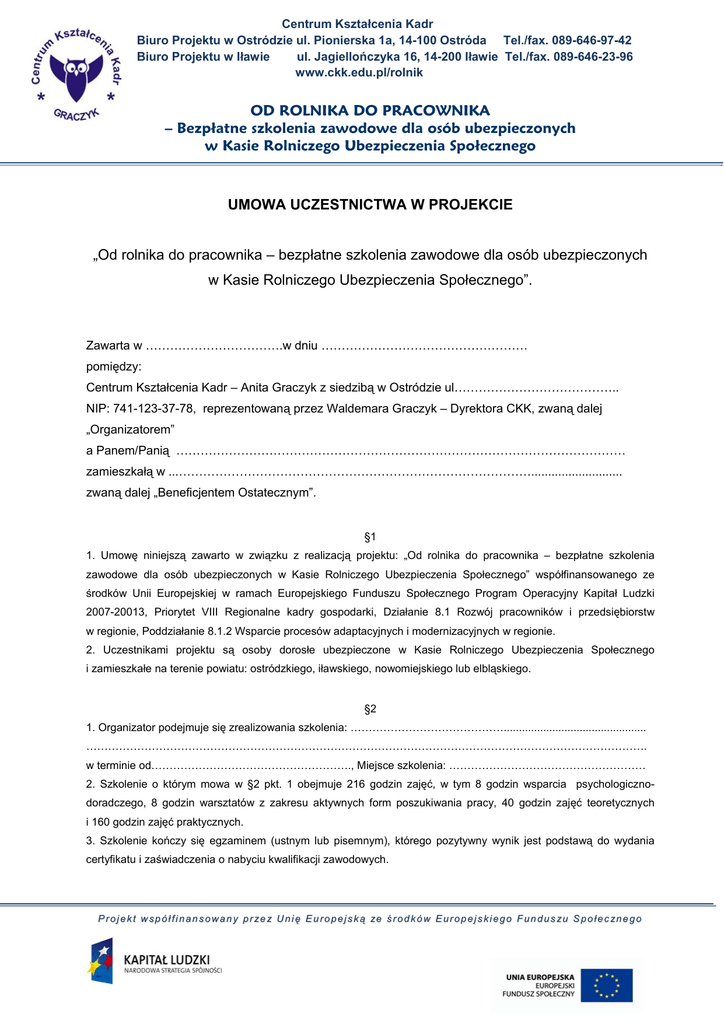 Centrum Kształcenia Kadr Biuro Projektu w Ostródzie ul. Pionierska 1a, 14-100 Ostróda Tel./fax. 089-646-97-42 Biuro Projektu w Iławie ul. Jagiellończyka 16, 14-200 Iławie Tel./fax. 089-646-23-96 www.ckk.edu.pl/rolnik OD ROLNIKA DO PRACOWNIKA – Bezpłatne szkolenia zawodowe dla osób ubezpieczonych w Kasie Rolniczego Ubezpieczenia Społecznego UMOWA UCZESTNICTWA W PROJEKCIE „Od rolnika do pracownika – bezpłatne szkolenia zawodowe dla osób ubezpieczonych w Kasie Rolniczego Ubezpieczenia Społecznego”. Zawarta w …………………………….w dniu …………………………………………… pomiędzy: Centrum Kształcenia Kadr – Anita Graczyk z siedzibą w Ostródzie ul………………………………….. NIP: 741-123-37-78, reprezentowaną przez Waldemara Graczyk – Dyrektora CKK, zwaną dalej „Organizatorem” a Panem/Panią ………………………………………………………………………………………………… zamieszkałą w ...……………………………………………………………………………........................... zwaną dalej „Beneficjentem Ostatecznym”. §1 1. Umowę niniejszą zawarto w związku z realizacją projektu: „Od rolnika do pracownika – bezpłatne szkolenia zawodowe dla osób ubezpieczonych w Kasie Rolniczego Ubezpieczenia Społecznego” współfinansowanego ze środków Unii Europejskiej w ramach Europejskiego Funduszu Społecznego Program Operacyjny Kapitał Ludzki 2007-20013, Priorytet VIII Regionalne kadry gospodarki, Działanie 8.1 Rozwój pracowników i przedsiębiorstw w regionie, Poddziałanie 8.1.2 Wsparcie procesów adaptacyjnych i modernizacyjnych w regionie. 2. Uczestnikami projektu są osoby dorosłe ubezpieczone w Kasie Rolniczego Ubezpieczenia Społecznego i zamieszkałe na terenie powiatu: ostródzkiego, iławskiego, nowomiejskiego lub elbląskiego. §2 1. Organizator podejmuje się zrealizowania szkolenia: ……………………………………............................................... ………………………………………………………………………………………………………………………………………. w terminie od………………………………………………., Miejsce szkolenia: ……………………………………………… 2. Szkolenie o którym mowa w §2 pkt. 1 obejmuje 216 godzin zajęć, w tym 8 godzin wsparcia psychologicznodoradczego, 8 godzin warsztatów z zakresu aktywnych form poszukiwania pracy, 40 godzin zajęć teoretycznych i 160 godzin zajęć praktycznych. 3. Szkolenie kończy się egzaminem (ustnym lub pisemnym), którego pozytywny wynik jest podstawą do wydania certyfikatu i zaświadczenia o nabyciu kwalifikacji zawodowych. P r oj ek t w s p ó ł fi n an s ow an y p r ze z U n i ę E u r o pe j s k ą ze ś r o d k ó w E u r o p ej s k i e go F u n d us zu S p o ł ec zn e g o Centrum Kształcenia Kadr Biuro Projektu w Ostródzie ul. Pionierska 1a, 14-100 Ostróda Tel./fax. 089-646-97-42 Biuro Projektu w Iławie ul. Jagiellończyka 16, 14-200 Iławie Tel./fax. 089-646-23-96 www.ckk.edu.pl/rolnik OD ROLNIKA DO PRACOWNIKA – Bezpłatne szkolenia zawodowe dla osób ubezpieczonych w Kasie Rolniczego Ubezpieczenia Społecznego §3 1. Organizator zobowiązuje się do rzetelności w organizowaniu szkoleń oraz stałego nadzoru metodycznego nad przebiegiem szkoleń. 2. Organizator zobowiązuje się do pokrycia kosztów dojazdów na szkolenia dla BO zamieszkałych poza Ostródą i Iławą. 3. Beneficjent Ostateczny zobowiązuje się do przestrzegania regulaminu stanowiącego załącznik do umowy, a w szczególności do: a) regularnego, punktualnego i aktywnego uczestnictwa w zajęciach; opuszczenie zajęć usprawiedliwia: - zwolnienie lekarskie, - pisemne oświadczenie uczestnika kursu wyjaśniające istotne przyczyny nieobecności; b) uczestnictwa w minimum 80 % zajęć w ramach wybranego kursu; c) wypełniania ankiet związanych z realizacją projektu i monitoringiem jego późniejszych rezultatów; d) pisemnego usprawiedliwienia rezygnacji z uczestnictwa w projekcie. 4. Uczestnik kursu jest zobowiązany do wykonywania badań lekarskich we wskazanej placówce w terminie do dwóch tygodni od rozpoczęcia zajęć i dostarczenia stosownego zaświadczenia organizatorowi kursu. 5. W przypadku nieusprawiedliwionej rezygnacji BO z udziału w szkoleniu, BO zobowiązany jest do zwrotu kosztów uczestnictwa w projekcie, poniesionych przez Organizatora. §4 1. Wszelkie zmiany niniejszej umowy wymagają zachowania formy pisemnej po rygorem nieważności. 2. Organizator kursu może w każdym czasie odstąpić od umowy z powodu nienależytego wykonywania umowy przez BO, w szczególności nieusprawiedliwionej nieobecności na szkoleniach w wymiarze przekraczającym 20 % liczby godzin danego szkolenia zawodowego. §5 1. W sprawach nieuregulowanych niniejszą umową zastosowanie mają przepisy Kodeksu Cywilnego. 2. Umowę sporządzono w dwóch jednobrzmiących egzemplarzach, po jednym dla uczestnika kursu i dla organizatora. ……………………………… Organizator …………………………………….. Uczestnik kursu Załączniki: 1. Regulamin projektu, 2. Kserokopia dowodu osobistego. P r oj ek t w s p ó ł fi n an s ow an y p r ze z U n i ę E u r o pe j s k ą ze ś r o d k ó w E u r o p ej s k i e go F u n d us zu S p o ł ec zn e g o