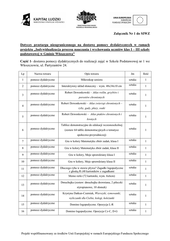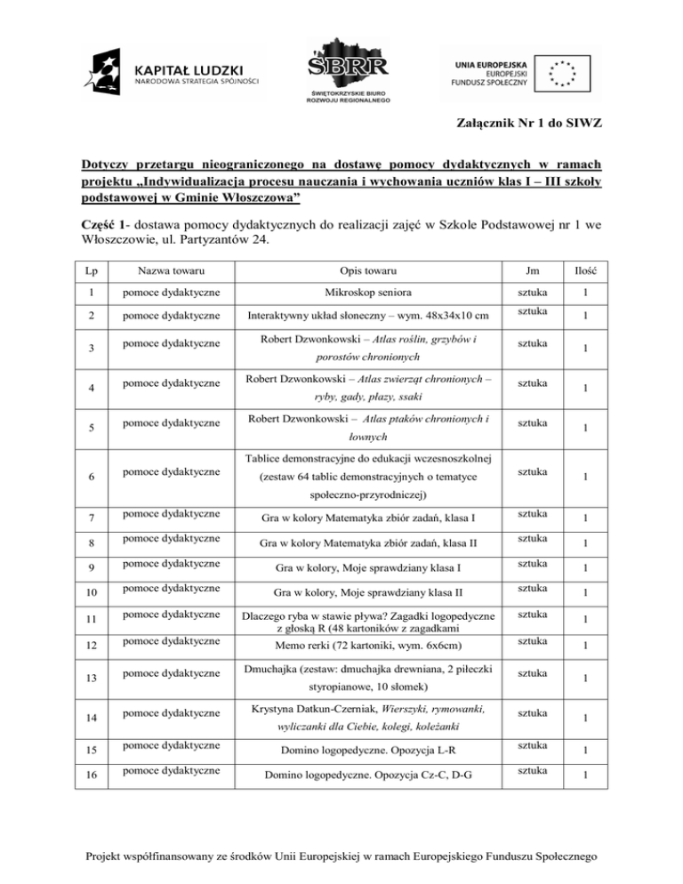 Załącznik Nr 1 do SIWZ Dotyczy przetargu nieograniczonego na dostawę pomocy dydaktycznych w ramach projektu „Indywidualizacja procesu nauczania i wychowania uczniów klas I – III szkoły podstawowej w Gminie Włoszczowa” Część 1- dostawa pomocy dydaktycznych do realizacji zajęć w Szkole Podstawowej nr 1 we Włoszczowie, ul. Partyzantów 24. Lp Nazwa towaru Opis towaru Jm Ilość 1 pomoce dydaktyczne Mikroskop seniora sztuka 1 2 pomoce dydaktyczne Interaktywny układ słoneczny – wym. 48x34x10 cm sztuka 1 3 pomoce dydaktyczne Robert Dzwonkowski – Atlas roślin, grzybów i sztuka 1 4 pomoce dydaktyczne sztuka 1 5 pomoce dydaktyczne sztuka 1 6 pomoce dydaktyczne sztuka 1 porostów chronionych Robert Dzwonkowski – Atlas zwierząt chronionych – ryby, gady, płazy, ssaki Robert Dzwonkowski – Atlas ptaków chronionych i łownych Tablice demonstracyjne do edukacji wczesnoszkolnej (zestaw 64 tablic demonstracyjnych o tematyce społeczno-przyrodniczej) 7 pomoce dydaktyczne Gra w kolory Matematyka zbiór zadań, klasa I sztuka 1 8 pomoce dydaktyczne Gra w kolory Matematyka zbiór zadań, klasa II sztuka 1 9 pomoce dydaktyczne Gra w kolory, Moje sprawdziany klasa I sztuka 1 10 pomoce dydaktyczne Gra w kolory, Moje sprawdziany klasa II sztuka 1 11 pomoce dydaktyczne Dlaczego ryba w stawie pływa? Zagadki logopedyczne z głoską R (48 kartoników z zagadkami sztuka 1 12 pomoce dydaktyczne Memo rerki (72 kartoniki, wym. 6x6cm) sztuka 1 13 pomoce dydaktyczne Dmuchajka (zestaw: dmuchajka drewniana, 2 piłeczki sztuka 1 14 pomoce dydaktyczne sztuka 1 15 pomoce dydaktyczne Domino logopedyczne. Opozycja L-R sztuka 1 16 pomoce dydaktyczne Domino logopedyczne. Opozycja Cz-C, D-G sztuka 1 styropianowe, 10 słomek) Krystyna Datkun-Czerniak, Wierszyki, rymowanki, wyliczanki dla Ciebie, kolegi, koleżanki Projekt współfinansowany ze środków Unii Europejskiej w ramach Europejskiego Funduszu Społecznego 17 pomoce dydaktyczne Domino logopedyczne. Opozycja K-T, Sz-S sztuka 1 18 pomoce dydaktyczne Łamigłówka logopedyczna Junior sztuka 1 19 pomoce dydaktyczne Krystyna Datkun-Czerniak, Logopedia. Jak usprawnić sztuka 1 20 pomoce dydaktyczne sztuka 2 21 pomoce dydaktyczne Mini szczudła – 12 cm sztuka 6 22 pomoce dydaktyczne Namiot z 1 tunelem (wym. namiotu 122x122x94cm, sztuka 1 23 pomoce dydaktyczne Ślady z fakturą - stopy sztuka 1 24 pomoce dydaktyczne Drążki gimnastyczne – (komplet 4 szt, dł. 70 cm) komplet 4 25 pomoce dydaktyczne Skakanka – dł. 2 m sztuka 12 26 pomoce dydaktyczne Welurowe paletki z piłeczką (komplet 2 paletki o śr. komplet 6 27 pomoce dydaktyczne Piłeczki do tenisa stołowego – białe (komplet 6 szt. ) komplet 4 28 pomoce dydaktyczne Tańczące kubeczki – komplet 6 kielichów (wym. 16 komplet 2 mowę dziecka. Poradnik metodyczny Aktywne Ringo, 6 elastycznych kółek o średnicy 16,4 cm wym. tunelu śr. 47, dł. 185 cm) ok. 20cm ,z piłką) cm) oraz 6 piłek (śr. ok. 7 cm) Część 2 – Dostawa pomocy dydaktycznych do realizacji zajęć w Szkole Podstawowej w Kurzelowie, ul. Jana Brożka 7. Lp Nazwa towaru Opis towaru Jm Ilość 1 Pomoce dydaktyczne Bajki – słuchaj i układaj obrazki sztuka 1 2 Pomoce dydaktyczne Nowe zagadki Smoka Obiboka sztuka 1 3 Pomoce dydaktyczne „Zagadki Smoka obiboka” sztuka 1 4 Pomoce dydaktyczne Rzeczowniki , czasowniki i przymiotniki – pakiet zdjęć sztuka 1 5 Pomoce dydaktyczne Matematyka ZOO sztuka 5 6 Pomoce dydaktyczne Szablony sztuka 7 7 Pomoce dydaktyczne Lupa peryskop sztuka 3 8 Pomoce dydaktyczne Pojemniki do obserwacji sztuka 1 9 Pomoce dydaktyczne Stemple pogoda i czas sztuka 3 10 Pomoce dydaktyczne Stemple las sztuka 3 Projekt współfinansowany ze środków Unii Europejskiej w ramach Europejskiego Funduszu Społecznego 11 Pomoce dydaktyczne Menzurki sztuka 1 12 Pomoce dydaktyczne Podziemny odkrywca sztuka 1 13 Pomoce dydaktyczne Warsztat mieszania kolorów sztuka 3 14 Pomoce dydaktyczne Barwniki uzupełniające do warsztatu mieszania kolorów (zestaw 3 kolorów) zestaw 20 15 Pomoce dydaktyczne Poznajemy elektryczność sztuka 1 16 Pomoce dydaktyczne Układ słoneczny sztuka 1 17 Pomoce dydaktyczne Puzzle„Nasze ciało” sztuka 1 18 Pomoce dydaktyczne Puzzle „Las sztuka 3 19 Pomoce dydaktyczne Sudoku sztuka 1 20 Pomoce dydaktyczne Igła magnetyczna sztuka 1 21 Pomoce dydaktyczne Szachy sztuka 3 22 Pomoce dydaktyczne Unia europejska sztuka 1 23 Pomoce dydaktyczne Co się wydarzyło sztuka 2 24 Pomoce dydaktyczne Co się wydarzyło sztuka 2 25 Pomoce dydaktyczne Kreatywne historie: UFO, O zwierzętach, W podróży, W kręgu rodzinnym Zestaw 1 26 Pomoce dydaktyczne Labirynty z biedronką sztuka 1 27 Pomoce dydaktyczne Labirynt magnetyczny Mrówki sztuka 1 28 Pomoce dydaktyczne Labirynt magnetyczny Myszki sztuka 1 29 Pomoce dydaktyczne Gra – zwierzęta sztuka 1 30 Pomoce dydaktyczne Gra – znajome dźwięki sztuka 1 31 Pomoce dydaktyczne Leniwa ósemka sztuka 1 32 Pomoce dydaktyczne Klocki Technik sztuka 2 33 Pomoc dydaktyczna Rzutnik - view sztuka 1 Projekt współfinansowany ze środków Unii Europejskiej w ramach Europejskiego Funduszu Społecznego
