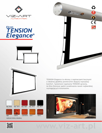 Ekran TENSION Elegance ® TENSION Elegance to ekrany z napinaczami bocznymi o idealnej gładkiej powierzchni dającej najwyższy komfort. Systemowi napinania TENSION sprawia, że Kino Domowe spełni oczekiwania nawet najbardziej wymagających kinomanów. RAL 9016 RAL 1014 RAL 3001 dąb radica czereśnia RAL 7013 buk 1 RAL 9017 buk 2 wybrane kolory obudowy www.viz-art.pl Zastosowanie Ekrany TENSION Elegance z napinaczami bocznymi powstały z myślą o wyjątkowych wnętrzach Kina Domowego - Home Cinema klasy Hi-End. System napinaczy bocznych w ekranach VIZ-ART zapewnia gładką i równą powierzchnię ekranu. Ekran TENSION Elegance ® szerokość TENSION 164 Przeznaczenie: •Kino Domowe Dostepność Wysokość Black Border (cm) Matt White Cine Grey Matt White Cine Grey ● ● 10-40 10-40 TENSION 184 ● ● 10-40 10-40 TENSION 204 ● ● 10-50 10-50 TENSION 264 ● ● 10-60 10-20 TENSION 284 ● ● 10-60 10 TENSION 304 ● o 10-50 - TENSION 334 ● o 10-50 - TENSION 364 ● o 10-20 - TENSION 384 ● o 10 - •sale konferencyjne •sale kinowe i galerie Wygoda użytkowania Ekran TENSION Elegance w formacie obrazu 4:3 dedykowany jest osobom oczekującym komfortu, ekskluzywnych produktów i najlepszego wykonania. Cechuje go zarówno perfekcyjna jakość i funkcjonalność jak i oryginalny i ekskluzywny kształt. Instalacja W prosty sposób zamontujesz ekran do ściany lub sufitu. ● - w stałej ofercie; o - na zamówienie specjalne; Ekran TENSION Elegance Format ekranu 4:3 Obudowa aluminiowa anodowana Przekrój obudowy elipsa (W 13 cm x H 11 cm) Instalacja •sufit •ściana Powierzchnia - Matt White •1,0 Gain •500 g / m2 •150° •0,35 mm •czarny Powierzchnia - Cine Grey •0,8 Gain •490 g / m2 •170° •0,50 mm •czarny Obramowanie szerokość - 5cm (modele „B”) Napęd Somfy Zasilanie 230 V / 50 Hz Cicha praca 42 dB Tłumik drgań w standardzie Opcjonalnie •BB - górny czarny pas •pilot bezprzewodowy •wbudowane RC •wbudowane IR •kolory obudowy RAL i „drewno” W zestawie •ekran •zest. montażowy •włącznik klawiszowy •instrukcja Gwarancja 5 lat Produkcja VIZ-ART Polska wersja 07/02.05.2014