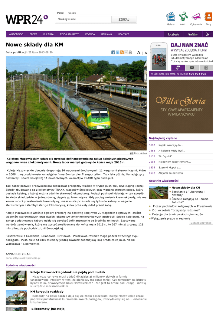 Portal Google Szukaj w sieci Galeria WIADOMOŚCI SPORT KULTURA ROZKŁAD JAZDY POGODA REKLAMA Alert Ogłoszenia Firmy KONTAKT Nowe składy dla KM Data publikacji: 22 lipca 2013 08:30 A | A Byłeś świadkiem wypadku lub dramatycznego zdarzenia? C oś cię zaskoczyło lub rozzłościło? Wyślij SMS lub MMS na numer 600 924 925 Najchętniej czytane 3667 Kajaki wracają do... 2863 A kolonie miały być... 2137 Tir "zgubił"... 2114 Niebawem ruszy remont... 1805 Szeroki kłopot z... 1532 Alejami po nowemu Piotr Antos Kolejom Mazowieckim udało się uzyskać dofinansowanie na zakup kolejnych piętrowych wagonów wraz z lokomotywami. Nowy tabor ma być gotowy do końca maja 2015 r. Koleje Mazowieckie obecnie dysponują 26 wagonami środkowymi i 11 wagonami sterowniczymi, które w 2008 r. wyprodukowała kanadyjska firma Bombardier Transportation. Trzy lata później Kanadyjczycy dostarczyli spółce kolejowej 11 nowoczesnych lokomotyw TRAXX typu push-pull. Ostatnie wiadomości Taki tabor pozwolił przewoźnikowi realizować przejazdy właśnie w trybie push-pull, czyli ciągnij i pchaj. Składy zbudowane są z lokomotywy TRAXX, wagonów środkowych oraz wagonu sterowniczego, który posiada kabinę, z której można zdalnie starować lokomotywą. Pociągi push-pull działają w ten sposób, że kiedy skład jedzie w jedną stronę, ciągnie go lokomotywa. Gdy pociąg zmienia kierunek jazdy, nie ma konieczności przestawiania lokomotywy, maszynista przesiada się tylko do kabiny w wagonie sterowniczym i stamtąd steruje lokomotywą, która pcha cały skład przed sobą. Nowe składy dla KM Spotkanie z "Literaturą i historią" Śmiecie zalegają na Tomcia Palucha? P ożar podkładów kolejowych w Pruszkowie D o w r z eśnia "przejazdy rodzinne" Koleje Mazowieckie właśnie ogłosiły przetarg na dostawę kolejnych 20 wagonów piętrowych, dwóch wagonów sterowniczych oraz dwóch lokomotyw zmiennokierunkowych push-pull. Spółce kolejowej, na zakup dodatkowego taboru udało się uzyskać dofinansowanie ze środków unijnych. Szacowana wartość zamówienia, które ma zostać zrealizowane do końca maja 2015 r., to 267 mln zł, z czego 128 mln zł będzie pochodzić z Unii Europejskiej. Pasażerowie z Grodziska, Milanówka, Brwinowa i Pruszkowa również mogą podróżo w ać tego typu pociągami. Push-pulle od kilku miesięcy jeżdżą również podmiejską linią średnicową m.in. Na linii Warszawa - Skierniewice. ANNA SOŁTYSIAK [email protected] Podobne wiadomości Koleje Mazowieckie jednak nie pójdą pod młotek Mazowsze co roku musi oddać kilkadziesiąt milionów złotych w formie janosikowego. Problem w tym, że pieniędzy ma coraz mniej. Czy remedium na kłopoty byłaby m.in. prywatyzacja Kolei Mazowieckich? - Nie jest to brane pod uwagę - mówią w urzędzie marszałkowskim KM korygują rozkłady Remonty na kolei bardzo dają się we znaki pasażerom. Koleje Mazowieckie chcąc poprawić punktualność kursowania swoich pociągów, zdecydowały się na... odwołanie kilku kursów. Biletomaty już stoją Dotacja dla brwinowskich gimnazjów Wyłączenia prądu w regionie Zobacz wszystkie Spółka Koleje Mazowieckie uruchomiła już część biletomatów na linii Warszawa Skierniewice. Dodaj komentarz Komentarze 0 Jeszcze nikt nie wyraził swojej opinii. Możesz być pierwszy! Dodaj swój komentarz klikając na przycisk obok. Portal wpr24.pl nie ponosi odpowiedzialności za treść opinii. Opinie nie związane z tematem artykułu, wulgarne, obraźliwe, naruszające prawo będą usuwane. Jeżeli uważasz, że dana opinia nie powinna się tu znaleźć, zgłoś ją do moderacji. Wszelkie prawa zastrzeżone. Na podstawie art. 25 ust. 1 pkt 1b ustawy z dnia 4 lutego 1994 roku o prawie autorskim i prawach pokrewnych wpr24.pl wyraźnie zastrzega, że dalsze rozpowszechnianie artykułów zamieszczonych na portalu bez zgody jest zabronione. WIADOMOŚC I SPORT KULTURA ROZKŁAD JAZDY POGODA O GŁOSZENIA FIRMY ALERT REKLAMA KONTAKT Wpisz szukaną fraz Copyright (c) 2009-2012 WPR24.pl - Regionalny portal informacyjny - Pruszków, Grodzisk Mazowiecki - Powered by Invenis CMS Serwis wpr24.pl używa plików cookies w celu identyfikacyji, konfiguracji, utrzymywania sesji, prowadzenia statystyk oraz obsługi emisji reklam. Korzystanie z serwisu wpr24.pl oznacza wyrażenie zgodę na wykorzystywanie plików cookies