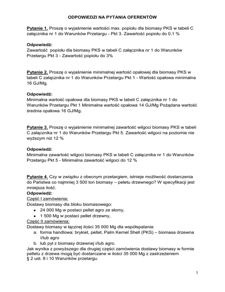ODPOWIEDZI NA PYTANIA OFERENTÓW Pytanie 1. Proszę o wyjaśnienie wartości max. popiołu dla biomasy PKS w tabeli C załącznika nr 1 do Warunków Przetargu - Pkt 3. Zawartość popiołu do 0,1 % Odpowiedź: Zawartość popiołu dla biomasy PKS w tabeli C załącznika nr 1 do Warunków Przetargu Pkt 3 - Zawartość popiołu do 3% Pytanie 2. Proszę o wyjaśnienie minimalnej wartość opałowej dla biomasy PKS w tabeli C załącznika nr 1 do Warunków Przetargu Pkt 1 - Wartość opałowa minimalna 16 GJ/Mg. Odpowiedź: Minimalna wartość opałowa dla biomasy PKS w tabeli C załącznika nr 1 do Warunków Przetargu Pkt 1 Minimalna wartość opałowa 14 GJ/Mg Pożądana wartość średnia opałowa 16 GJ/Mg. Pytanie 3. Proszę o wyjaśnienie minimalnej zawartość wilgoci biomasy PKS w tabeli C załącznika nr 1 do Warunków Przetargu Pkt 5. Zawartość wilgoci na poziomie nie wyższym niż 12 % Odpowiedź: Minimalna zawartość wilgoci biomasy PKS w tabeli C załącznika nr 1 do Warunków Przetargu Pkt 5 - Minimalna zawartość wilgoci do 12 % Pytanie 4. Czy w związku z obecnym przetargiem, istnieje możliwość dostarczenia do Państwa co najmniej 3 500 ton biomasy – peletu drzewnego? W specyfikacji jest mniejsza ilość. Odpowiedź: Część I zamówienia: Dostawy biomasy dla bloku biomasowego: 24 000 Mg w postaci pellet agro ze słomy, 1 500 Mg w postaci pellet drzewny, Część II zamówienia: Dostawy biomasy w łącznej ilości 35 000 Mg dla współspalania: a. forma handlowa: brykiet, pellet, Palm Kernel Shell (PKS) – biomasa drzewna I/lub agro b. lub pył z biomasy drzewnej i/lub agro. Jak wynika z powyższego dla drugiej części zamówienia dostawy biomasy w formie pelletu z drzewa mogą być dostarczane w ilości 35 000 Mg z zastrzeżeniem § 2 ust. 8 i 10 Warunków przetargu. 1