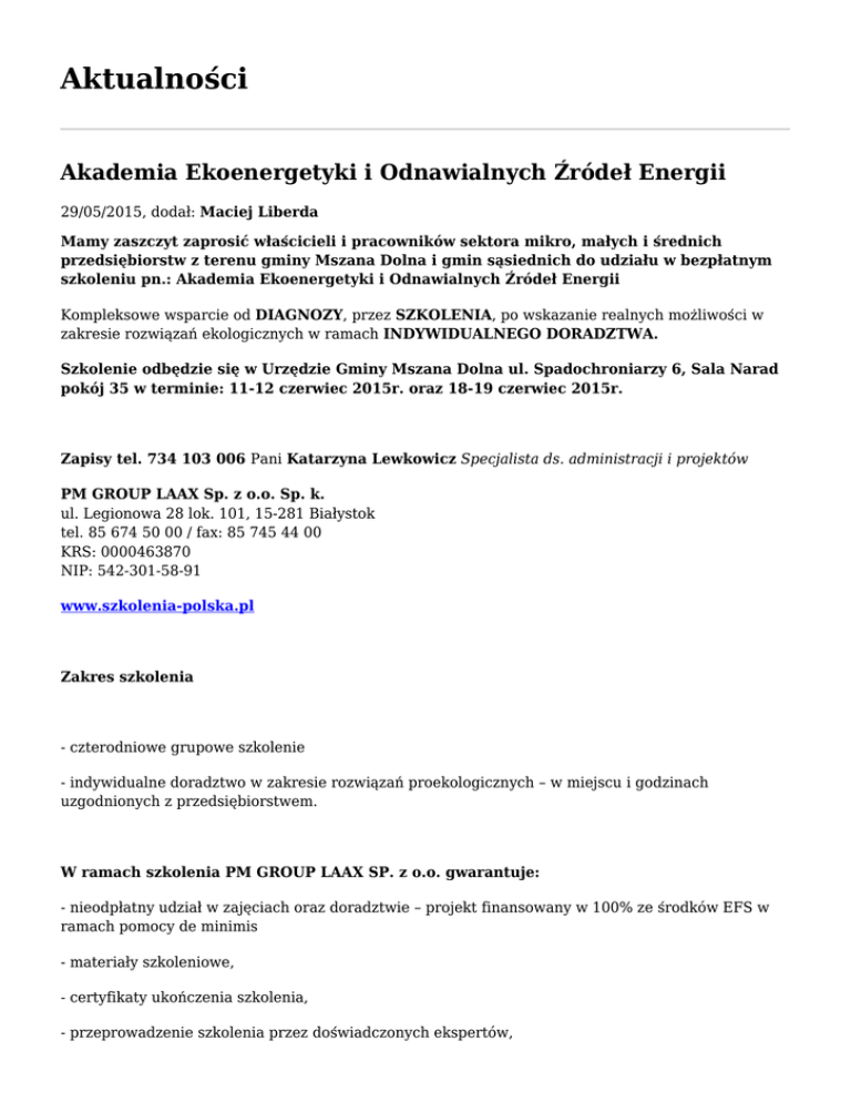 Aktualności Akademia Ekoenergetyki i Odnawialnych Źródeł Energii 29/05/2015, dodał: Maciej Liberda Mamy zaszczyt zaprosić właścicieli i pracowników sektora mikro, małych i średnich przedsiębiorstw z terenu gminy Mszana Dolna i gmin sąsiednich do udziału w bezpłatnym szkoleniu pn.: Akademia Ekoenergetyki i Odnawialnych Źródeł Energii Kompleksowe wsparcie od DIAGNOZY, przez SZKOLENIA, po wskazanie realnych możliwości w zakresie rozwiązań ekologicznych w ramach INDYWIDUALNEGO DORADZTWA. Szkolenie odbędzie się w Urzędzie Gminy Mszana Dolna ul. Spadochroniarzy 6, Sala Narad pokój 35 w terminie: 11-12 czerwiec 2015r. oraz 18-19 czerwiec 2015r. Zapisy tel. 734 103 006 Pani Katarzyna Lewkowicz Specjalista ds. administracji i projektów PM GROUP LAAX Sp. z o.o. Sp. k. ul. Legionowa 28 lok. 101, 15-281 Białystok tel. 85 674 50 00 / fax: 85 745 44 00 KRS: 0000463870 NIP: 542-301-58-91 www.szkolenia-polska.pl Zakres szkolenia - czterodniowe grupowe szkolenie - indywidualne doradztwo w zakresie rozwiązań proekologicznych – w miejscu i godzinach uzgodnionych z przedsiębiorstwem. W ramach szkolenia PM GROUP LAAX SP. z o.o. gwarantuje: - nieodpłatny udział w zajęciach oraz doradztwie – projekt finansowany w 100% ze środków EFS w ramach pomocy de minimis - materiały szkoleniowe, - certyfikaty ukończenia szkolenia, - przeprowadzenie szkolenia przez doświadczonych ekspertów, - wyżywienie w trakcie szkoleń (przerwy kawowe, obiad). Moduły szkoleniowe: Moduł 1 – Przedsiębiorstwo w nowej perspektywie2014-2020 – moduł obowiązkowy ● ● ● ● ● ● ● ● Podstawy prawa wspólnotowego i krajowego w zakresie ochrony środowiska i odnawialnych źródeł energii. Polityka energetyczna państwa do 2020 r. Zarządzanie energią w firmie (definicje, systemy sformalizowane i niesformalizowane) Obowiązki firm dotyczące: ochrony środowiska, zarządzania środowiskowego. Zarządzanie środowiskowe w firmie (definicje, systemy sformalizowane i niesformalizowane, model ISO 14001). Ekologiczny model działania przedsiębiorstwa – z uwzględnieniem wymagań i wytycznych modelu ECCC ”Zielone biuro”. Zasady postępowania związane z promocją zielonych technologii ekologicznych. Metodyka pracy wspierająca tworzenie ekologicznego wizerunku firmy. Czysta produkcja. Marketing i sprzedaż z elementami budowania świadomości ekologicznej. Moduł 2 – Zarządzanie przedsiębiorstwem – sporządzanie audytów ● ● ● ● ● ● ● Zagadnienia formalno – prawne w zakresie efektywności energetycznej. Audyt energetyczny w przedsiębiorstwie – cele i wytyczne. Audyt energetyczny w przedsiębiorstwie – procedury. Audyt energetyczny w przedsiębiorstwie – standardowe usprawnienia termo-modernizacyjne. Zarządzanie energią w przedsiębiorstwie – racjonalizacja użytkowania energii elektrycznej. Zasady działania i obsługa urządzeń do pomiaru efektywności energetycznej. Termomodernizacja budynków Moduł 3 – Fotowoltaika – zasady montażu ● ● ● ● ● ● ● ● Budowa, rodzaje i parametry kolektorów słonecznych oraz wpływ zewnętrznych czynników na ich sprawność. Zasady montażu kolektorów słonecznych. Dobór urządzeń. Solarne instalacje grzewcze – podstawy projektowania, najczęściej popełniane błędy na etapie projektowania i montażu. Kalkulacja opłacalności montażu solarnych instalacji grzewczych. Korzyści ekologiczne, ekonomiczne i społeczne wynikające z zastosowania solarnych instalacji grzewczych. Procedury prawne i administracyjne wymagane do budowy instalacji fotowoltaicznych. Budowa, rodzaje i parametry modułów fotowoltaicznych oraz wpływ zewnętrznych czynników na ich sprawność. Rodzaje systemów fotowoltaicznych, podstawy projektowania, najczęściej popełniane błędy na etapie projektowania i montażu. Kalkulacja opłacalności montażu ogniw fotowoltaicznych. Korzyści ekologiczne, ekonomiczne i społeczne wynikające z zastosowania ogniw PV. Do pobrania : Formularz wstępnej weryfikacji EKO - Moduł 1 - Moduł 2 - Moduł 3