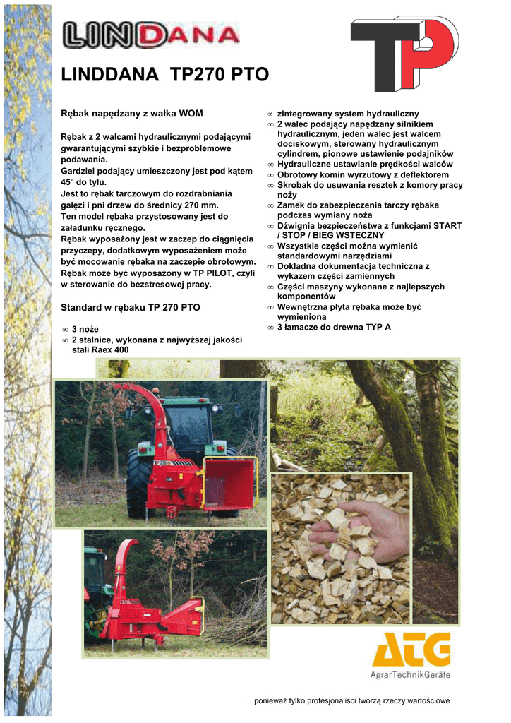 LINDDANA TP270 PTO Rębak napędzany z wałka WOM Rębak z 2 walcami hydraulicznymi podającymi gwarantującymi szybkie i bezproblemowe podawania. Gardziel podający umieszczony jest pod kątem 45° do tyłu. Jest to rębak tarczowym do rozdrabniania gałęzi i pni drzew do średnicy 270 mm. Ten model rębaka przystosowany jest do załadunku ręcznego. Rębak wyposażony jest w zaczep do ciągnięcia przyczepy, dodatkowym wyposażeniem może być mocowanie rębaka na zaczepie obrotowym. Rębak może być wyposażony w TP PILOT, czyli w sterowanie do bezstresowej pracy. Standard w rębaku TP 270 PTO • 3 noże • 2 stalnice, wykonana z najwyższej jakości stali Raex 400 • zintegrowany system hydrauliczny • 2 walec podający napędzany silnikiem hydraulicznym, jeden walec jest walcem dociskowym, sterowany hydraulicznym cylindrem, pionowe ustawienie podajników • Hydrauliczne ustawianie prędkości walców • Obrotowy komin wyrzutowy z deflektorem • Skrobak do usuwania resztek z komory pracy noży • Zamek do zabezpieczenia tarczy rębaka podczas wymiany noża • Dźwignia bezpieczeństwa z funkcjami START / STOP / BIEG WSTECZNY • Wszystkie części można wymienić standardowymi narzędziami • Dokładna dokumentacja techniczna z wykazem części zamiennych • Części maszyny wykonane z najlepszych komponentów • Wewnętrzna płyta rębaka może być wymieniona • 3 łamacze do drewna TYP A …ponieważ tylko profesjonaliści tworzą rzeczy wartościowe Dane techniczne: Średnica gałęzi i pni drzew max 270 mm Wymiary wlotu gardziela 280 x 600 mm (szer. x wys.) Obsługa Dźwignia bezpieczeństwa z funkcjami START / STOP / BIEG WSTECZNY Rodzaj rębaka rębak tarczowy Kąt podawania materiału 45° Średnica tarczy 960 mm Ciężar tarczy 274 kg Położenie gardzielą wlotu 45° od tyłu do kierunku jazdy System podawania hydrauliczny, za pomocą 2 walców, dociskane hydraulicznym cylindrem Ułożenie walca podającego pionowo Ilość noży 3 szt. Długość zrębki 11 - 21 mm Stalnica 1 szt. pozioma, 1 szt. pionowa Zapotrzebowanie mocy 80-150 kW (100-200 KM) Obroty na wale odbioru mocy WOM: 540 obr. / min lub 1000obr. / min Wał napędowy WOM Waltersheid P500, dł.= 710mm 3-punktowy zaczep kategoria 2 Wydajność 6-60 m³ / h zrębki Ciężar 1385 kg Max. nacisk na zaczep przyczepy 500 kg Dodatkowe wyposażenie TP PILOT do ochrony silnika traktora przed przeciążeniem Łamacz do drewna TYP B w zależności od wielkości zrębki Przedłużenie rury wylotowej 500 mm pionowe, 1500m w poziome, przedłużenie nad traktorem 3700mm, wysokość 2230 mm Zestaw narzędzi Narzędzia do codziennej obsługi rębaka Oświetlenie drogowe Tylne oświetlenie drogowe Kontakt: Dariusz Glen Tel.: 536 187 110 E-mail: [email protected] …ponieważ tylko profesjonaliści tworzą rzeczy wartościowe