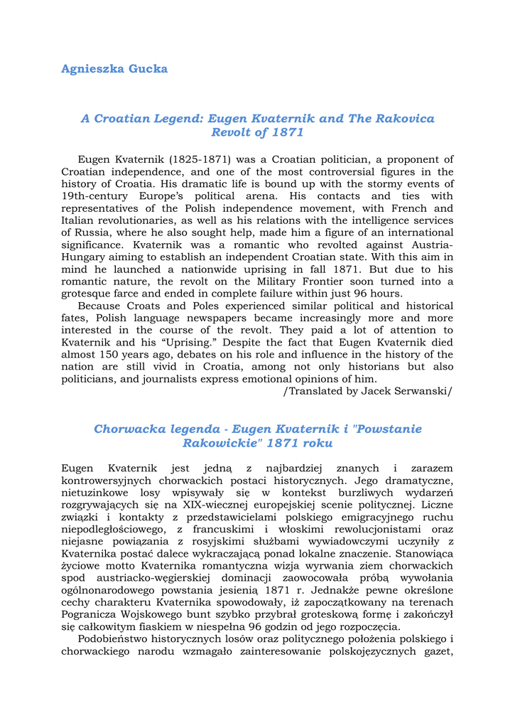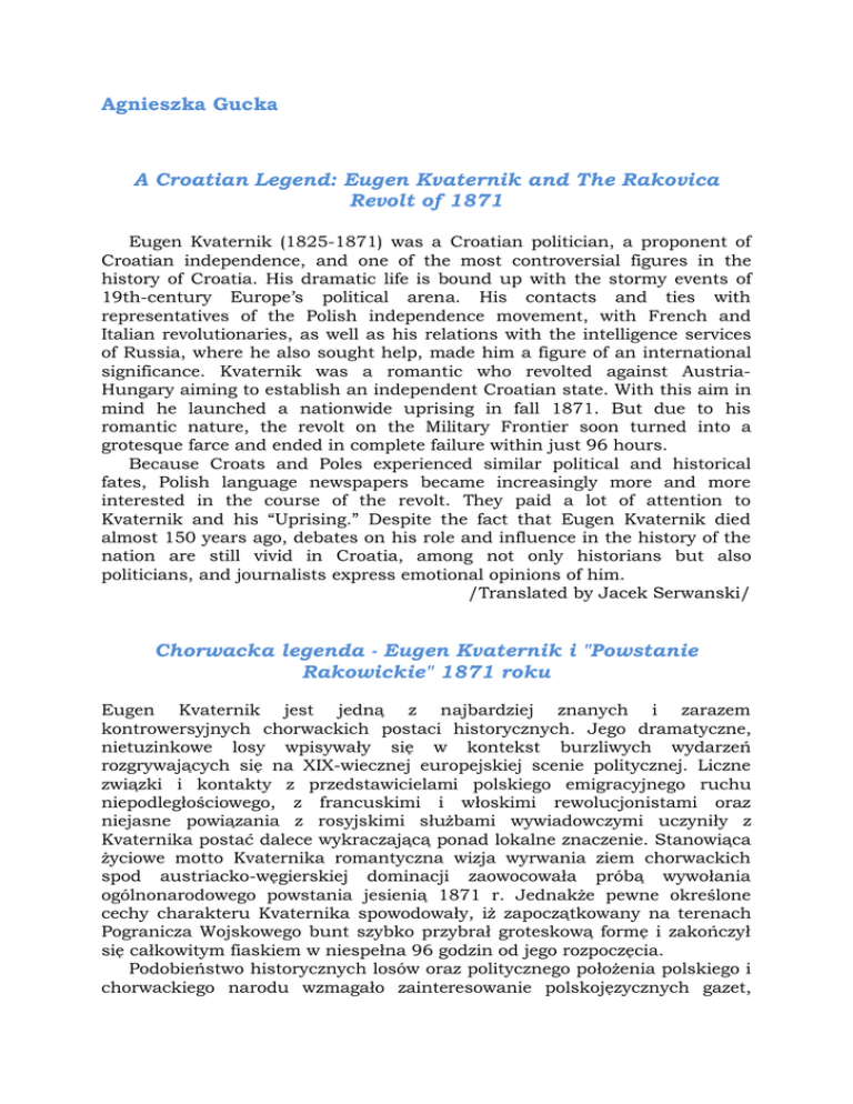 Agnieszka Gucka A Croatian Legend: Eugen Kvaternik and The Rakovica Revolt of 1871 Eugen Kvaternik (1825-1871) was a Croatian politician, a proponent of Croatian independence, and one of the most controversial figures in the history of Croatia. His dramatic life is bound up with the stormy events of 19th-century Europe’s political arena. His contacts and ties with representatives of the Polish independence movement, with French and Italian revolutionaries, as well as his relations with the intelligence services of Russia, where he also sought help, made him a figure of an international significance. Kvaternik was a romantic who revolted against AustriaHungary aiming to establish an independent Croatian state. With this aim in mind he launched a nationwide uprising in fall 1871. But due to his romantic nature, the revolt on the Military Frontier soon turned into a grotesque farce and ended in complete failure within just 96 hours. Because Croats and Poles experienced similar political and historical fates, Polish language newspapers became increasingly more and more interested in the course of the revolt. They paid a lot of attention to Kvaternik and his “Uprising.” Despite the fact that Eugen Kvaternik died almost 150 years ago, debates on his role and influence in the history of the nation are still vivid in Croatia, among not only historians but also politicians, and journalists express emotional opinions of him. /Translated by Jacek Serwanski/ Chorwacka legenda - Eugen Kvaternik i "Powstanie Rakowickie" 1871 roku Eugen Kvaternik jest jedną z najbardziej znanych i zarazem kontrowersyjnych chorwackich postaci historycznych. Jego dramatyczne, nietuzinkowe losy wpisywały się w kontekst burzliwych wydarzeń rozgrywających się na XIX-wiecznej europejskiej scenie politycznej. Liczne związki i kontakty z przedstawicielami polskiego emigracyjnego ruchu niepodległościowego, z francuskimi i włoskimi rewolucjonistami oraz niejasne powiązania z rosyjskimi służbami wywiadowczymi uczyniły z Kvaternika postać dalece wykraczającą ponad lokalne znaczenie. Stanowiąca życiowe motto Kvaternika romantyczna wizja wyrwania ziem chorwackich spod austriacko-węgierskiej dominacji zaowocowała próbą wywołania ogólnonarodowego powstania jesienią 1871 r. Jednakże pewne określone cechy charakteru Kvaternika spowodowały, iż zapoczątkowany na terenach Pogranicza Wojskowego bunt szybko przybrał groteskową formę i zakończył się całkowitym fiaskiem w niespełna 96 godzin od jego rozpoczęcia. Podobieństwo historycznych losów oraz politycznego położenia polskiego i chorwackiego narodu wzmagało zainteresowanie polskojęzycznych gazet, które żywo i obszernie relacjonowały związane z Kvaternikiem i jego "powstaniem" wydarzenia. Mimo, iż od śmierci Eugena Kvaternika minęło już prawie półtora wieku, dyskusja na temat wpływu jego osoby na dalsze losy chorwackiego narodu trwa po dziś dzień, rozpalając emocje nie tylko historyków, ale też licznych polityków i publicystów.