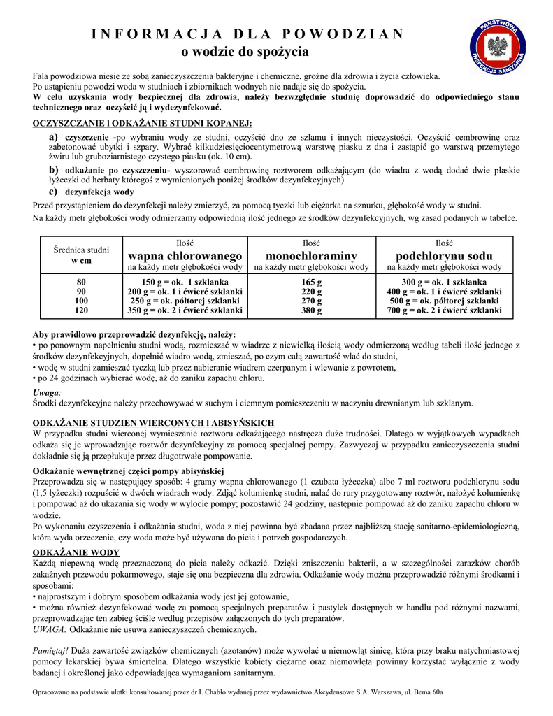 INFORMACJA DLA POWODZIAN o wodzie do spożycia Fala powodziowa niesie ze sobą zanieczyszczenia bakteryjne i chemiczne, groźne dla zdrowia i życia człowieka. Po ustąpieniu powodzi woda w studniach i zbiornikach wodnych nie nadaje się do spożycia. W celu uzyskania wody bezpiecznej dla zdrowia, należy bezwzględnie studnię doprowadzić do odpowiedniego stanu technicznego oraz oczyścić ją i wydezynfekować. OCZYSZCZANIE l ODKAŻANIE STUDNI KOPANEJ: a) czyszczenie -po wybraniu wody ze studni, oczyścić dno ze szlamu i innych nieczystości. Oczyścić cembrowinę oraz zabetonować ubytki i szpary. Wybrać kilkudziesięciocentymetrową warstwę piasku z dna i zastąpić go warstwą przemytego żwiru lub gruboziarnistego czystego piasku (ok. 10 cm). b) odkażanie po czyszczeniu- wyszorować cembrowinę roztworem odkażającym (do wiadra z wodą dodać dwie płaskie łyżeczki od herbaty któregoś z wymienionych poniżej środków dezynfekcyjnych) c) dezynfekcja wody Przed przystąpieniem do dezynfekcji należy zmierzyć, za pomocą tyczki lub ciężarka na sznurku, głębokość wody w studni. Na każdy metr głębokości wody odmierzamy odpowiednią ilość jednego ze środków dezynfekcyjnych, wg zasad podanych w tabelce. Średnica studni w cm 80 90 100 120 Ilość Ilość Ilość wapna chlorowanego monochloraminy podchlorynu sodu na każdy metr głębokości wody na każdy metr głębokości wody na każdy metr głębokości wody 150 g = ok. 1 szklanka 200 g = ok. 1 i ćwierć szklanki 250 g = ok. półtorej szklanki 350 g = ok. 2 i ćwierć szklanki 165 g 220 g 270 g 380 g 300 g = ok. 1 szklanka 400 g = ok. 1 i ćwierć szklanki 500 g = ok. półtorej szklanki 700 g = ok. 2 i ćwierć szklanki Aby prawidłowo przeprowadzić dezynfekcję, należy: • po ponownym napełnieniu studni wodą, rozmieszać w wiadrze z niewielką ilością wody odmierzoną według tabeli ilość jednego z środków dezynfekcyjnych, dopełnić wiadro wodą, zmieszać, po czym całą zawartość wlać do studni, • wodę w studni zamieszać tyczką lub przez nabieranie wiadrem czerpanym i wlewanie z powrotem, • po 24 godzinach wybierać wodę, aż do zaniku zapachu chloru. Uwaga: Środki dezynfekcyjne należy przechowywać w suchym i ciemnym pomieszczeniu w naczyniu drewnianym lub szklanym. ODKAŻANIE STUDZIEN WIERCONYCH l ABISYŃSKICH W przypadku studni wierconej wymieszanie roztworu odkażającego nastręcza duże trudności. Dlatego w wyjątkowych wypadkach odkaża się je wprowadzając roztwór dezynfekcyjny za pomocą specjalnej pompy. Zazwyczaj w przypadku zanieczyszczenia studni dokładnie się ją przepłukuje przez długotrwałe pompowanie. Odkażanie wewnętrznej części pompy abisyńskiej Przeprowadza się w następujący sposób: 4 gramy wapna chlorowanego (1 czubata łyżeczka) albo 7 ml roztworu podchlorynu sodu (1,5 łyżeczki) rozpuścić w dwóch wiadrach wody. Zdjąć kolumienkę studni, nalać do rury przygotowany roztwór, nałożyć kolumienkę i pompować aż do ukazania się wody w wylocie pompy; pozostawić 24 godziny, następnie pompować aż do zaniku zapachu chloru w wodzie. Po wykonaniu czyszczenia i odkażania studni, woda z niej powinna być zbadana przez najbliższą stację sanitarno-epidemiologiczną, która wyda orzeczenie, czy woda może być używana do picia i potrzeb gospodarczych. ODKAŻANIE WODY Każdą niepewną wodę przeznaczoną do picia należy odkazić. Dzięki zniszczeniu bakterii, a w szczególności zarazków chorób zakaźnych przewodu pokarmowego, staje się ona bezpieczna dla zdrowia. Odkażanie wody można przeprowadzić różnymi środkami i sposobami: • najprostszym i dobrym sposobem odkażania wody jest jej gotowanie, • można również dezynfekować wodę za pomocą specjalnych preparatów i pastylek dostępnych w handlu pod różnymi nazwami, przeprowadzając ten zabieg ściśle według przepisów załączonych do tych preparatów. UWAGA: Odkażanie nie usuwa zanieczyszczeń chemicznych. Pamiętaj! Duża zawartość związków chemicznych (azotanów) może wywołać u niemowląt sinicę, która przy braku natychmiastowej pomocy lekarskiej bywa śmiertelna. Dlatego wszystkie kobiety ciężarne oraz niemowlęta powinny korzystać wyłącznie z wody badanej i określonej jako odpowiadająca wymaganiom sanitarnym. Opracowano na podstawie ulotki konsultowanej przez dr I. Chabło wydanej przez wydawnictwo Akcydensowe S.A. Warszawa, ul. Bema 60a