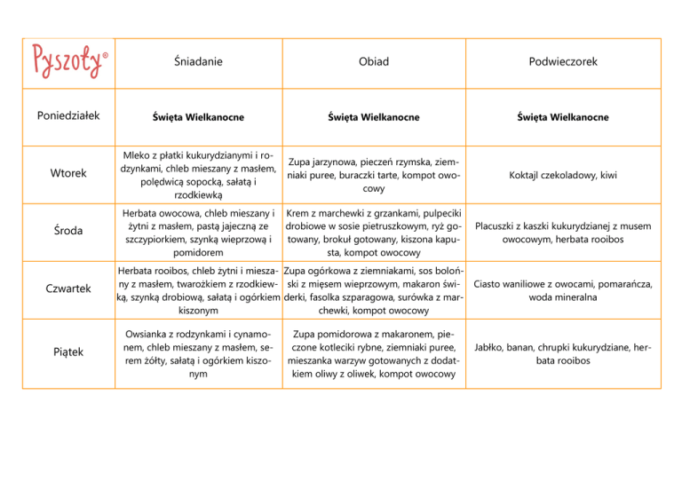 Śniadanie Obiad Podwieczorek Poniedziałek Święta Wielkanocne Święta Wielkanocne Święta Wielkanocne Wtorek Mleko z płatki kukurydzianymi i rodzynkami, chleb mieszany z masłem, polędwicą sopocką, sałatą i rzodkiewką Zupa jarzynowa, pieczeń rzymska, ziemniaki puree, buraczki tarte, kompot owocowy Koktajl czekoladowy, kiwi Środa Herbata owocowa, chleb mieszany i żytni z masłem, pastą jajeczną ze szczypiorkiem, szynką wieprzową i pomidorem Krem z marchewki z grzankami, pulpeciki drobiowe w sosie pietruszkowym, ryż gotowany, brokuł gotowany, kiszona kapusta, kompot owocowy Placuszki z kaszki kukurydzianej z musem owocowym, herbata rooibos Czwartek Piątek Herbata rooibos, chleb żytni i miesza- Zupa ogórkowa z ziemniakami, sos bolońny z masłem, twarożkiem z rzodkiew- ski z mięsem wieprzowym, makaron świ- Ciasto waniliowe z owocami, pomarańcza, ką, szynką drobiową, sałatą i ogórkiem derki, fasolka szparagowa, surówka z marwoda mineralna kiszonym chewki, kompot owocowy Owsianka z rodzynkami i cynamonem, chleb mieszany z masłem, serem żółty, sałatą i ogórkiem kiszonym Zupa pomidorowa z makaronem, pieczone kotleciki rybne, ziemniaki puree, mieszanka warzyw gotowanych z dodatkiem oliwy z oliwek, kompot owocowy Jabłko, banan, chrupki kukurydziane, herbata rooibos